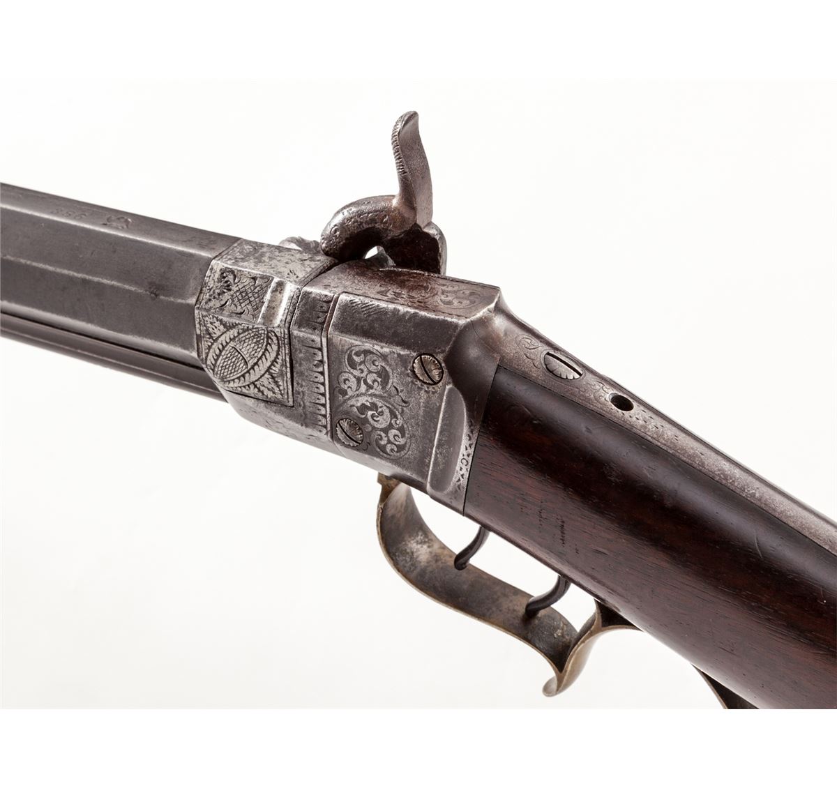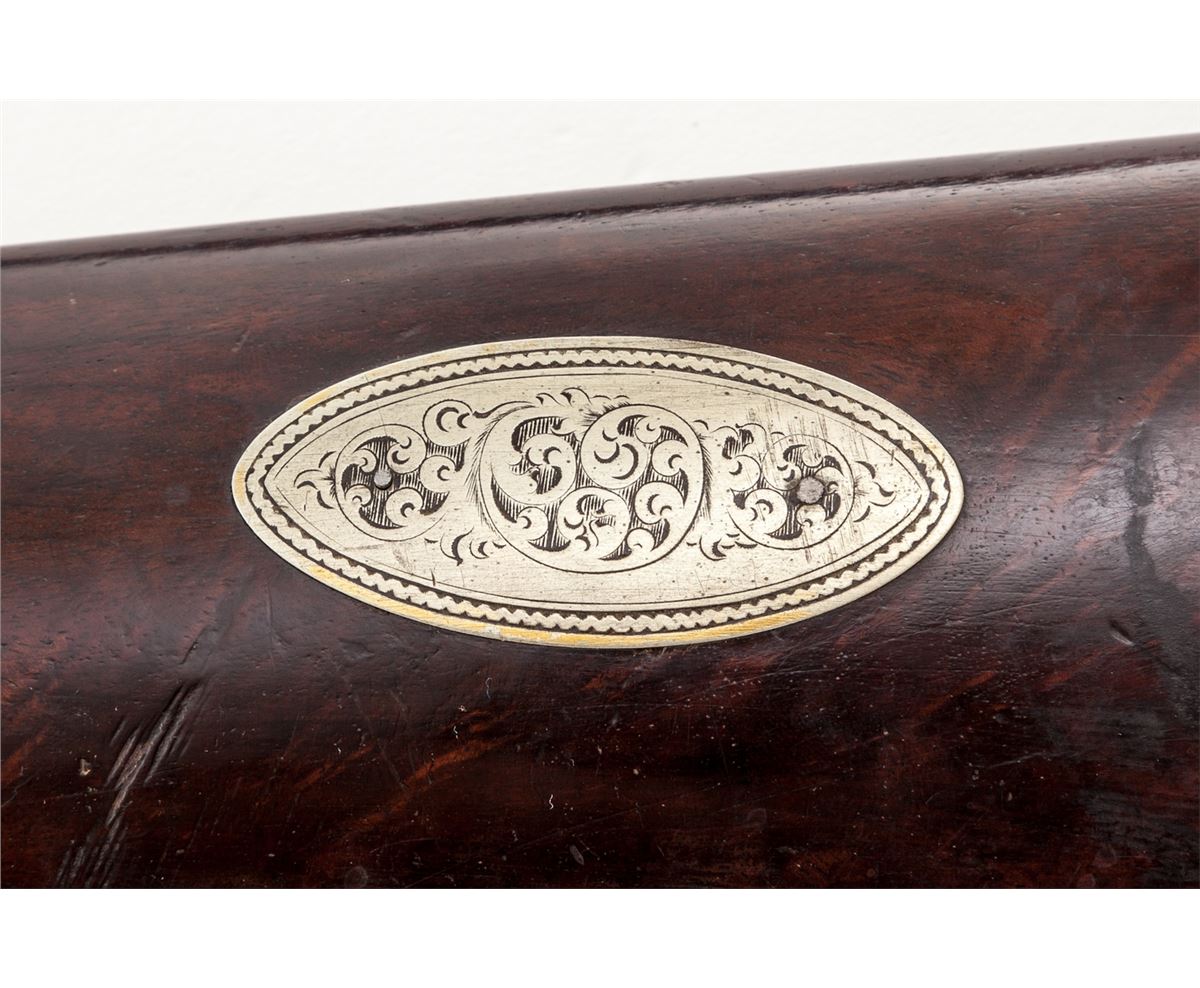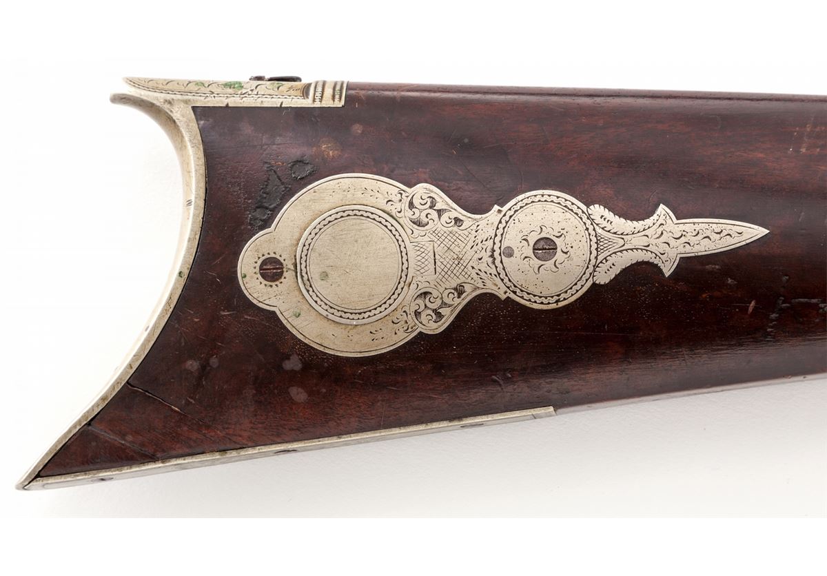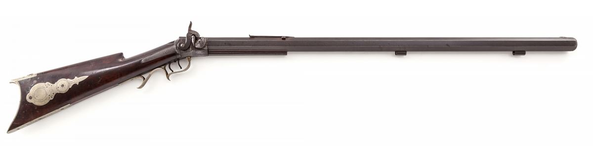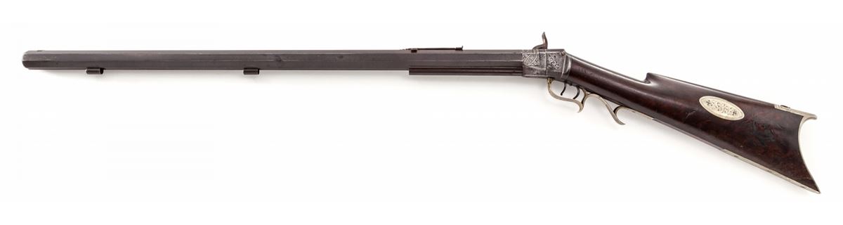 Wesson & Prescott Model 1841 Single Shot Percussion Rifle, #386, .36 cal., 32'' octagonal brown barrel, lightly American engraved action marked ''Wesson & Prescott'', American walnut buttstock, with lightly engraved German silver buttplate, triggerguard, front sight, patchbox and escutcheons. Top of barrel flat behind rear sight marked ''Wesson & Prescott/Northboro/Mass-Cast Steel/386'', with Federal eagles to left and right of barrel legend. Adjustable double set trigger, with port at top of buttplate and on upper tang for various long-range sight applications. Ca. 1835-1840. Edwin Wesson was the brother of Frank and Daniel Wesson and is considered one of the finest makers of this type rifle during this part of the 19th Century. Edwin Wesson was the first to implement the false muzzle system. Condition is very good with moderate patination to both barrel and frame. Beautiful somewhat fancy walnut buttstock with two small fractures near toe from shrinkage over time. Stock also shows small loss behind hammer to forward right portion of upper tang. Nickel silver furniture with light patination. Double set trigger functions as designed. Rear sight may be a later replacement and lacks elevator blade. Coined edge of muzzle shows minor scuffs and thinning. Ramrod is missing. Est.: $1,800-$2,200. (Antique)