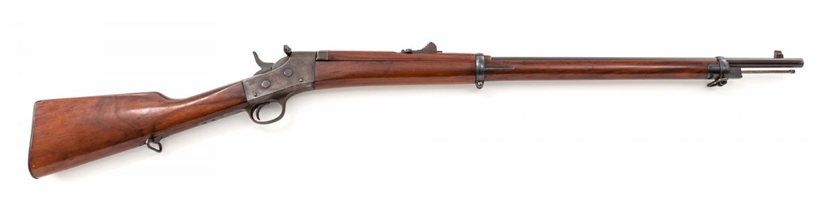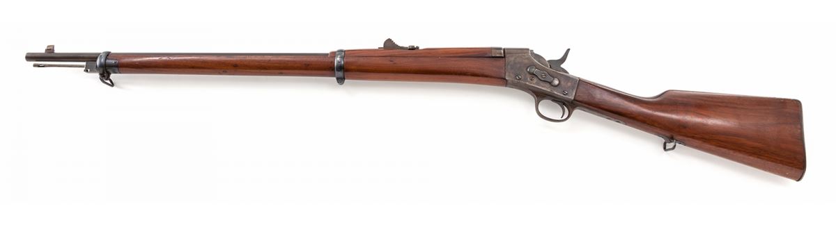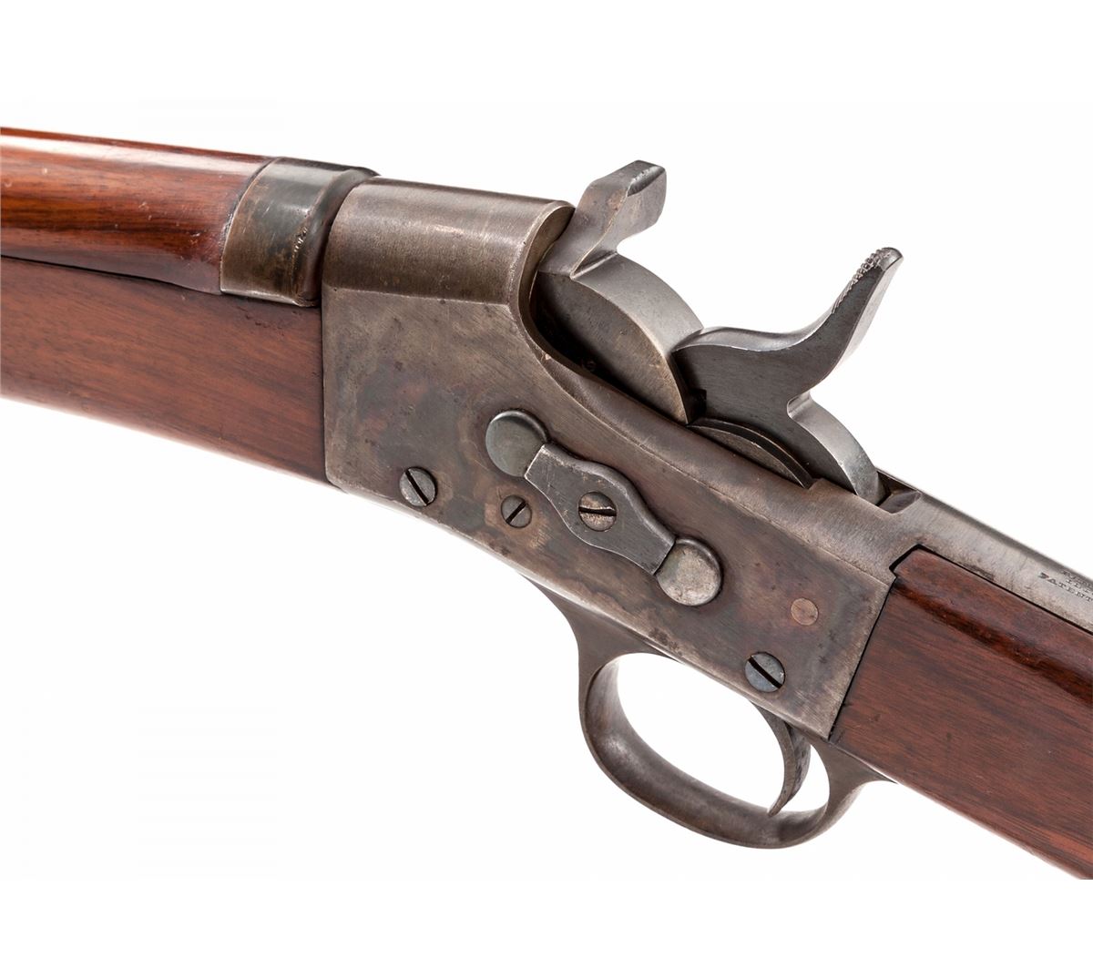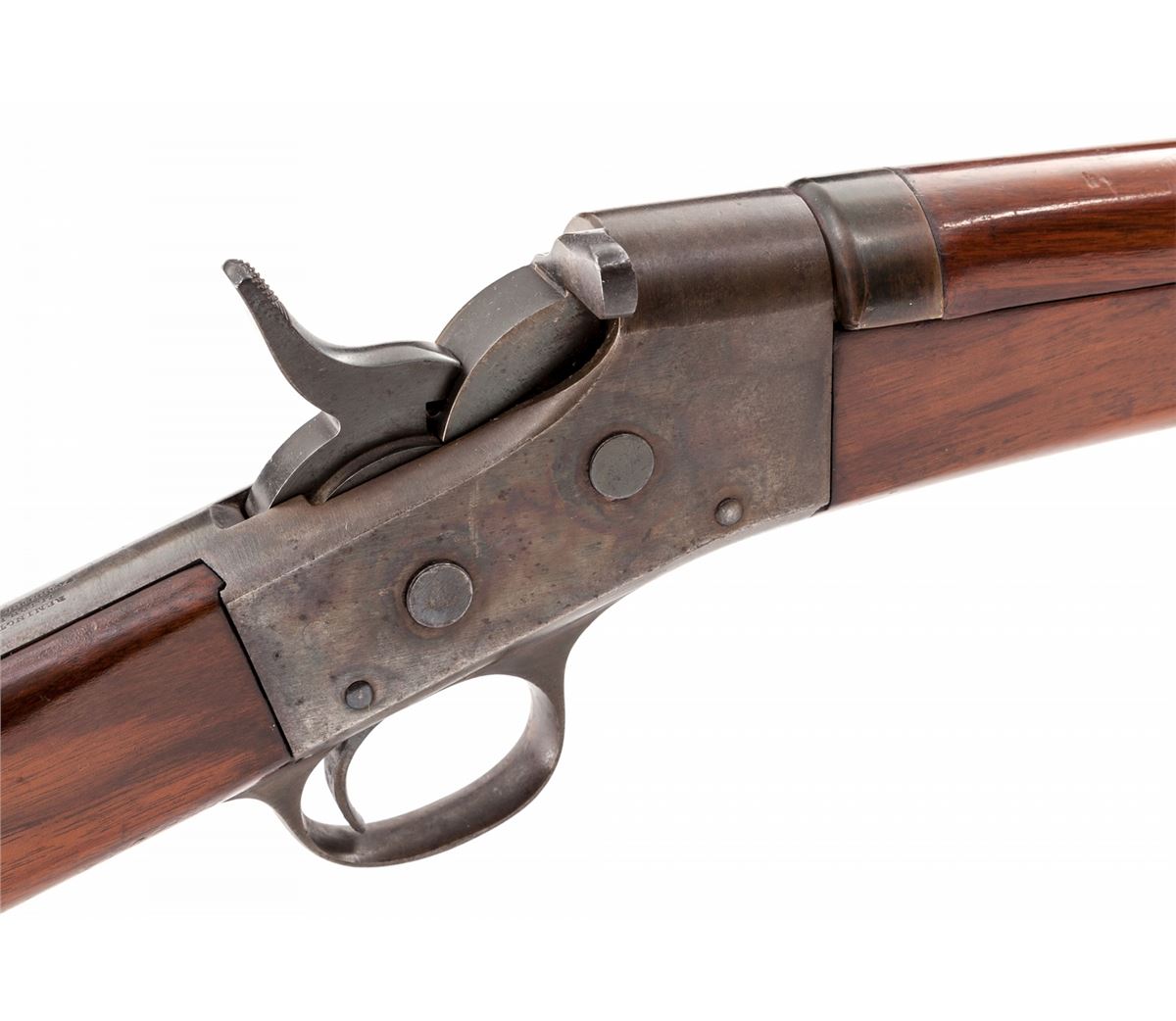 Remington Rolling Block Single Shot Rifle, NVSN, 7mm, 30'' barrel, blue and case hardened finish, walnut stock and handguard. Condition is excellent retaining approx. 92% lightly toning blue, and vivid case colors to frame and breechblock. Stock may have been lightly sanded with additional varnish added at one point. Action is good, bore is fine. Est.: $750-$1,000. (Antique)