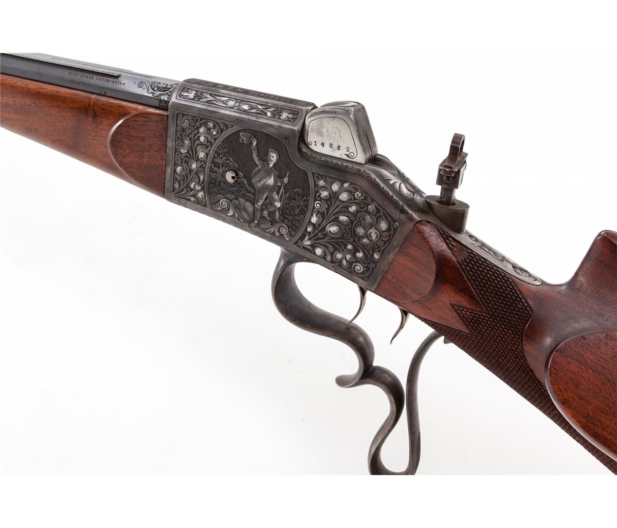 Fine Schuetzen Single Shot Rifle, by Pistor & Kost, #14682, 8.15x46R cal., 32'' blue octagon barrel, with finely engraved Jaeger scenes to both sides of frame, case hardened finish to frame, lever, lower tang, and Swiss style buttplate; double set triggers, with protected pin-tip front sight and adjustable peep sight; high cheekpiece checkered Schuetzen buttstock with plain Schnauble tipped forend. Bottom of barrel with ''BUG'' proofmarks, and marked ''7.5M/M'' underneath forend. Matted top barrel flat marked ''Pistor & Kost, Schmalkalden''; top of frame marked in silver ''DRGM No. 919406''. Mfg'd approx. 1923. Condition is excellent showing light thinning to blue at highpoints of barrel flats, 98% vivid case hues. Stock with minor scuffs and one 2'' gouge near lower tang beneath cheekpiece (detracts little). Eyepiece to rear sight is missing. Action remains crisp, set trigger functions correctly, and bore is bright. Est.: $2,500-$3,500. (C&R)
