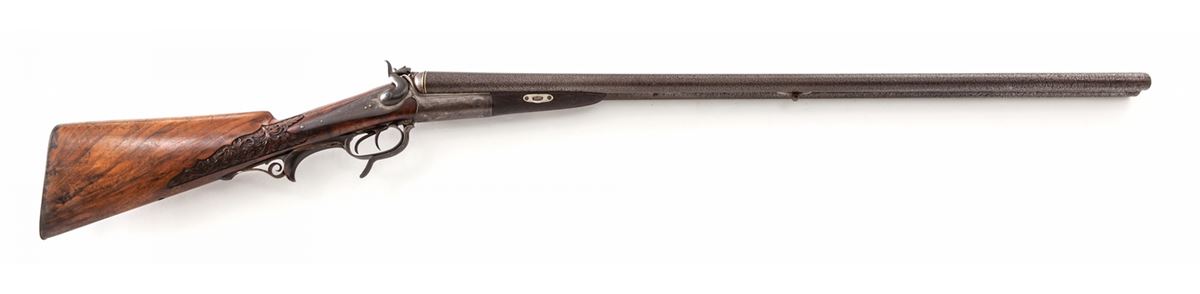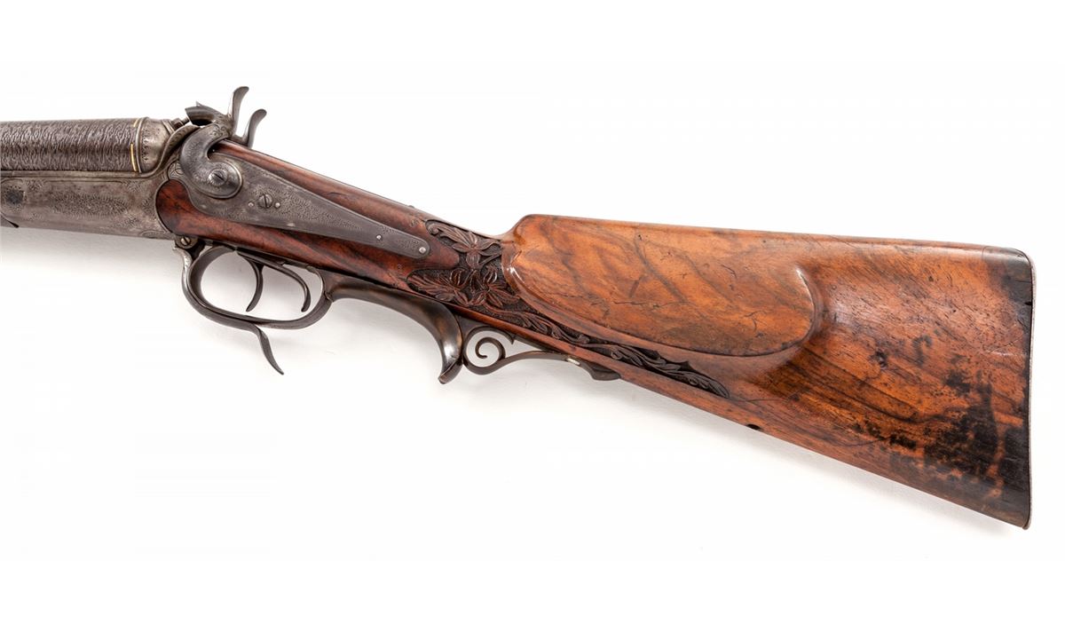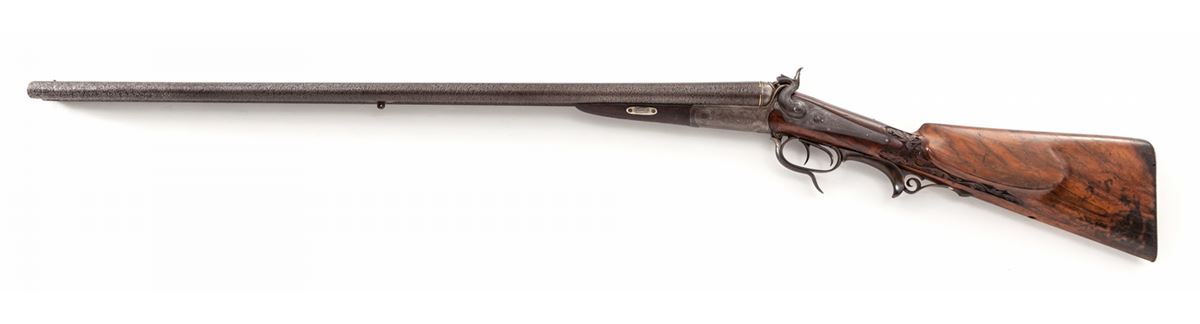 Vaclav Dostal Bohemian Under Lever Side-by-Side Hammer Shotgun, NVSN, 12 ga., 2-1/2'' chambers with undersized bores beginning at the forcing cone measuring .664'' (16 ga.), case-colored finish, 31'' decorative acid-etched Damascus pattern barrels with flat rib and front brass bead, back-action locks with rebounding hammers, double triggers, extractor, 75% coverage fine scroll engraving with gold barrel bands and gold inlaid rib at breech horn triggerguard extension, walnut stock with hunting cheekpiece and light vine carving at wrist, with coarsely checkered wedge forend. Length of pull is 13-3/4'' over an etched metal buttplate inscribed ''Josef Vosmer Sruc 31/12.1884''; weight is 7-3/4 lbs. Overall condition appears fine with few indications of firing, locks are preserved with strong mainsprings, action is tight, bores are bright. Original finish has worn to a gray-brown patina with light oxidation. Stock has shrinkage and mild cracking along the grain with aged scuffs and scratches, forend is worn with wedge pin lodged in place, horn triggerguard extension and lower screws need restoration, missing rear sling swivel. Serial number and proofmarks on barrel flats are obscured by the etching pattern. Not for use with modern ammunition. Est.: $800-$1,200 (Antique)