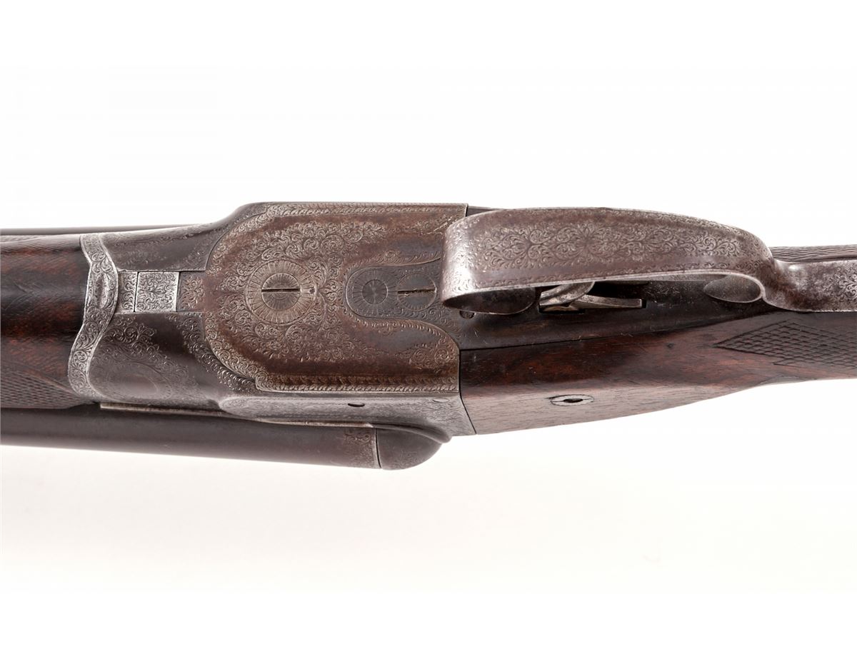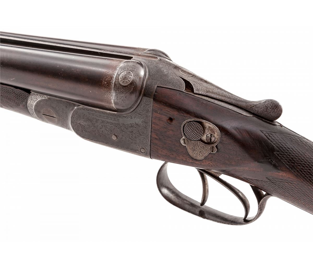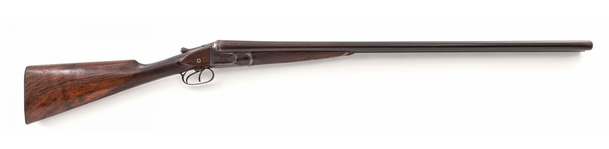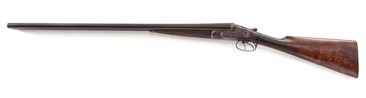Antique Greener Side-by-Side Shotgun, #20996, 12 ga., 2-5/8'' chambers, 28'' brown game rib damascus barrels with one German silver bead, marked ''W.W. Greener, 68 Haymarket, London, Winner at the London Gun Trials 1876, 1877, 1878 & 1879'', choked Full/IM; boxlock frame, tightly banknote scroll engraved, with panels to both sides inscribed ''W.W. Greener''; slender wrist offset checkered straight stock, and fine English walnut splinter forend with horn tip. Mfg'd approx. 1881. Condition is very good. Barrels show evidence of re-blacking, and both sling swivels have been removed. Receiver with additional English blue over original case hardened frame. Stock with light to just moderate scuffs with near heavy flattening to checks and one significant ding just forward of safety area. Action is mostly tight, bores are fair to good with some mild pitting and light dings midway down. Est.: $750-$1,000. (Antique)