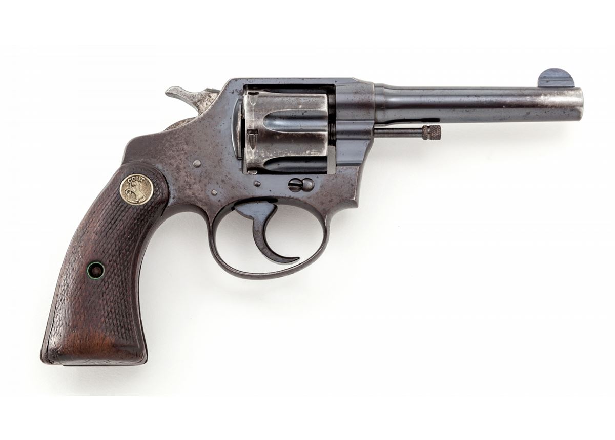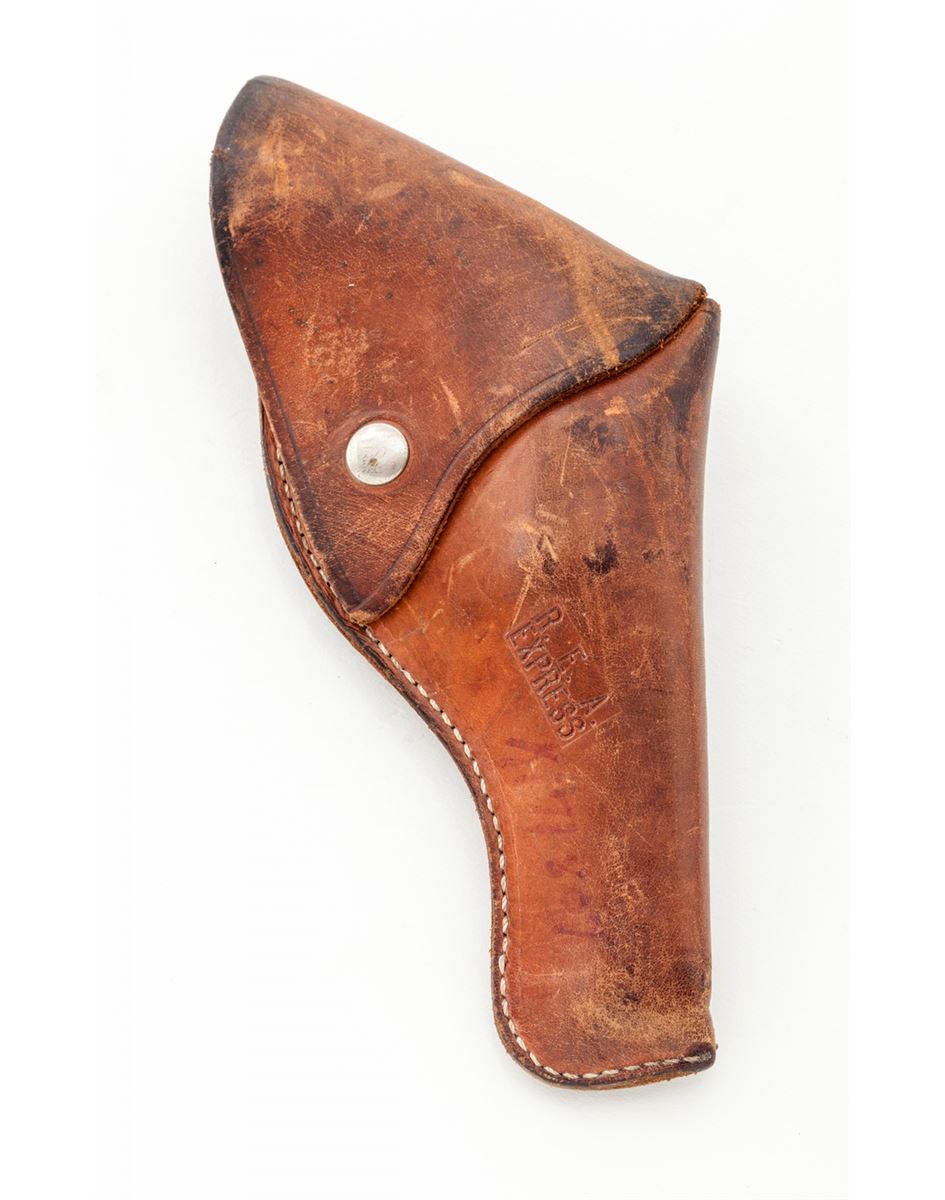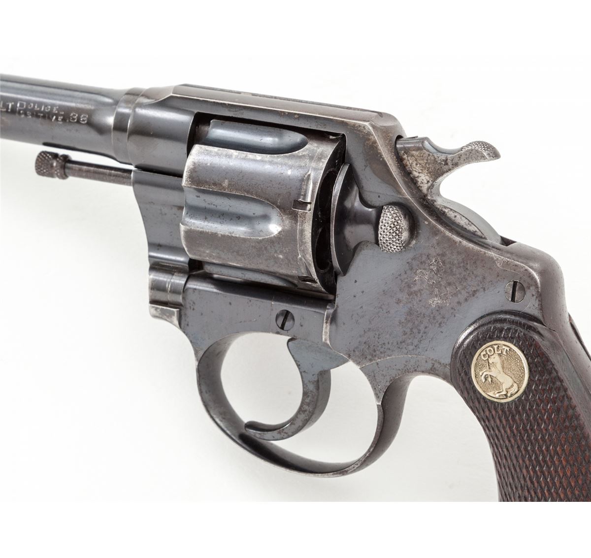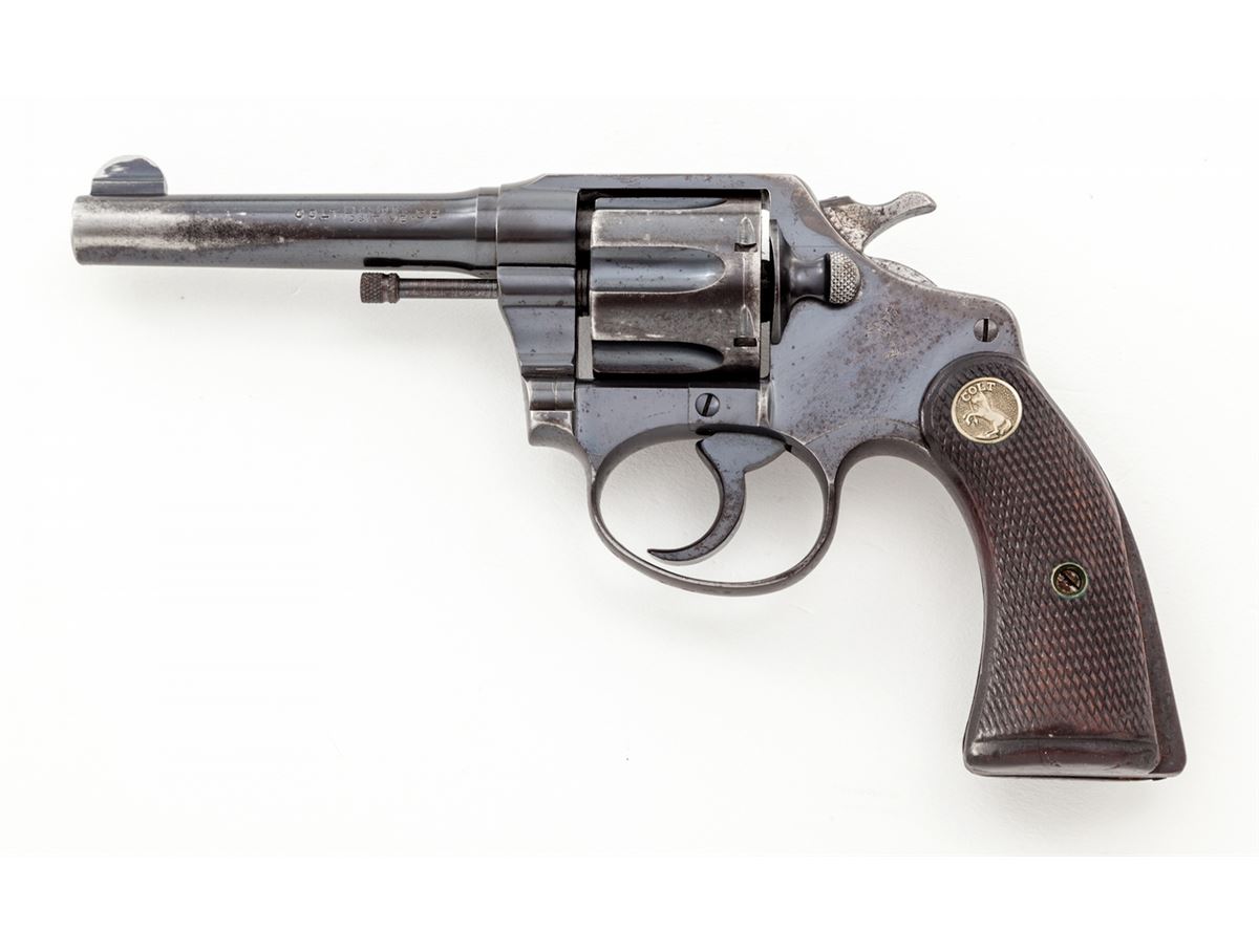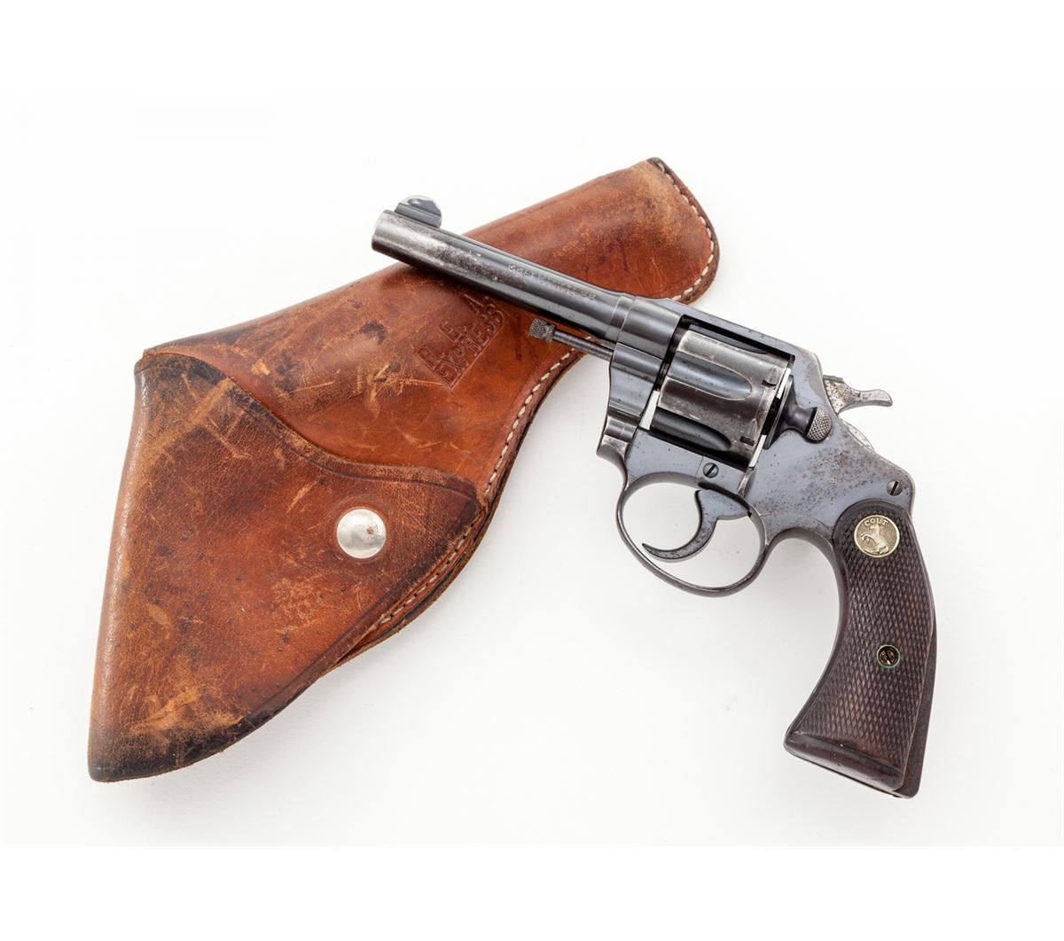 American Railway Express marked Colt Police Positive Double Action Revolver, #171807, .38 Colt cal., 4'' barrel, blue finish, factory checkered walnut grips with Colt medallions. Backstrap marked ''Am. Ry. Exp.''. In original ''R.E.A./Express'' marked holster. With factory letter verifying all features including markings to backstrap. As shipped to S.A. Erd, Superintendent, American Railway Express Co., Chattanooga, Tennessee, Jan. 12, 1926. Condition is very good retaining approx. 80%-85% original blue. Left panel with missing sliver at backstrap; right panel shows slight flattening. Action and bore are good. Holster with scuffs and oil darkening; serial number of pistol written in pen and ink to inside flap. Est.: $500-$750. (C&R)