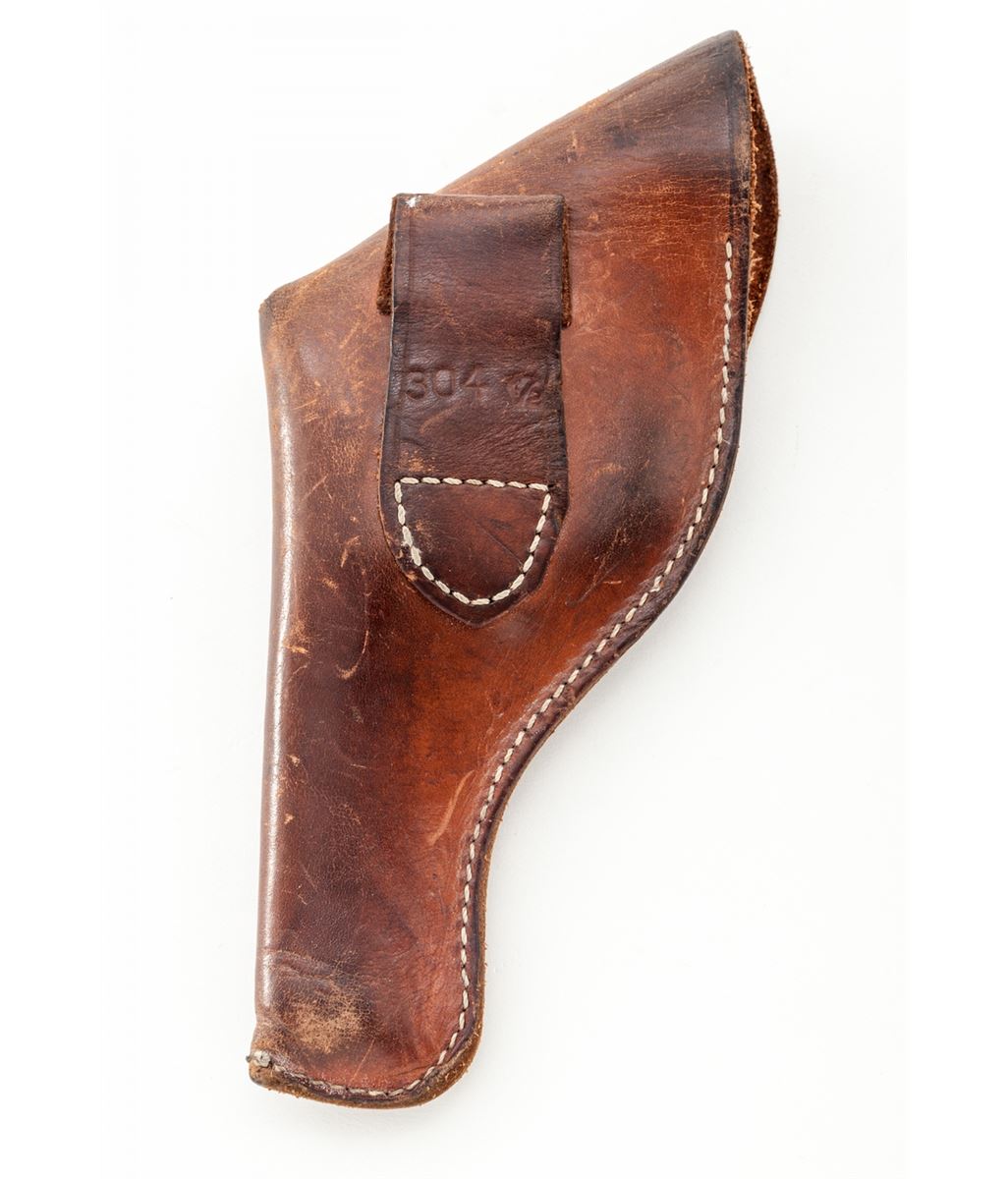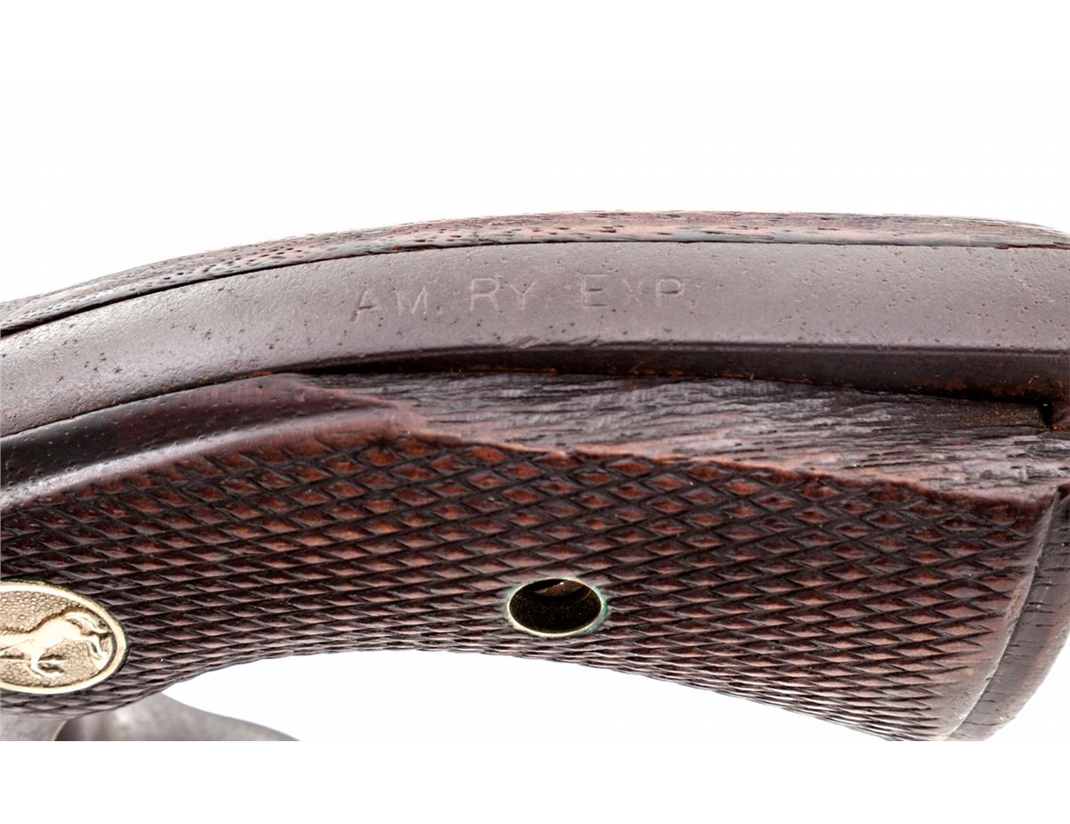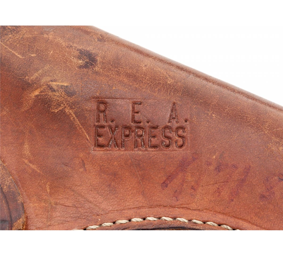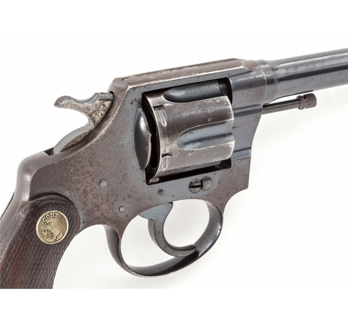 American Railway Express marked Colt Police Positive Double Action Revolver, #171807, .38 Colt cal., 4'' barrel, blue finish, factory checkered walnut grips with Colt medallions. Backstrap marked ''Am. Ry. Exp.''. In original ''R.E.A./Express'' marked holster. With factory letter verifying all features including markings to backstrap. As shipped to S.A. Erd, Superintendent, American Railway Express Co., Chattanooga, Tennessee, Jan. 12, 1926. Condition is very good retaining approx. 80%-85% original blue. Left panel with missing sliver at backstrap; right panel shows slight flattening. Action and bore are good. Holster with scuffs and oil darkening; serial number of pistol written in pen and ink to inside flap. Est.: $500-$750. (C&R)
