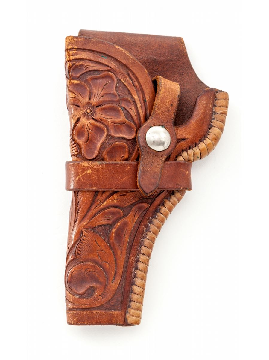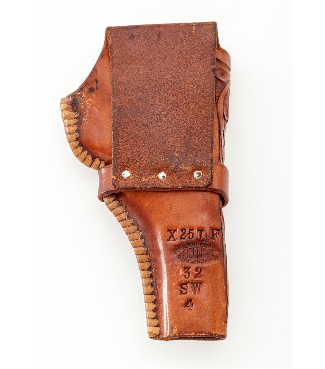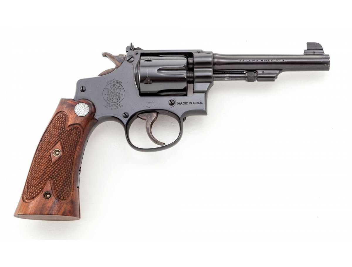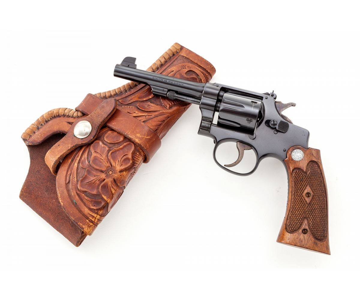 Beautiful Pre-War Smith & Wesson .22/.32 Kit Gun, #533326, .22 LR cal., 4'' barrel, blue finish, optional factory target grips, adjustable rear sight and Patridge blade front sight. In original box with exceptional hand-tooled Geo. Lawence steerhide leather left-handed holster. This revolver was originally shipped Nov. 10, 1939, to Harper & Reynolds Co., 152 N. Main St., Los Angeles, CA, with all features verified by factory letter. Condition is excellent retaining approx. 98%+ original factory blue with very light wear at muzzle, index line to cylinder, and very light micro-scratching to flat sides of frame. Grips are crisp, dual grip screws with very light corrosion that should clean easily. Action is good, bore is bright. Box is numbered to the gun with separation to one of the front side edges of lid. Holster remains in excellent condition showing minor separation near rear sight area. Est.: $3,500-$5,000. (C&R)