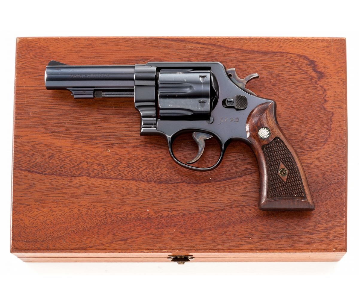 San Francisco Police Dept. marked Smith & Wesson Model 58 Double Action Revolver, #S259762, .41 mag. cal., 4'' barrel, blue finish, factory checkered walnut grips, case colored hammer and trigger, early diamond escutcheon grips and pinned barrel. Dating from approx. 1965. In slightly later mahogany case with cleaning accessories and original instructions. ''S.F.P.D.'' neatly engraved just below cylinder latch. Condition is excellent showing just light scuffs to sides of cylinder and minor wear at muzzle. Grips show minor flattening. Action remains crisp, bore is excellent. Est.: $1,200-$1,800. (Modern/PPT)