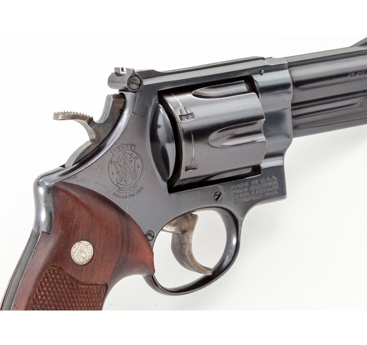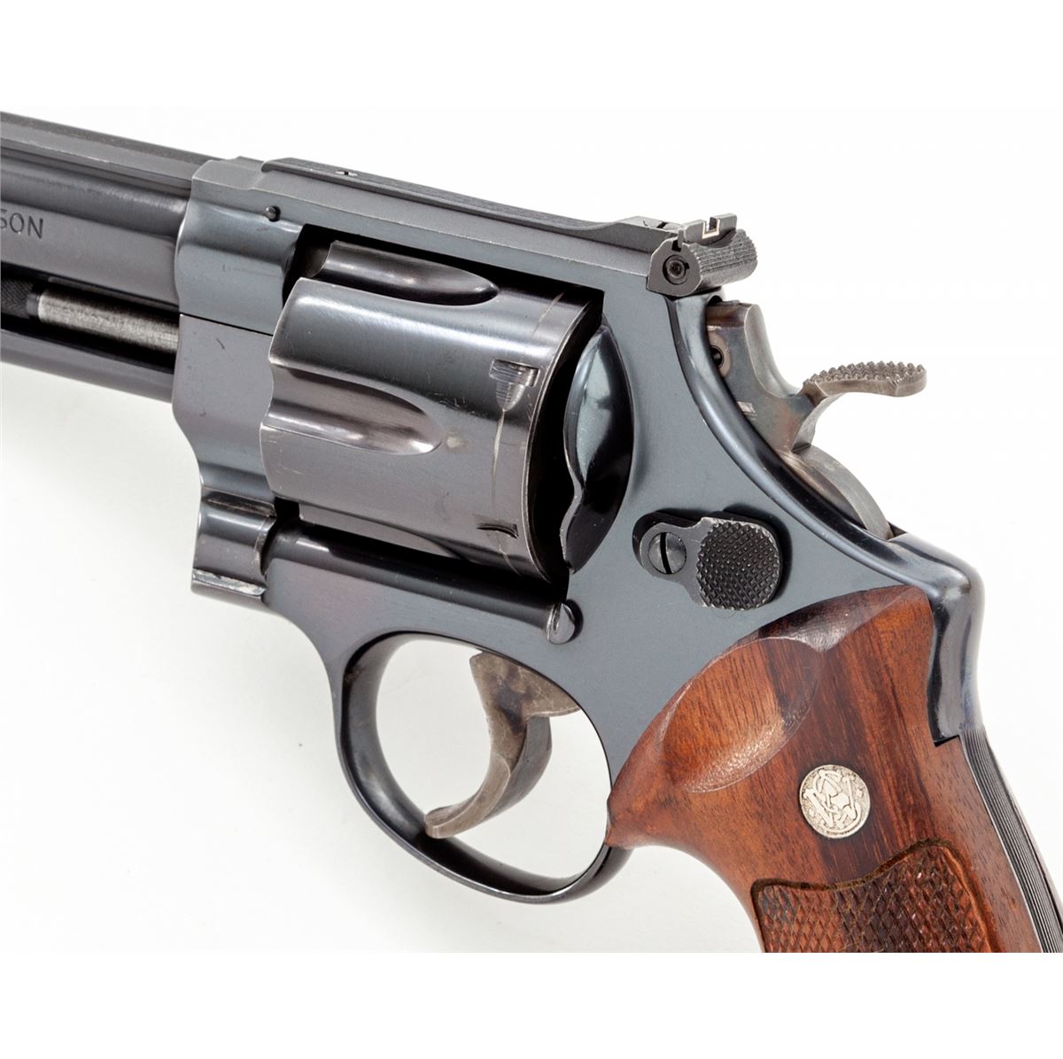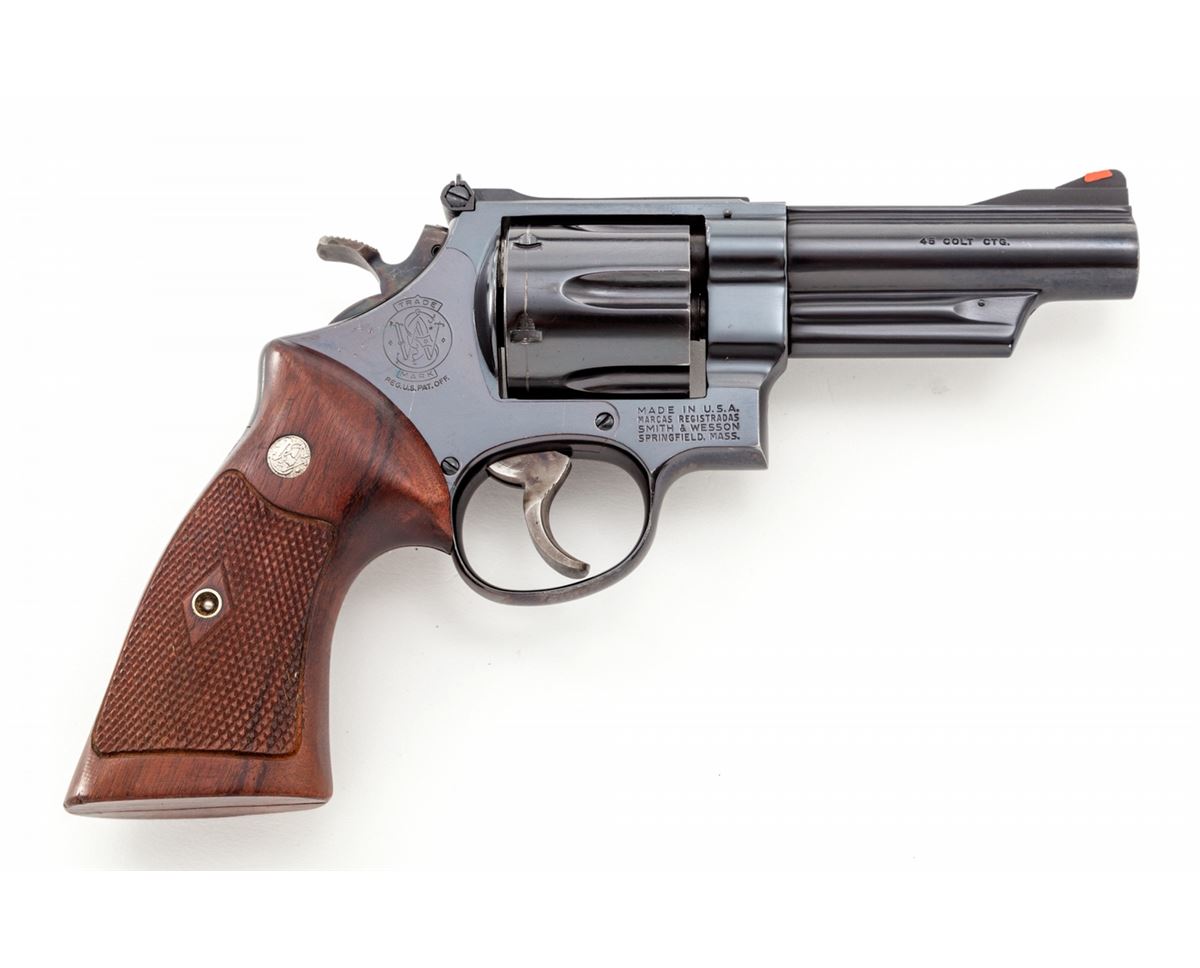 Smith & Wesson Model 25-5 Double Action Revolver, #N657227, .45 Colt cal., 4'' barrel, blue finish, with somewhat earlier S&W factory checkered walnut grips with large diamond escutcheons. Target trigger, target hammer, red ramp front sight and white outline rear sight, with pre-1981 pinned barrel. Condition is excellent retaining approx. 97%+ original finish, with most of the losses as thinning and index mark to cylinder. Some very minor pinprick pitting on sideplate. Action is crisp, bore is bright. Est.: $600-$800. (Modern/PPT)