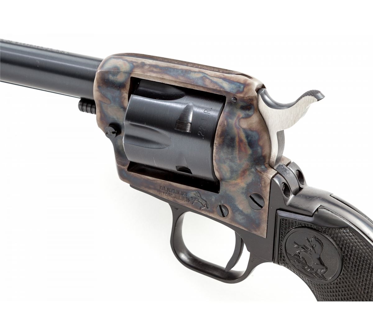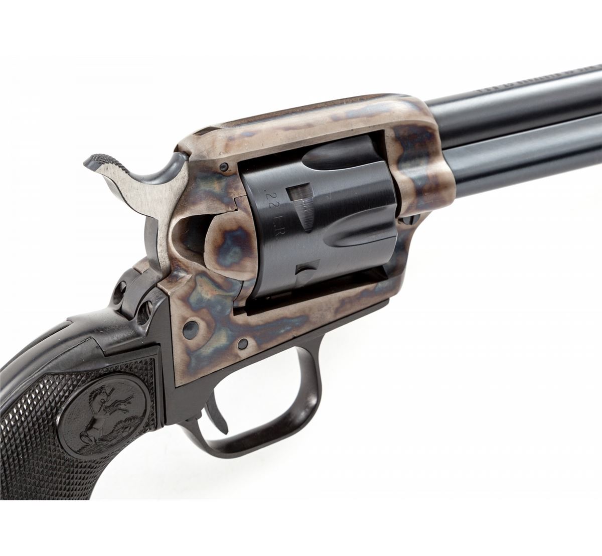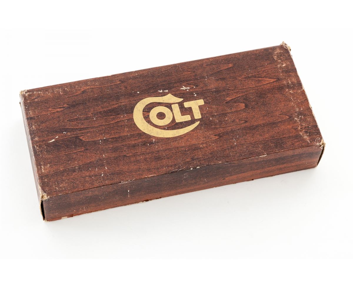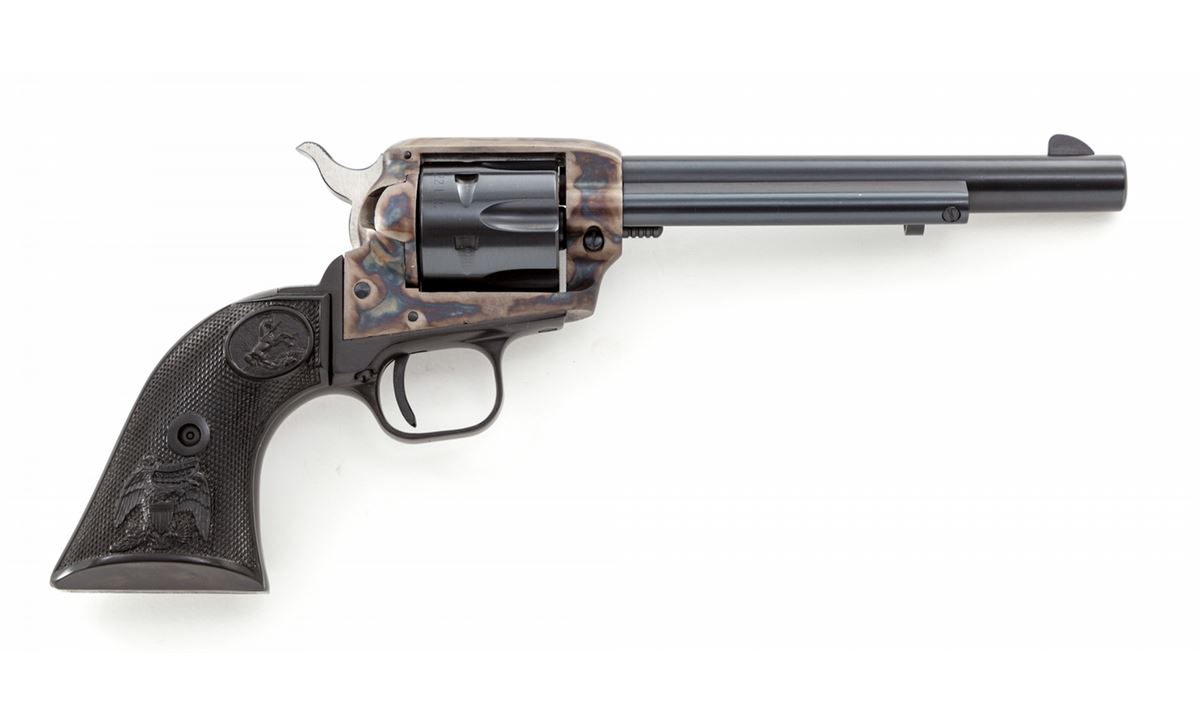 Colt Peacemaker Single Action Revolver, #G191647, .22 LR/.22 mag. cal., 6'' barrel, blue and case hardened finish, factory black plastic checkered American eagle grips. Condition is excellent, appearing as new with one small scratch on the .22 LR cylinder, in original box. Box with tatters and tape repairs. Est.: $500-$750. (C&R/PPT)