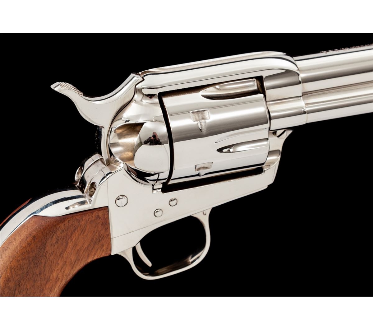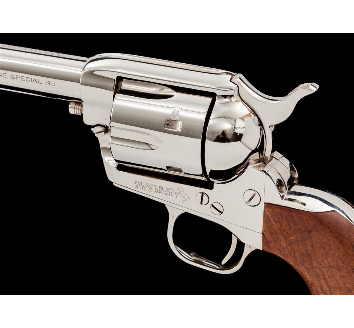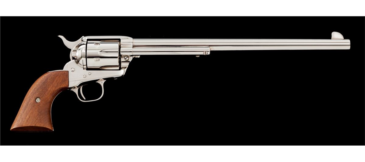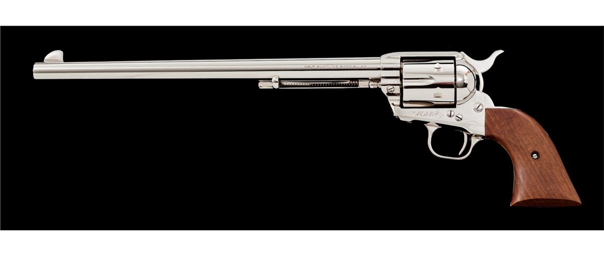 3rd Generation Colt Buntline Special Single Action Revolver, #SA40161, .45 cal., 12'' barrel, nickel finish, two-piece walnut grips. Condition is excellent showing only the lightest marks from handling and virtually no index mark to cylinder. Grips are crisp, bore is bright. Box is from an earlier firearm, with instructions. Est.: $1,500-$2,000. (C&R)