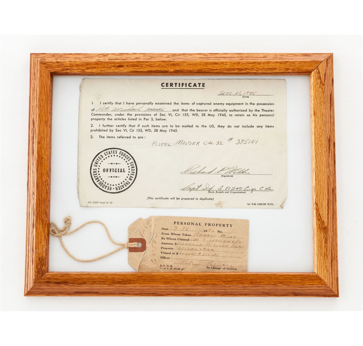 Standard Wartime Commercial C96 Mauser Semi-Automatic Pistol, #375101, 7.63mm, 5-1/2'' barrel, blue finish, 30-groove walnut grips, with ''New Safety'' markings to back of hammer. Although mfg'd sometime during WWI, pistol comes complete with WWII era capture documents, dated Sept. 21, 1945, where this pistol is mentioned by serial number. In addition to this document, a 1946 personal property hang tag is included. Condition is fine retaining approx. 94% original lightly thinning blue. Grips with light scuffs and minor impressions. Action is crisp, bore is very good. A nice early 20th Century ensemble. Est.: $1,200-$1,800. (C&R/PPT)