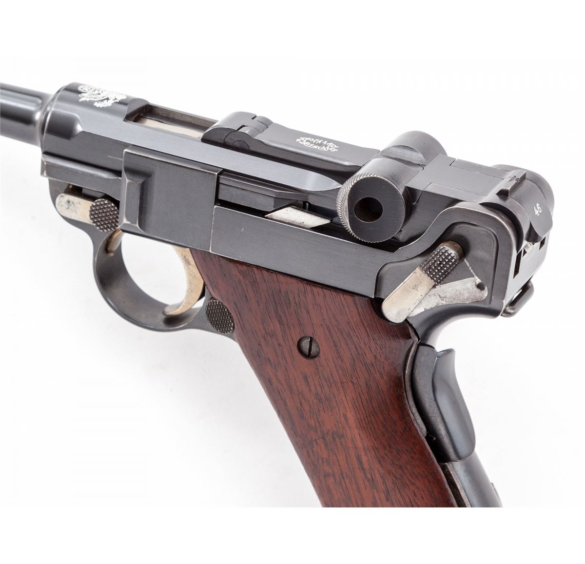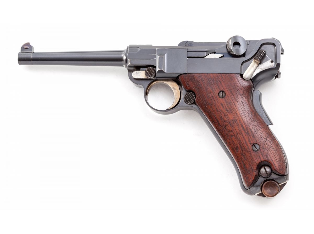 American Eagle 1900 Luger, #7846, .30 Luger cal., 4-3/4'' barrel, blue finish with straw small parts, smooth walnut Ideal grips with spacers for Ideal combination holster/stock (not included), and one unmarked nickel-plated magazine with walnut base. Pistol additionally features checkered thumb safety lever, scalloped toggle knobs, grip safety, American eagle of chamber, and DWM to toggle link. Condition is excellent retaining approx. 97% lightly thinning blue. Grips with minor scuffs. Thinning to finish on thumb safety. Action is crisp, bore is bright. Est.: $2,500-$4,000. (C&R/PPT) (John Siroonian estate)