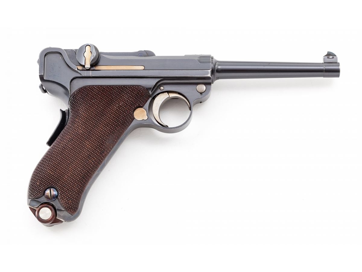 Swiss Model 1900 Military Luger, #3083, .30 Luger cal., 4-3/4'' barrel, blue finish with straw small parts, factory checkered walnut grips, one nickel-plated wood base magazine with metal inserts. Cross and sunburst inscription above chamber, DWM marked toggle, serrated thumb safety, lower portion of safety area polished bright, left side of upper receiver marked with large format ''P'' and 28, indicating that this gun was released from military service in 1928. Condition is excellent retaining approx. 97% blue with minor thinning to highpoints of sideplates, and light micro-scratching to left receiver flat and front strap. Grips remain crisp with just minor flattening and some oil darkening. All visible matching small parts. Action is good, bore is mirror bright. Est.: $3,000-$5,000. (C&R)