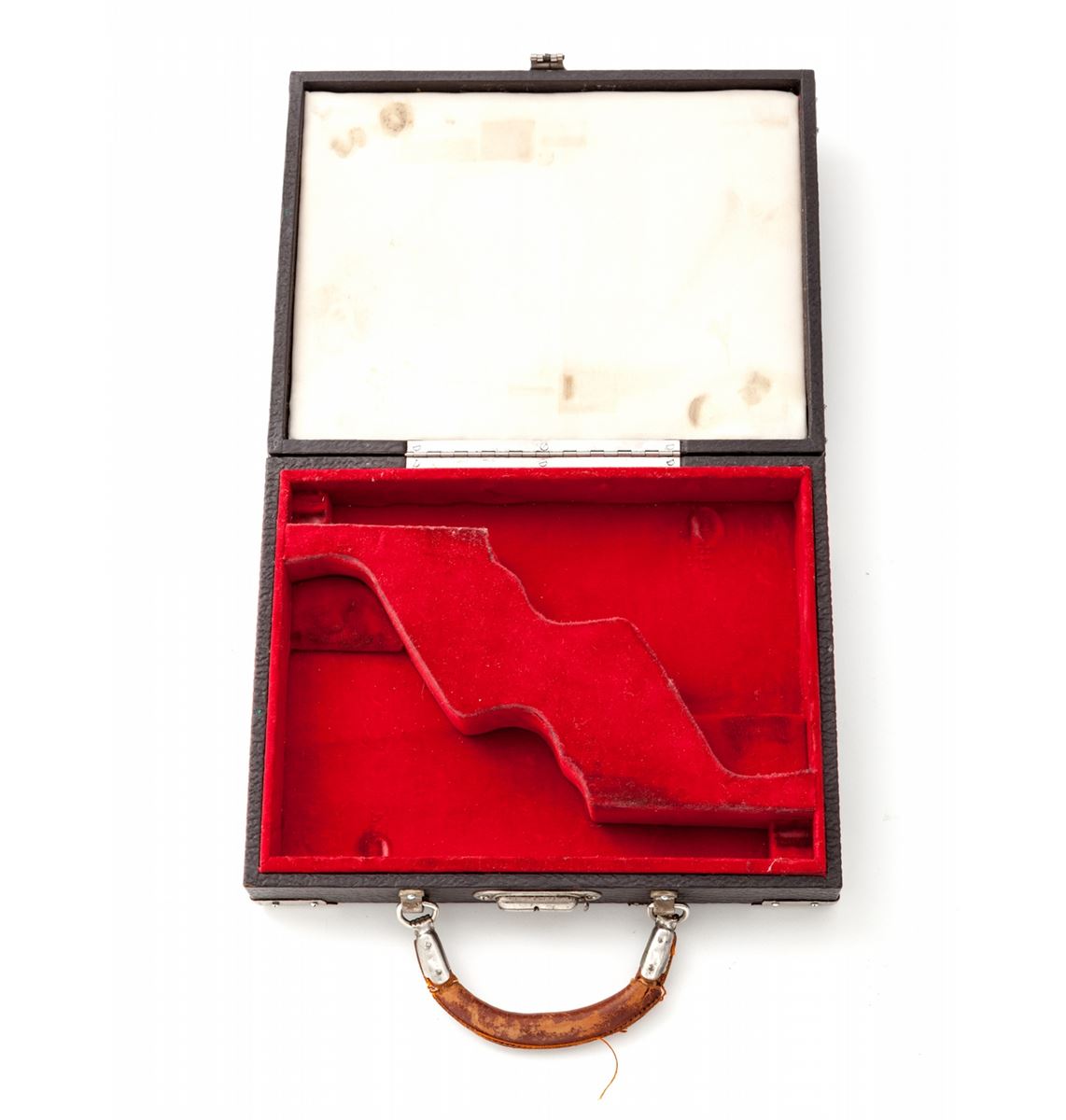 Early 20th Century .30 Cal. Luger Presentation Case, with silver oval marked at top of lid ''Oberst/Louis Von Sturler''. Case measures 8''x10-1/4''x2'' and is covered in a faux buffalo hide, with nickel-plated end caps, early 20th Century locking hardware, and a lightly colored Cordovan handle. Interior is French fitted in red velour for two 4-3/4'' Luger Semi-Automatic Pistols and probably originally mfg'd for Swiss type guns, such as Model 1900s, 1906s/24s, having 4-3/4'' barrels. The Von Sturler name shows in several references pertaining to Swiss infantry regiments from the Bern area. Condition is fine. Exterior of case shows only light discoloration to forward top edge of lid. Shoe leather handle with splits, losses and separation of thread. Interior with soiling to white lid and red fabric. Case shows very well when pistols are present. Est.: $800-$1,200.