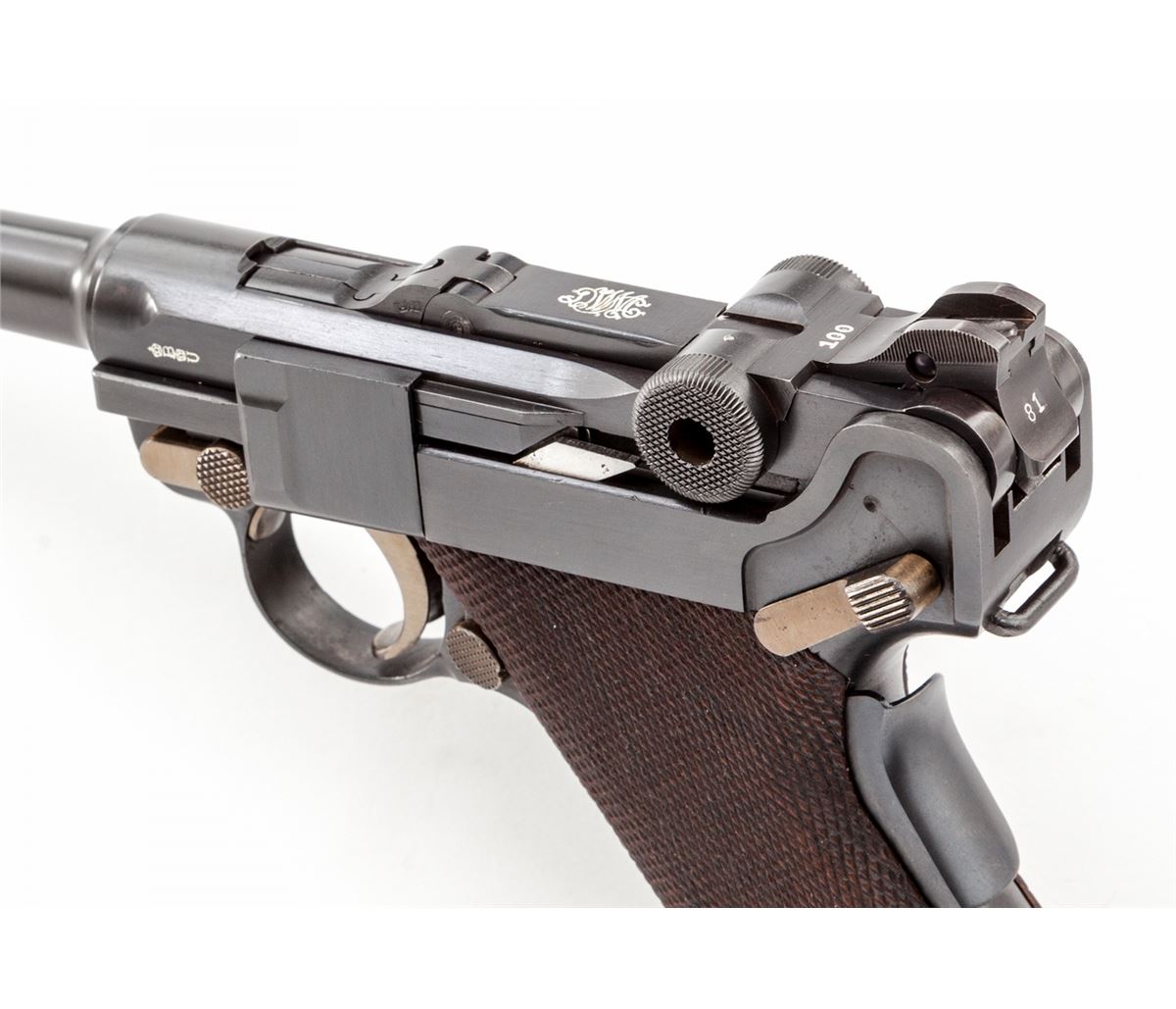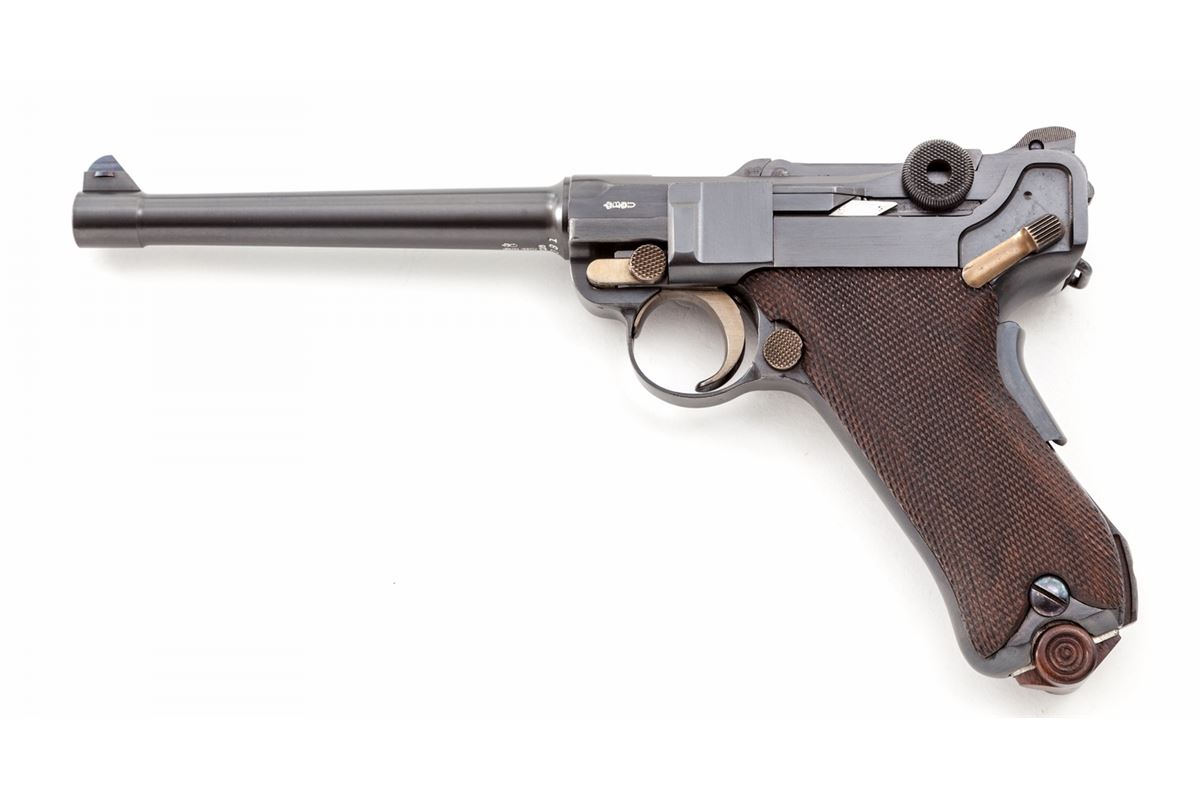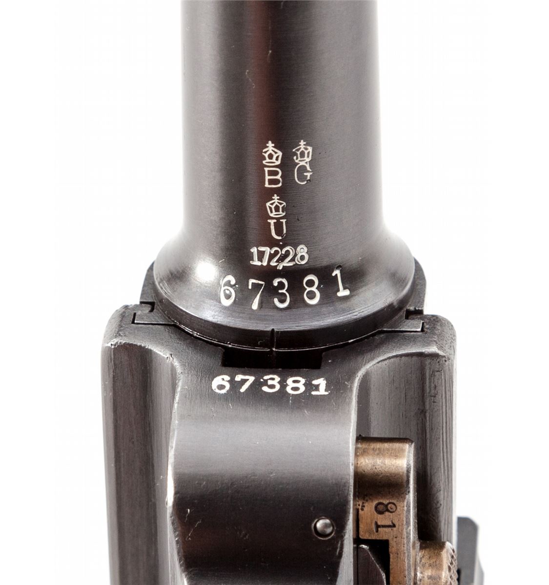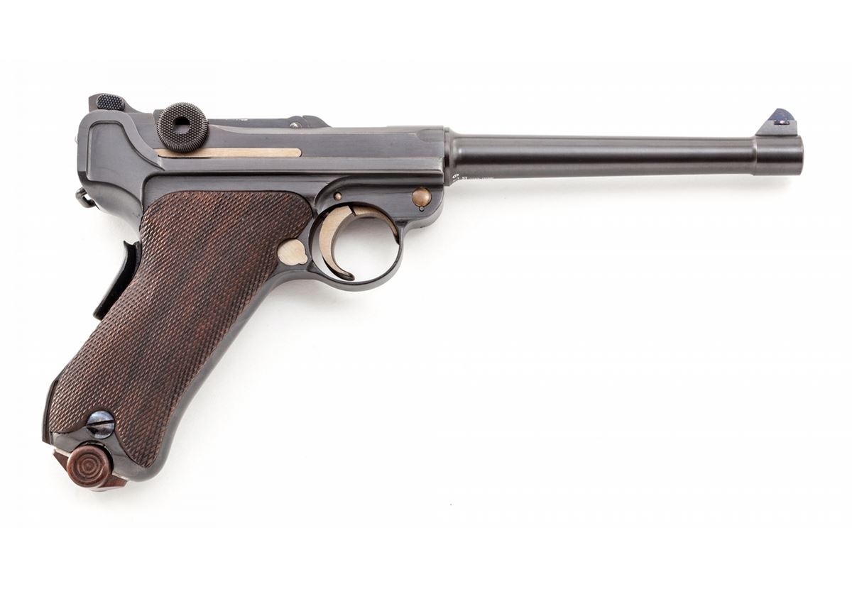 1906 Navy Commercial Luger, #67381, 9mm, 6'' barrel, blue finish with straw small parts, factory checkered walnut grips, and one unmarked nickel-plated wood based magazine with concentric circles to base. Blank chamber, DWM marked toggle link, lower portion of thumb safety marked ''Gesichert'', standard ''Geladen'' marked extractor, and BUG commercial proofmarks, Considered scarce with approx. 3000 mfg'd. Condition is excellent with at least some added rust and straw blue, retaining approx. 99% finish. Grips and action are crisp, bore is fine. All visible matching numbers. Est.: $4,500-$6,000. (C&R/PPT) (John Siroonian estate)