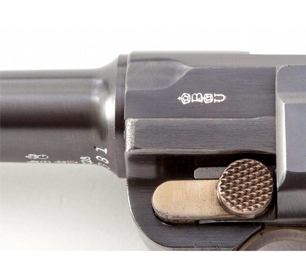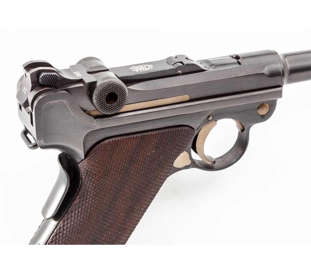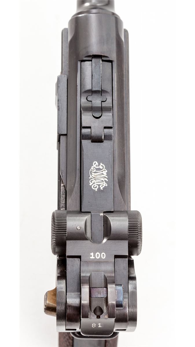 1906 Navy Commercial Luger, #67381, 9mm, 6'' barrel, blue finish with straw small parts, factory checkered walnut grips, and one unmarked nickel-plated wood based magazine with concentric circles to base. Blank chamber, DWM marked toggle link, lower portion of thumb safety marked ''Gesichert'', standard ''Geladen'' marked extractor, and BUG commercial proofmarks, Considered scarce with approx. 3000 mfg'd. Condition is excellent with at least some added rust and straw blue, retaining approx. 99% finish. Grips and action are crisp, bore is fine. All visible matching numbers. Est.: $4,500-$6,000. (C&R/PPT) (John Siroonian estate)