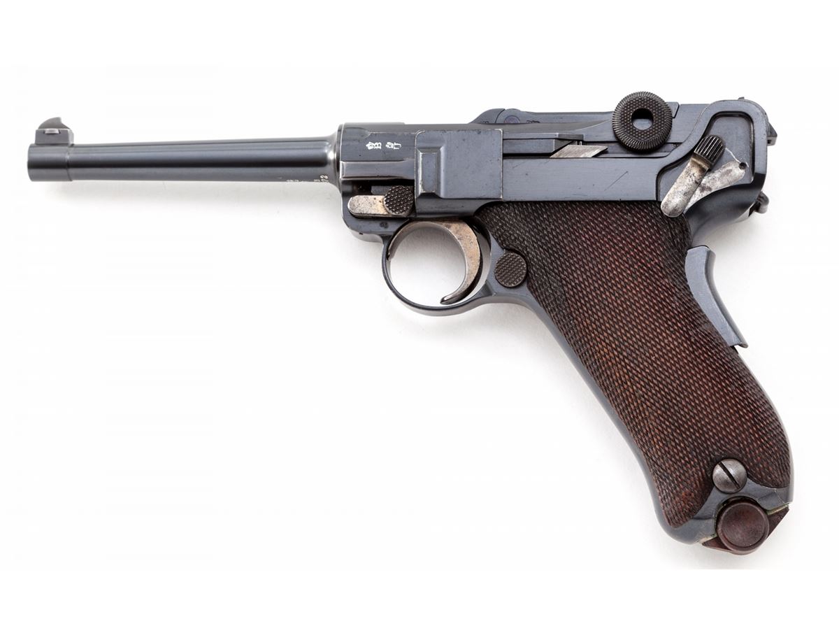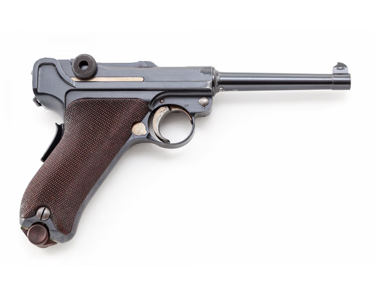 Rare French marked 1906 Commercial Luger, #45872, .30 Luger cal., 4-3/4'' barrel, blue finish with straw small parts, factory checkered walnut grips, and one unmarked nickel-plated magazine with wood base. Top of barrel marked ''Manufacture Francaise d'Armes and Cycles de Saint-Etienne'', chamber is blank, toggle marked DWM, serrated safety with lower portion polished bright. Extractor marked ''Geladen'', with BUG proofmarks. These pistols are considered quite scarce with less than ten known. Condition is excellent retaining approx. 98% lightly thinning blue. Straw parts show carbon spotting and thinning at high edges, more pronounced at thumb safety. Grips with mild flattening and oil darkening. Action is crisp, bore is fine. Est.: $4,000-$6,000. (C&R/PPT) (John Siroonian estate)