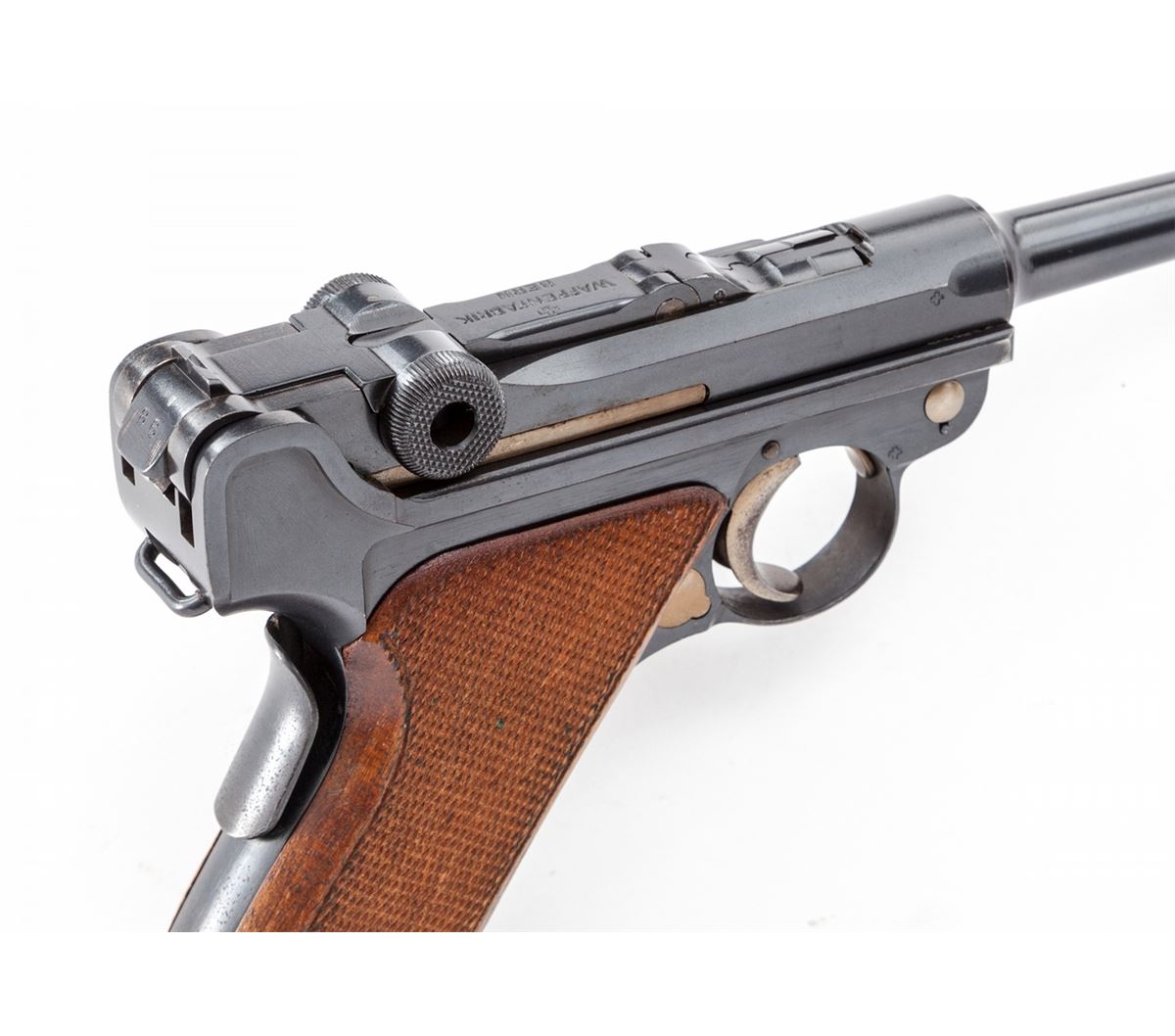 Swiss Model 06/24 Luger, #18986, .30 Luger cal., 4-3/4'' barrel, blue finish, straw small parts, checkered walnut with smooth bordered grips, with one correct unmarked wood base nickel-plated magazine. Considered uncommon with blank chamber area, toggle marked ''Waffenfabrik/Bern'', lower portion of safety area is polished bright. Condition is excellent retaining approx. 97% original blue, and additionally later marked just above triggerguard ''P43'', with very minor thinning to high edge of sideplate and at muzzle. Near imperceptibly import marked to right side bottom frame rail. Grips remain crisp. Grip screws have toned. All visible matching small parts. Action is good, bore is mirror bright. Est.: $1,800-$2,400. (C&R)