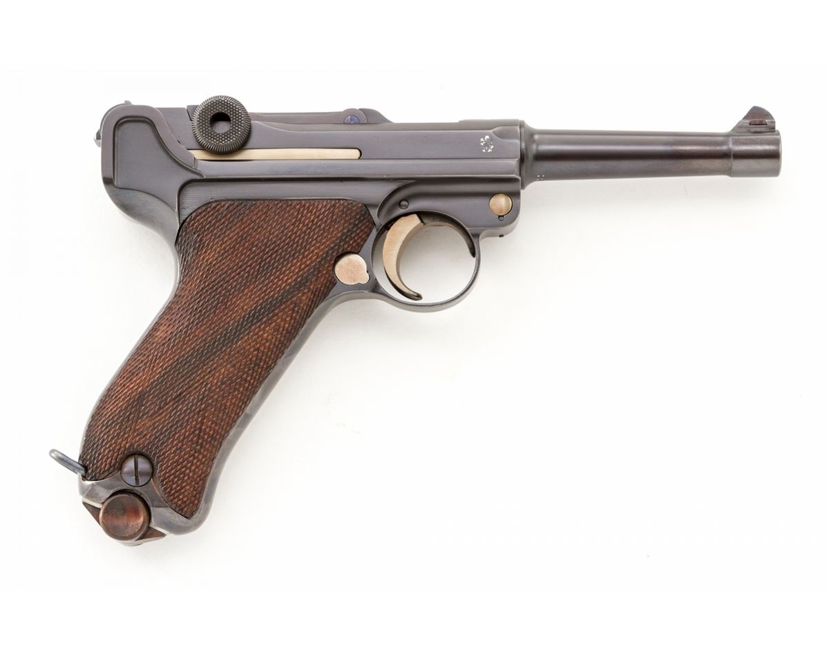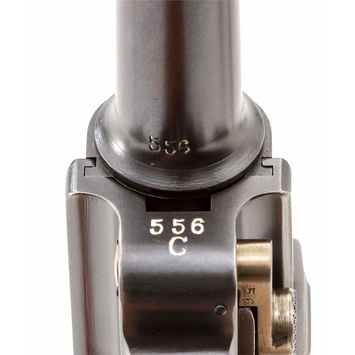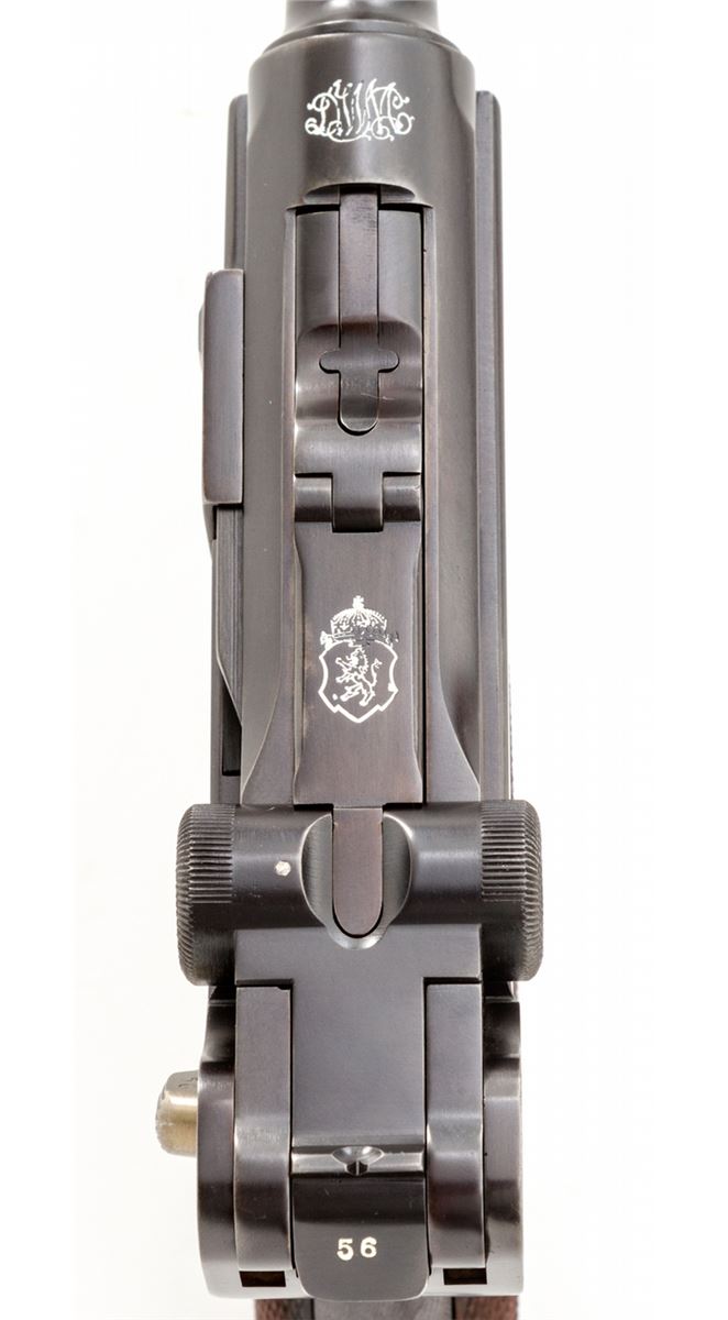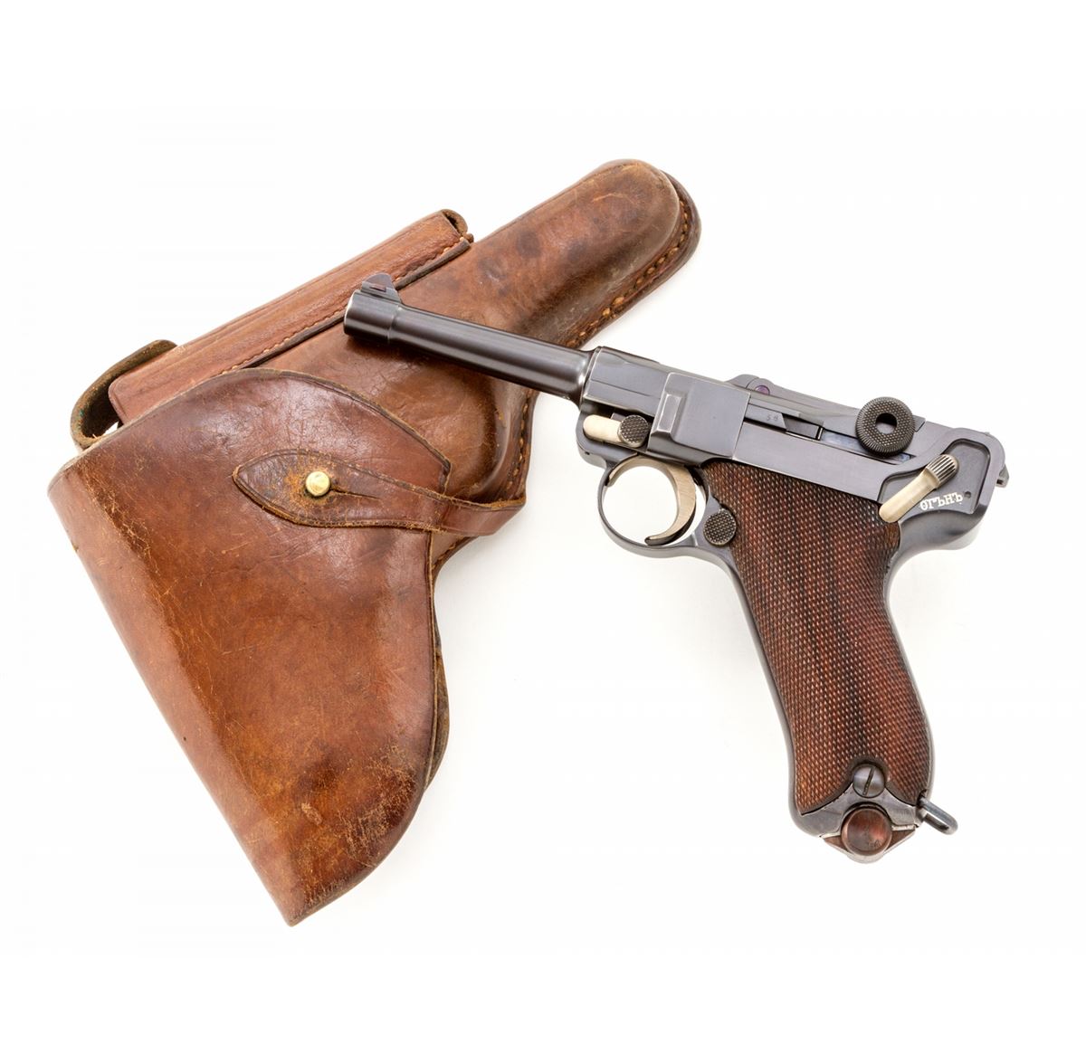 Scarce 1908 Bulgarian Luger, #556C, 9mm, 4'' barrel, blue finish with straw small parts, checkered walnut grips, and one unmarked tin-plated magazine with walnut base. Frame is smooth lacking stock lug but with sling loop to lower portion of backstrap; Bulgarian crest with ''(crown)/(lion)/shield'' to central toggle link, DWM to chamber, with Cyrillic safety and extractor markings, and Bulgarian lion to forward left edge of upper receiver. In brown leather Bulgarian holster. Condition is excellent as restored, retaining approx. 98% correct rust type blue. Straw parts have been re-colored and show very well. Grips are crisp with some oil darkening near metal surfaces. Action is crisp, bore is bright. All visible matching numbers. Holster is excellent showing light discoloration but with tight stitching. Est.: $2,500-$4,000. (C&R/PPT) (John Siroonian estate)