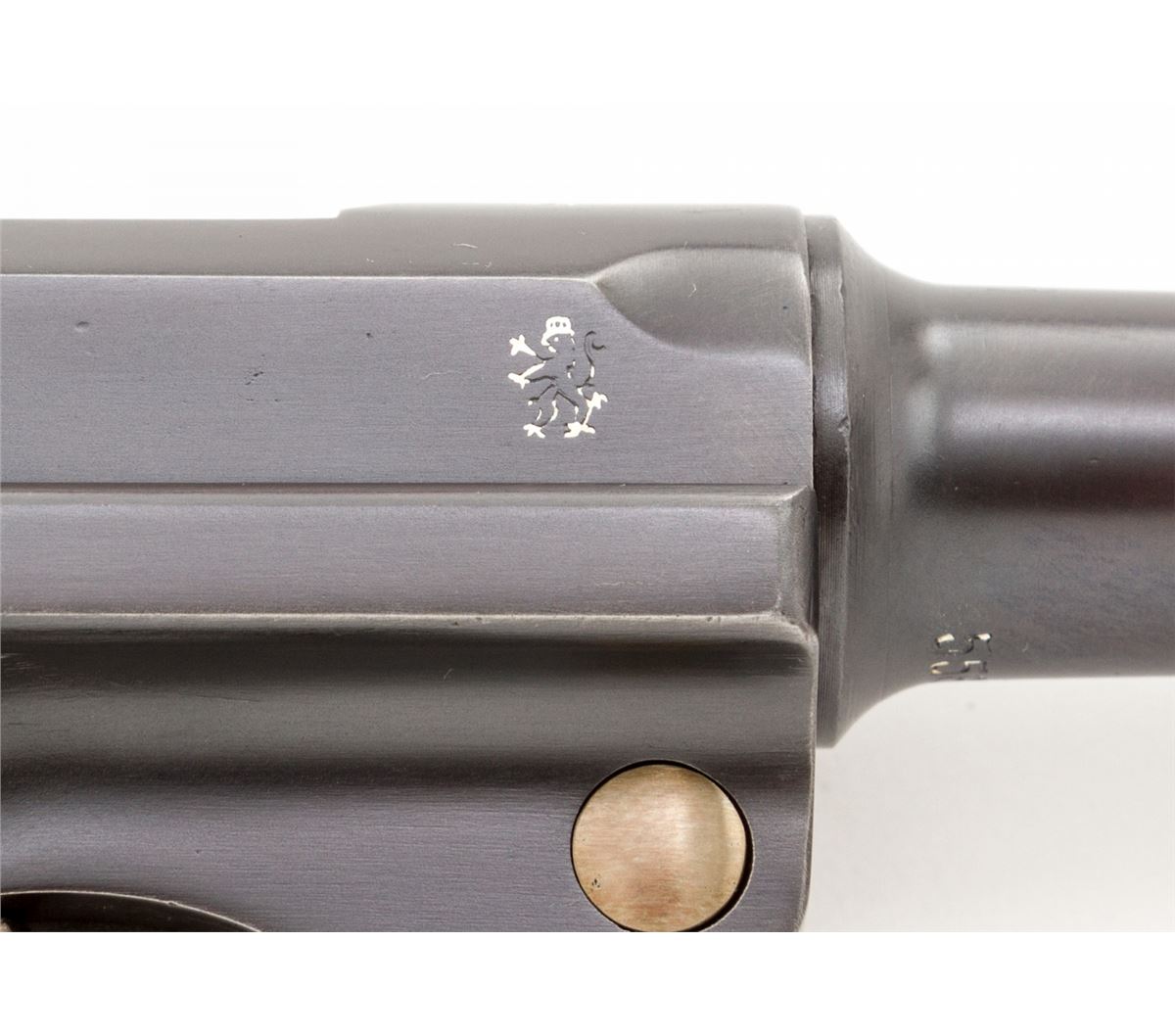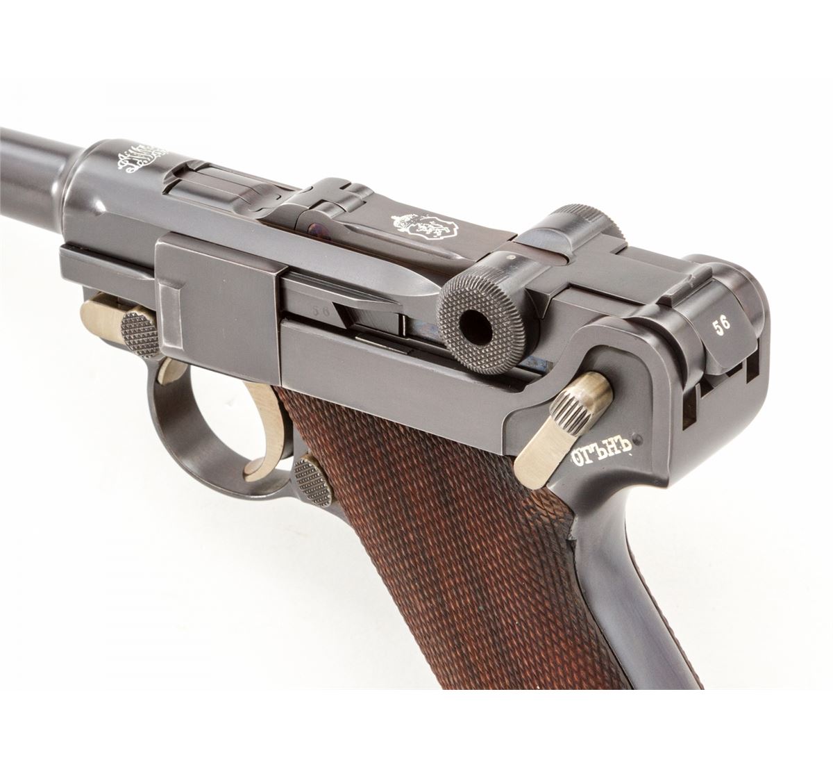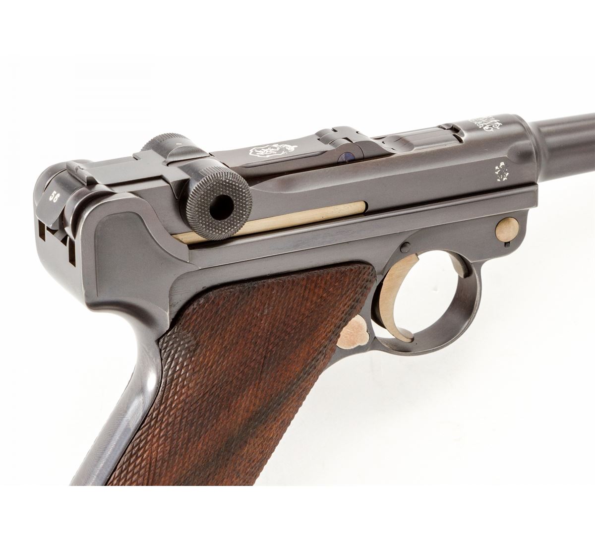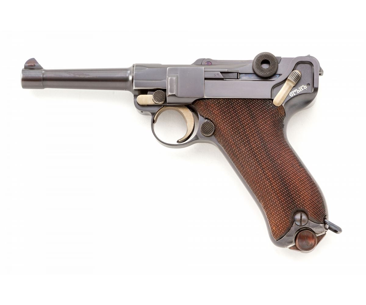 Scarce 1908 Bulgarian Luger, #556C, 9mm, 4'' barrel, blue finish with straw small parts, checkered walnut grips, and one unmarked tin-plated magazine with walnut base. Frame is smooth lacking stock lug but with sling loop to lower portion of backstrap; Bulgarian crest with ''(crown)/(lion)/shield'' to central toggle link, DWM to chamber, with Cyrillic safety and extractor markings, and Bulgarian lion to forward left edge of upper receiver. In brown leather Bulgarian holster. Condition is excellent as restored, retaining approx. 98% correct rust type blue. Straw parts have been re-colored and show very well. Grips are crisp with some oil darkening near metal surfaces. Action is crisp, bore is bright. All visible matching numbers. Holster is excellent showing light discoloration but with tight stitching. Est.: $2,500-$4,000. (C&R/PPT) (John Siroonian estate)