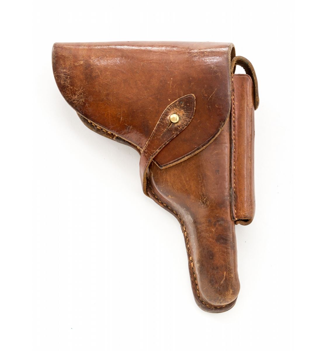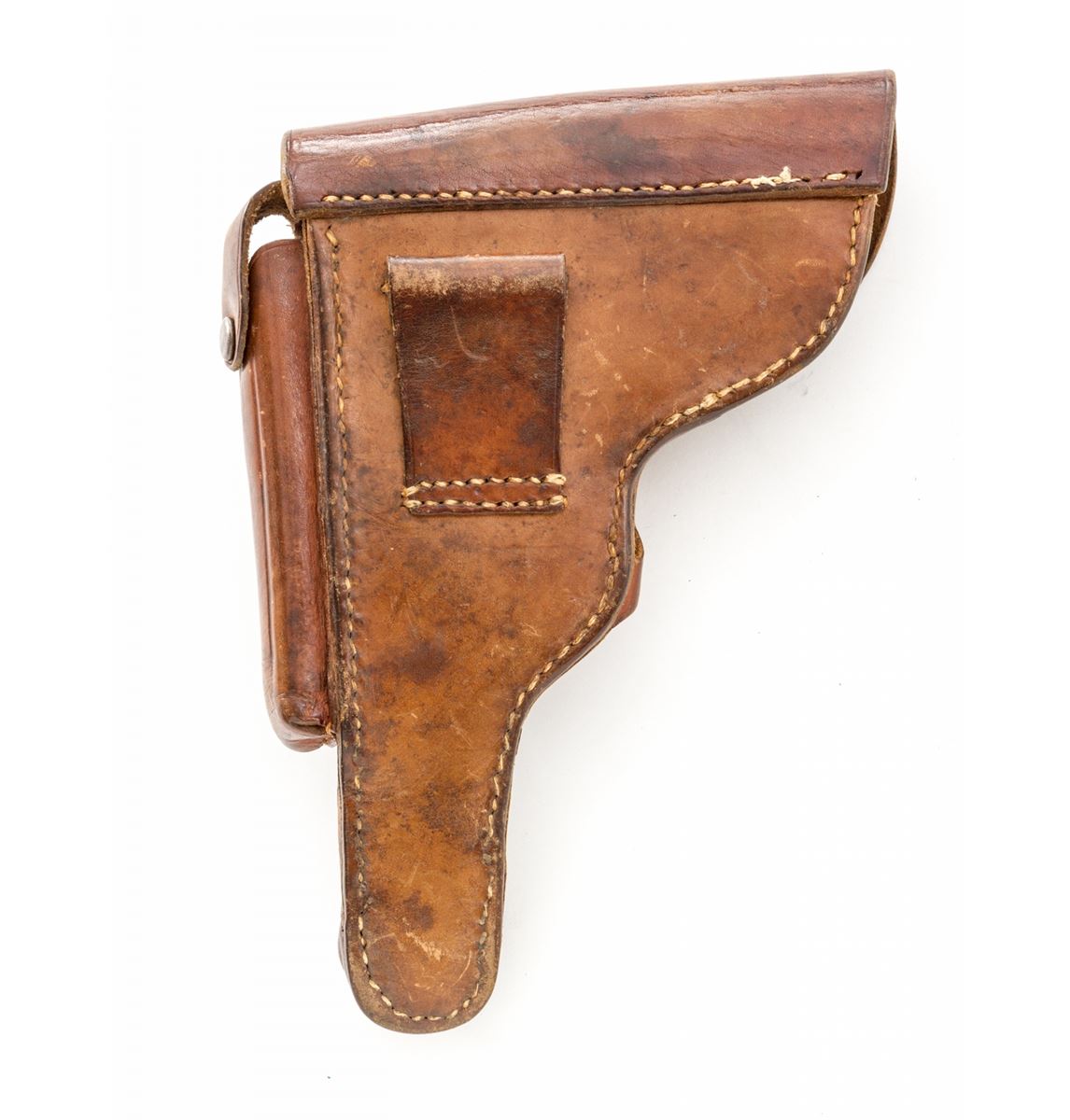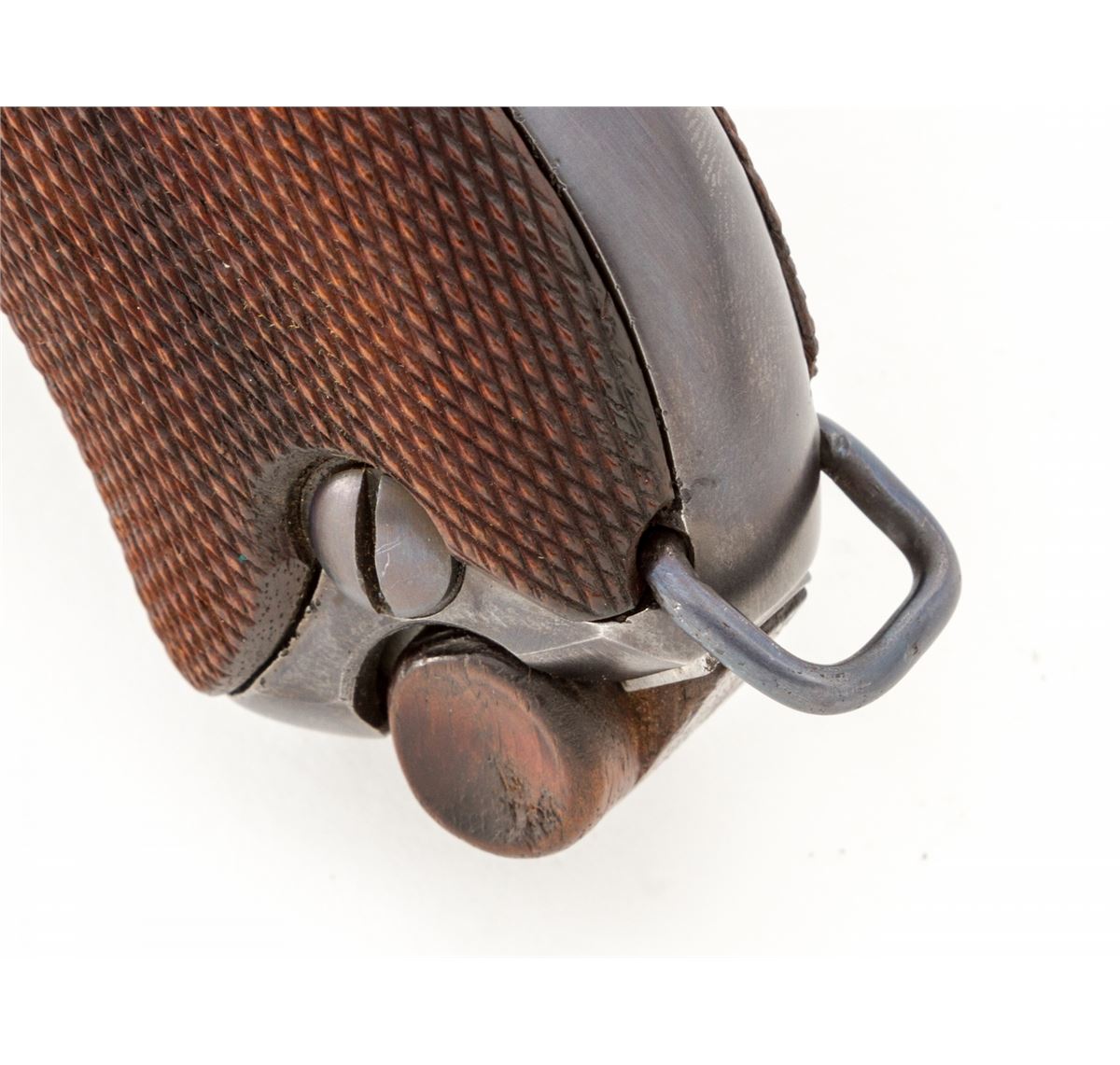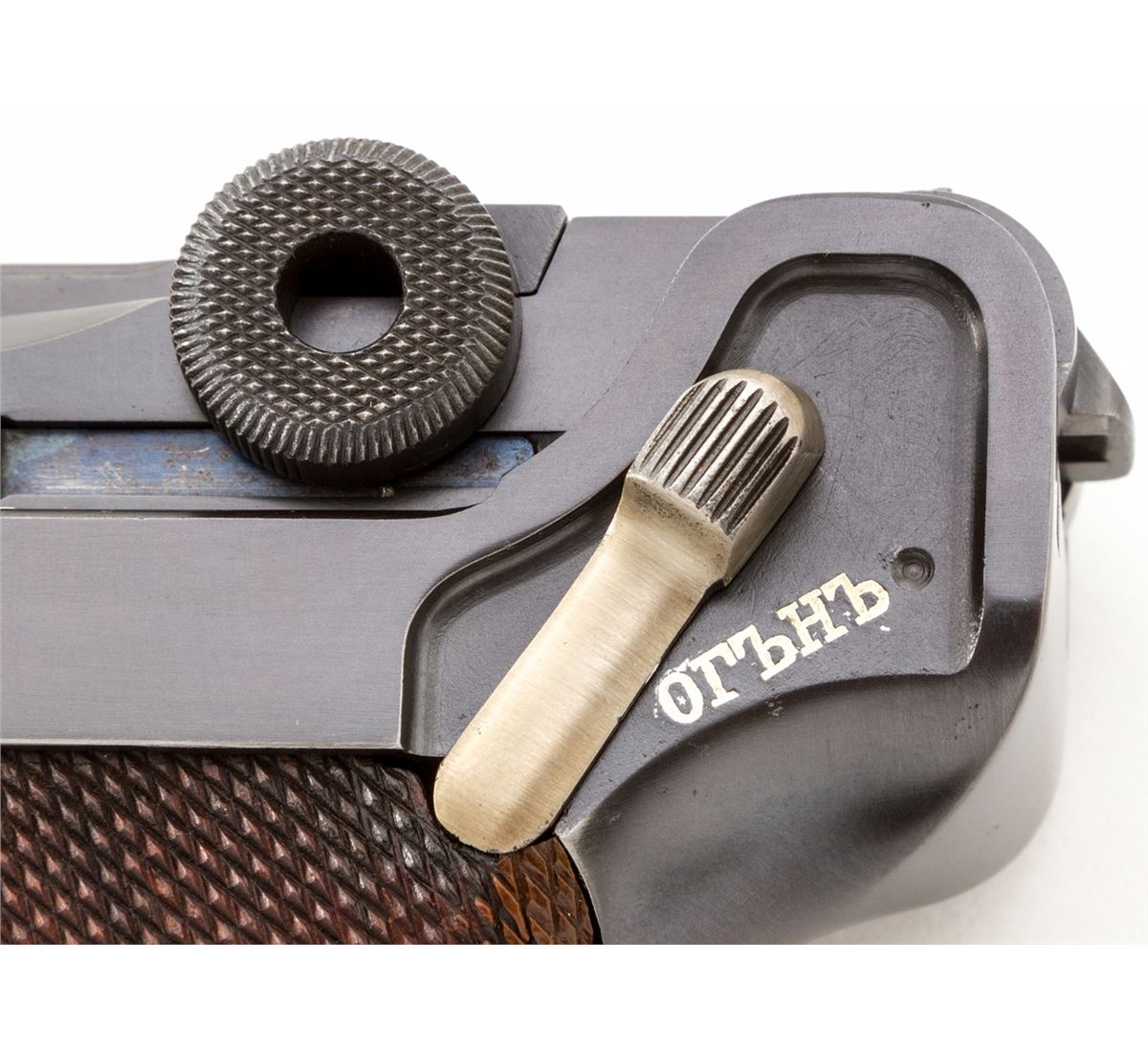 Scarce 1908 Bulgarian Luger, #556C, 9mm, 4'' barrel, blue finish with straw small parts, checkered walnut grips, and one unmarked tin-plated magazine with walnut base. Frame is smooth lacking stock lug but with sling loop to lower portion of backstrap; Bulgarian crest with ''(crown)/(lion)/shield'' to central toggle link, DWM to chamber, with Cyrillic safety and extractor markings, and Bulgarian lion to forward left edge of upper receiver. In brown leather Bulgarian holster. Condition is excellent as restored, retaining approx. 98% correct rust type blue. Straw parts have been re-colored and show very well. Grips are crisp with some oil darkening near metal surfaces. Action is crisp, bore is bright. All visible matching numbers. Holster is excellent showing light discoloration but with tight stitching. Est.: $2,500-$4,000. (C&R/PPT) (John Siroonian estate)