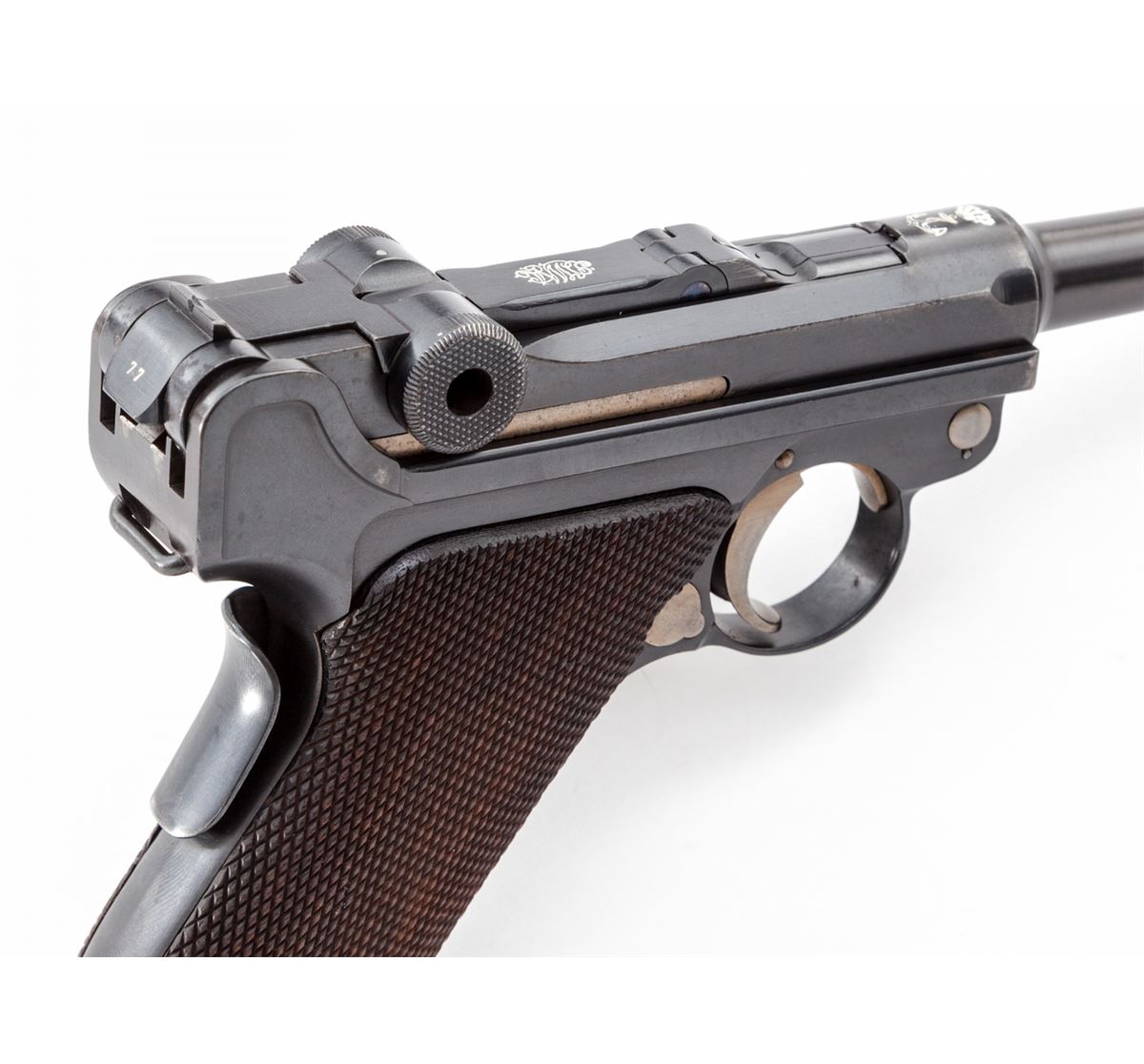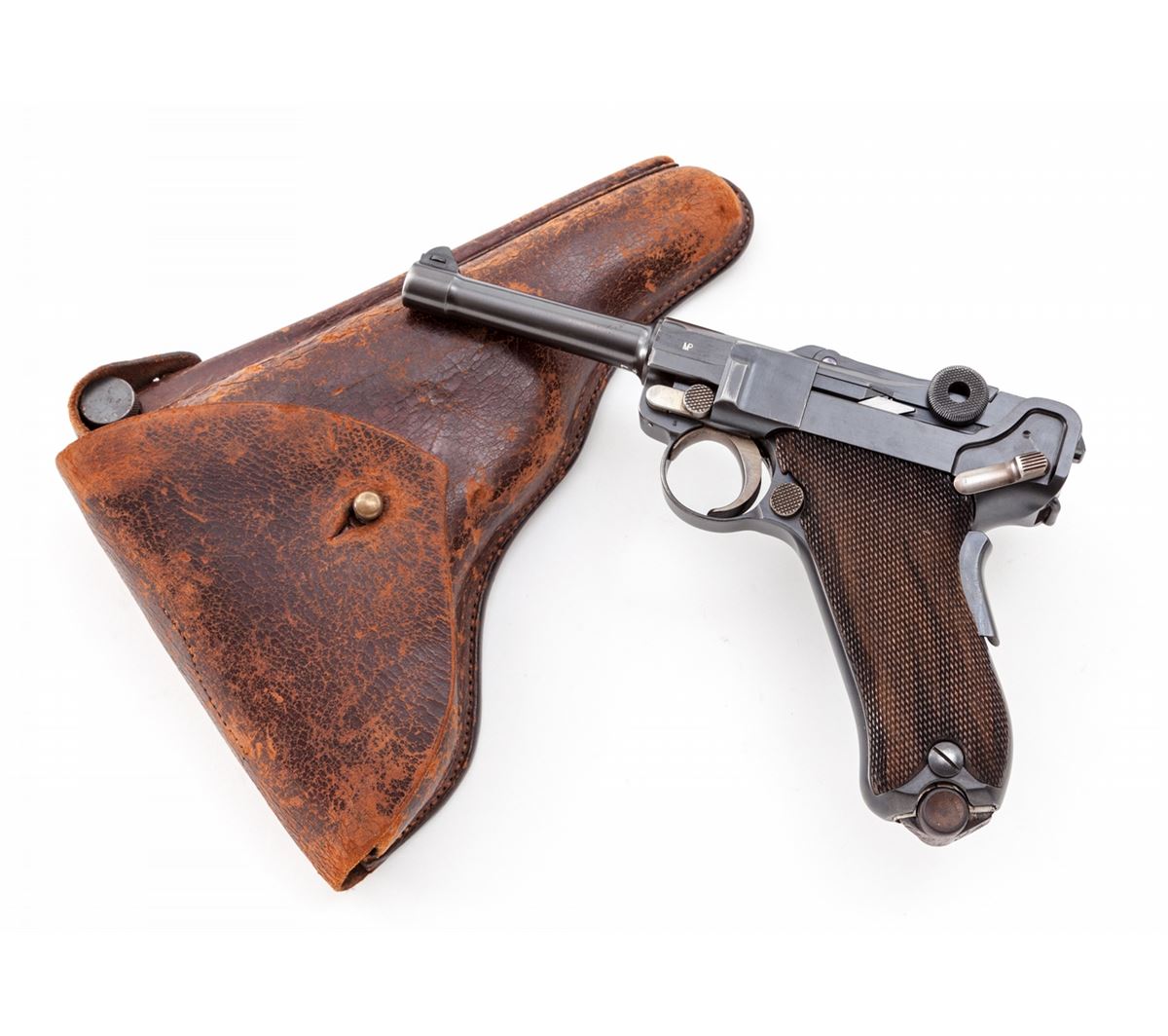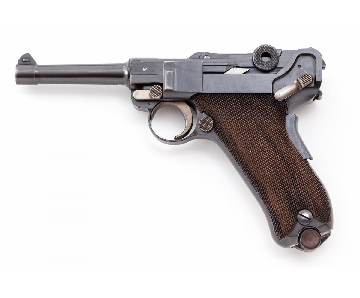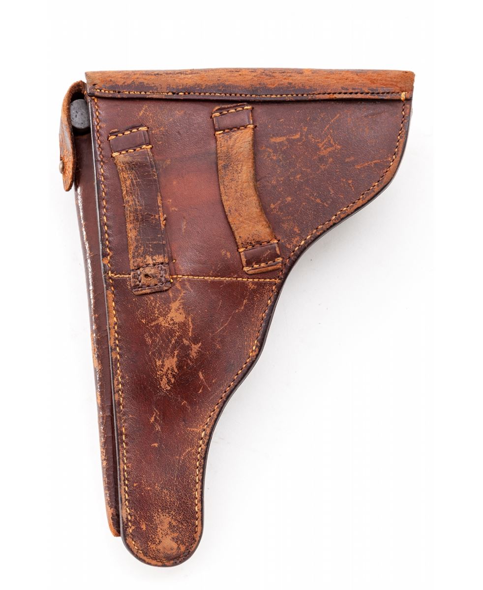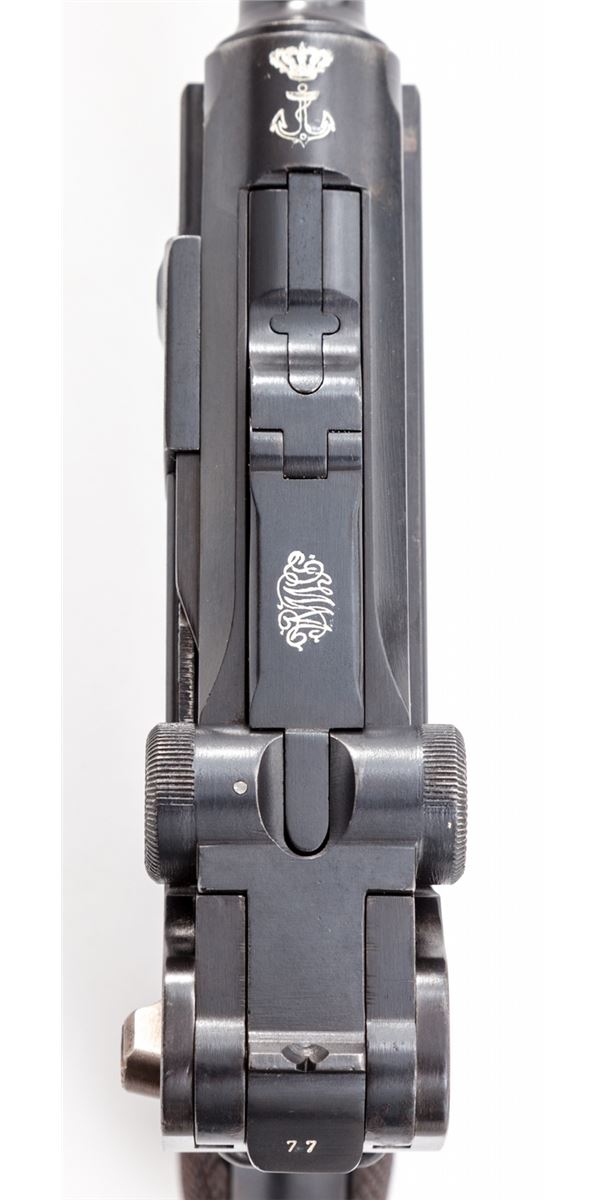 1906 Royal Portuguese Navy Luger, #277, 9mm, 4'' barrel, blue finish with straw small parts, factory checkered walnut grips, and nickel-plated magazine with walnut base marked ''CAL 9M/M''. Chamber marked ''(crown)/(anchor)'', DWM to central toggle link, Portuguese Naval proof to forward left side of upper receiver, serrated thumb safety with lower portion polished bright, extractor marked ''Carregada''. Less than 1000 mfg'd with only about a dozen known. In brown Portuguese style period holster with combo rod and oiler. Condition is excellent with light areas of touchup to rust blue finish. Grips with minor flattening and small losses along forward edge of left panel. Action is crisp, bore is fine with very light frosting in the grooves. A scarce and seldom seen variation. Holster shows moderate general scuffing and thinning to leather at straps; combo tool pocket is loose. Est.: $7,500-$10,000. (C&R/PPT) (John Siroonian estate)