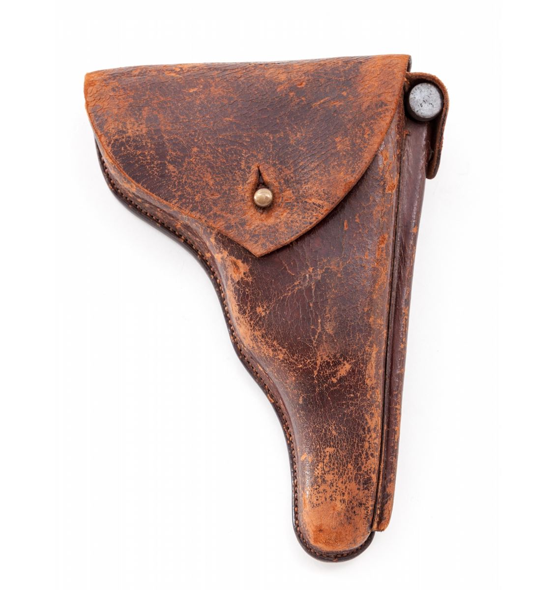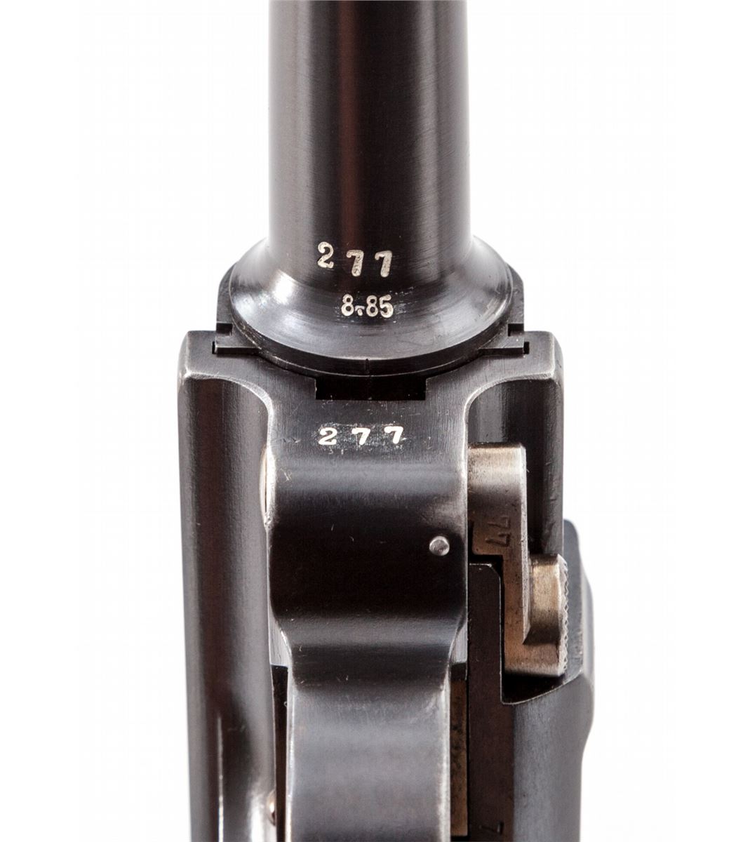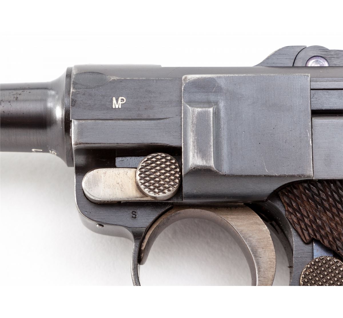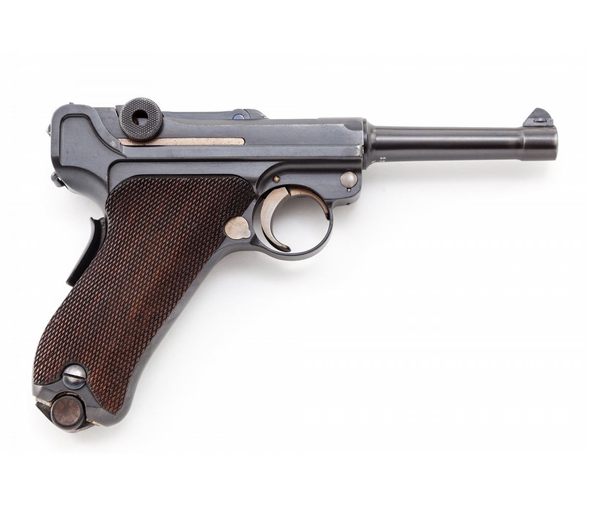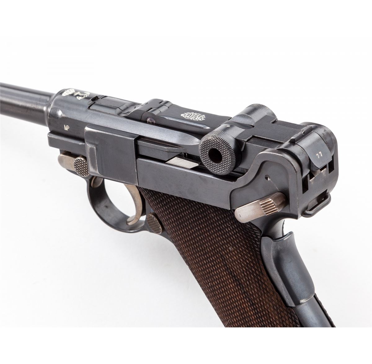 1906 Royal Portuguese Navy Luger, #277, 9mm, 4'' barrel, blue finish with straw small parts, factory checkered walnut grips, and nickel-plated magazine with walnut base marked ''CAL 9M/M''. Chamber marked ''(crown)/(anchor)'', DWM to central toggle link, Portuguese Naval proof to forward left side of upper receiver, serrated thumb safety with lower portion polished bright, extractor marked ''Carregada''. Less than 1000 mfg'd with only about a dozen known. In brown Portuguese style period holster with combo rod and oiler. Condition is excellent with light areas of touchup to rust blue finish. Grips with minor flattening and small losses along forward edge of left panel. Action is crisp, bore is fine with very light frosting in the grooves. A scarce and seldom seen variation. Holster shows moderate general scuffing and thinning to leather at straps; combo tool pocket is loose. Est.: $7,500-$10,000. (C&R/PPT) (John Siroonian estate)