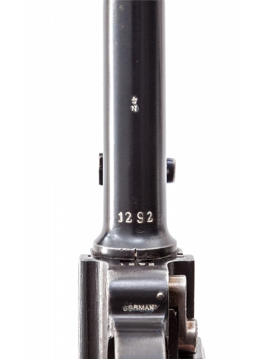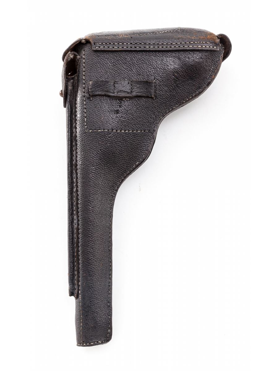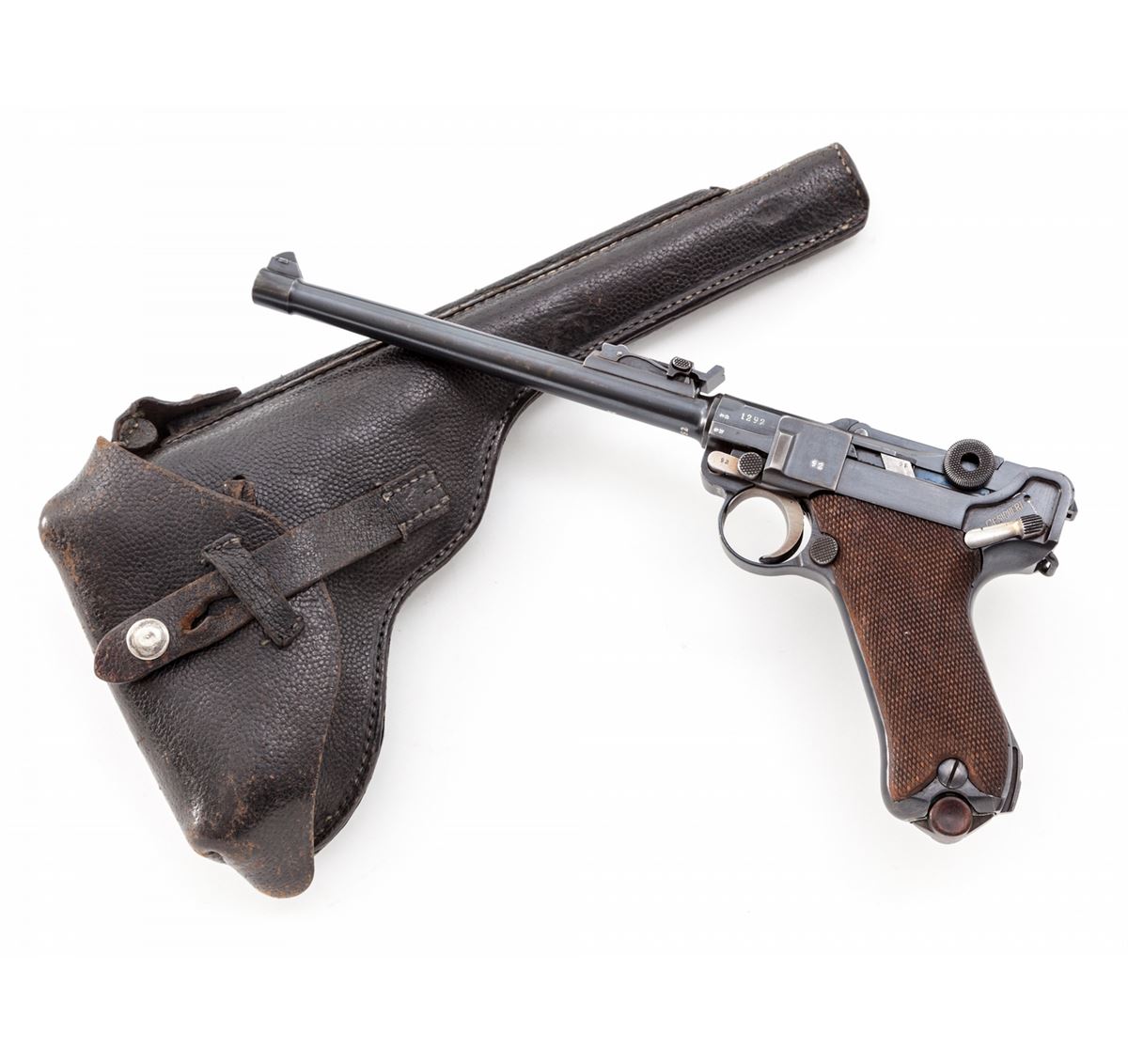 1920 Artillery Commercial Luger, #1292, .30 Luger cal., 8'' barrel, blue finish with straw small parts, factory checkered walnut grips, and one unmarked nickel-plated magazine with walnut base. Blank chamber, DWM marked toggle link, standard ''Gesichert/Geladen'' safety and extractor, commercial ''(crown)/N'' proofmarks, and marked ''Germany'' just in front of triggerguard. Considered quite scarce by collectors with very few known, especially in the .30 Luger chambering. Also included is a black Moroccan leather holster which has provision for the standard barrel head cleaning rod (not present). Condition is fine to near excellent retaining approx. 95% thinning and toning blue. Grips show some flattening. Action is crisp, bore is bright. All visible matching numbers. Holster with modified snap, even light patination with minor impressions, and nice solid stitching. Est.: $4,500-$6,000. (C&R/PPT) (John Siroonian estate)