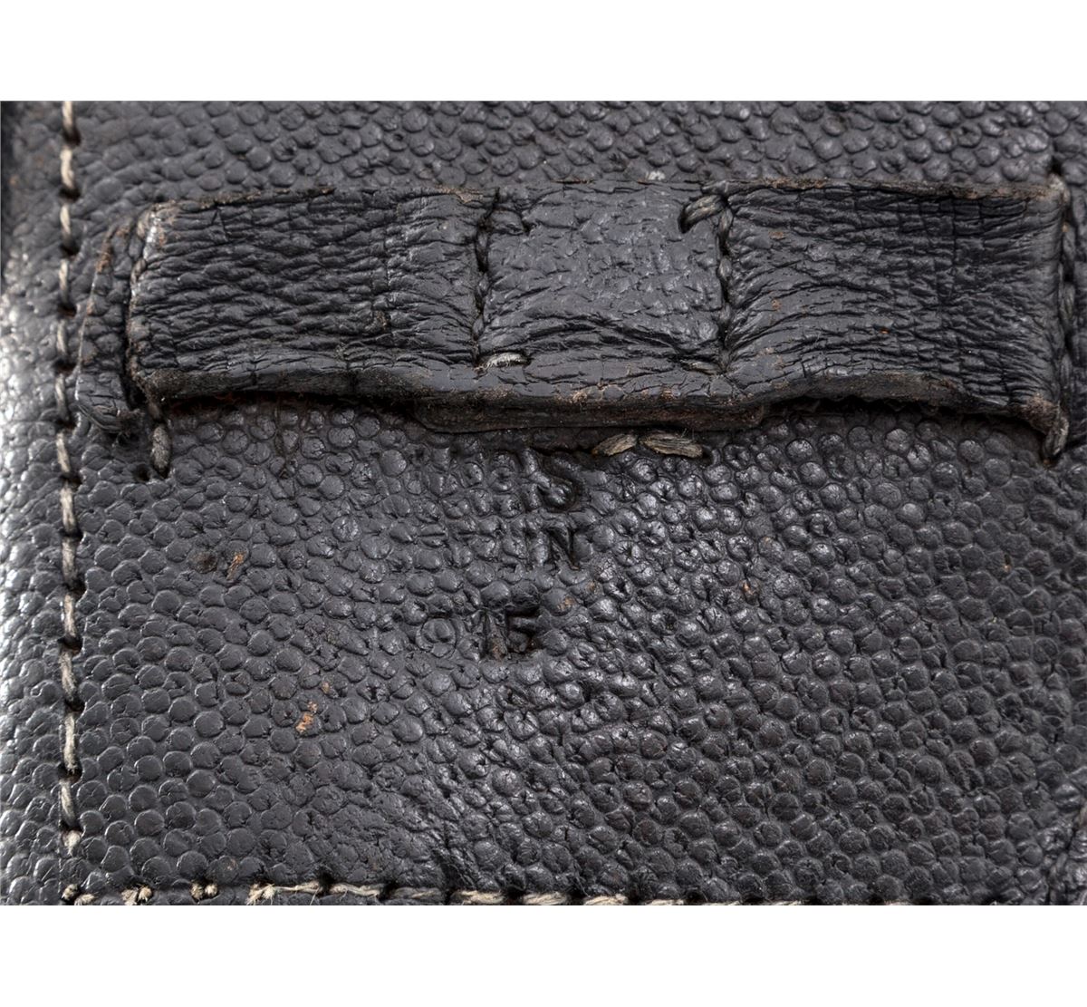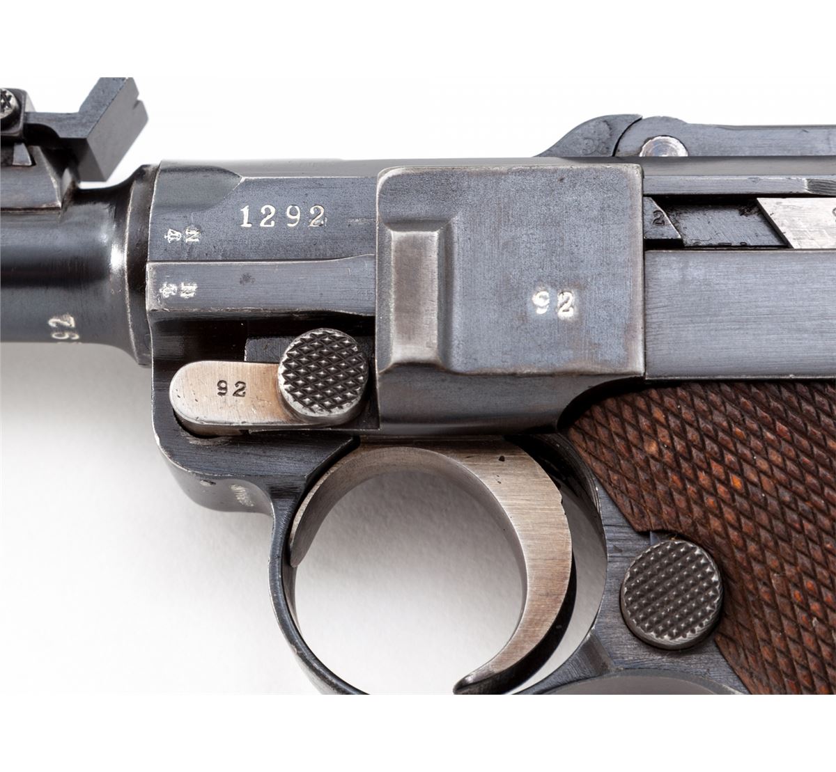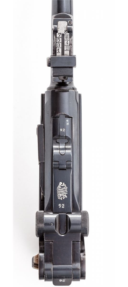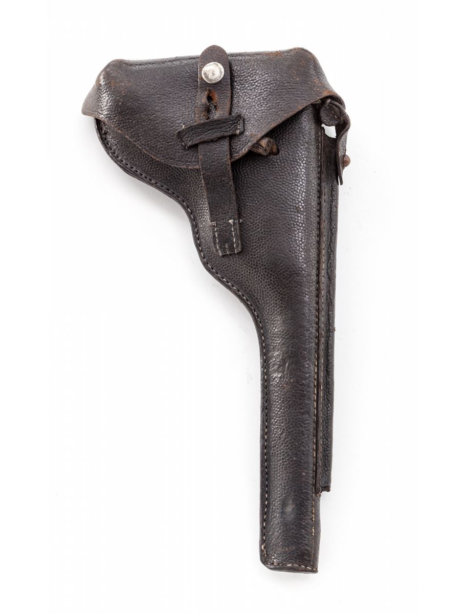 1920 Artillery Commercial Luger, #1292, .30 Luger cal., 8'' barrel, blue finish with straw small parts, factory checkered walnut grips, and one unmarked nickel-plated magazine with walnut base. Blank chamber, DWM marked toggle link, standard ''Gesichert/Geladen'' safety and extractor, commercial ''(crown)/N'' proofmarks, and marked ''Germany'' just in front of triggerguard. Considered quite scarce by collectors with very few known, especially in the .30 Luger chambering. Also included is a black Moroccan leather holster which has provision for the standard barrel head cleaning rod (not present). Condition is fine to near excellent retaining approx. 95% thinning and toning blue. Grips show some flattening. Action is crisp, bore is bright. All visible matching numbers. Holster with modified snap, even light patination with minor impressions, and nice solid stitching. Est.: $4,500-$6,000. (C&R/PPT) (John Siroonian estate)