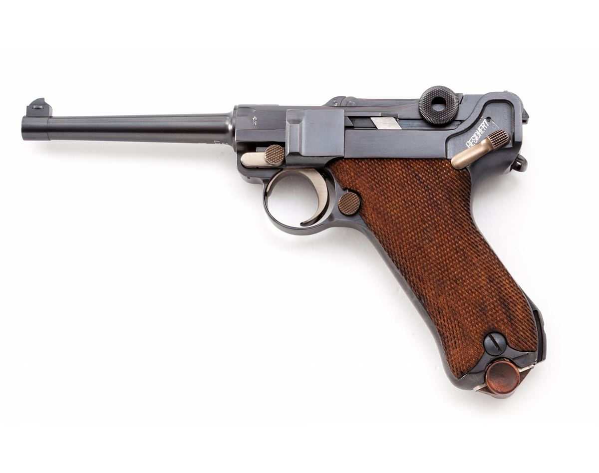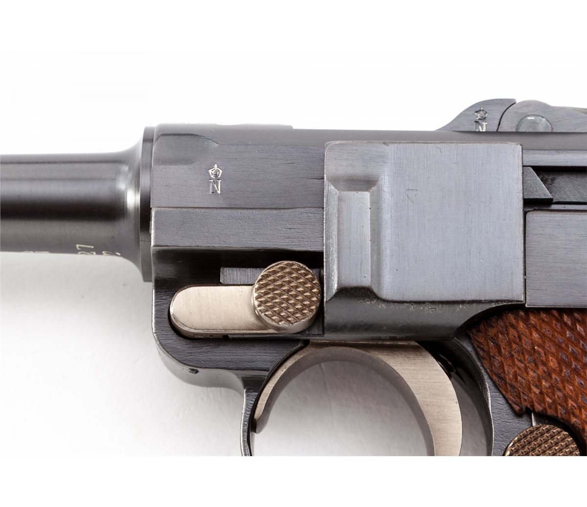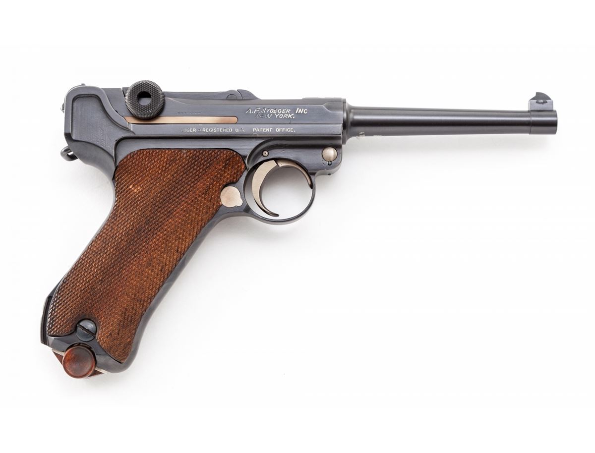 1920 Stoeger 3-Line American Eagle Commercial Luger, #4727n, .30 Luger cal., 4-3/4'' barrel, blue finish with straw small parts, factory checkered walnut grips, and one tin-plated magazine with unmarked wooden base. American eagle to chamber area, DWM to central toggle link, standard ''Gesichert/Geladen'' marked safety and extractor, ''(crown)/N'' proofmarks. Right side of receiver marked ''Germany-A.F. Stoeger Inc/New York./Genuine Luger-Registered U.S. Patent Office.'' Condition is excellent retaining approx. 98% original blue with wear at muzzle, forward and high edges. Crisp grips and action, bright bore. Est.: $3,000-$4,000. (C&R/PPT) (John Siroonian estate)