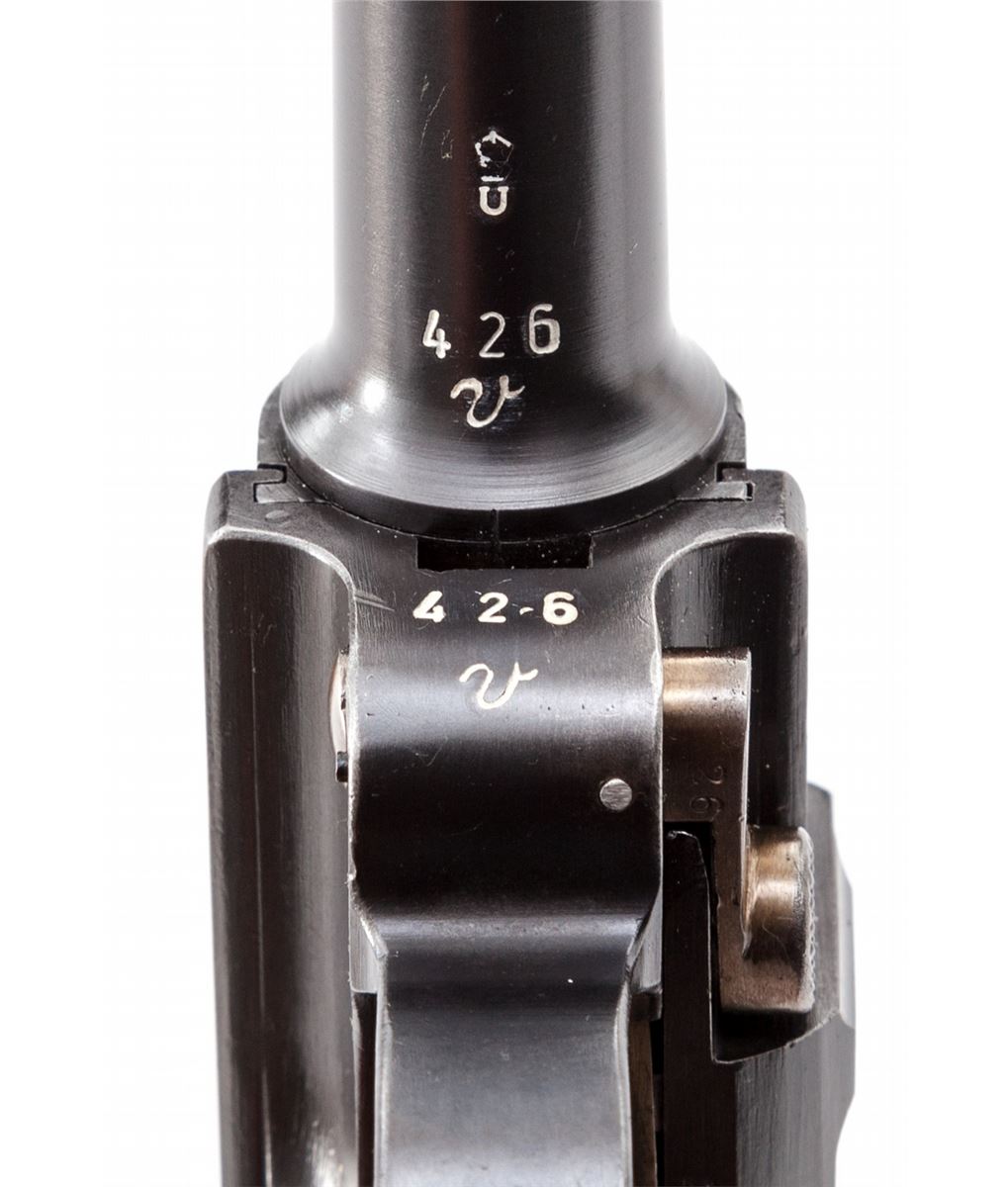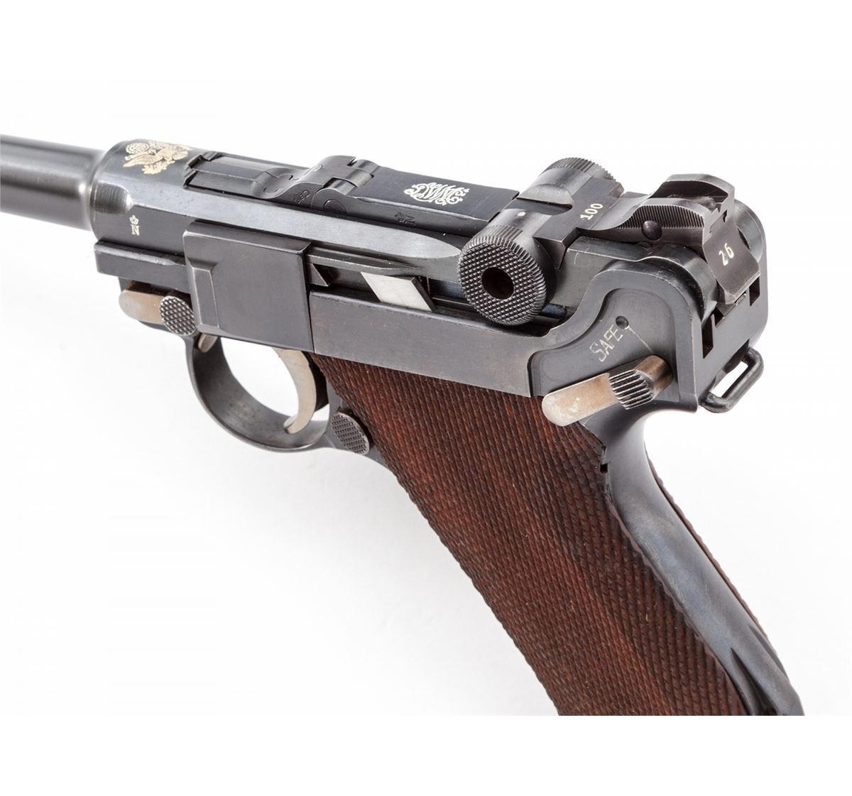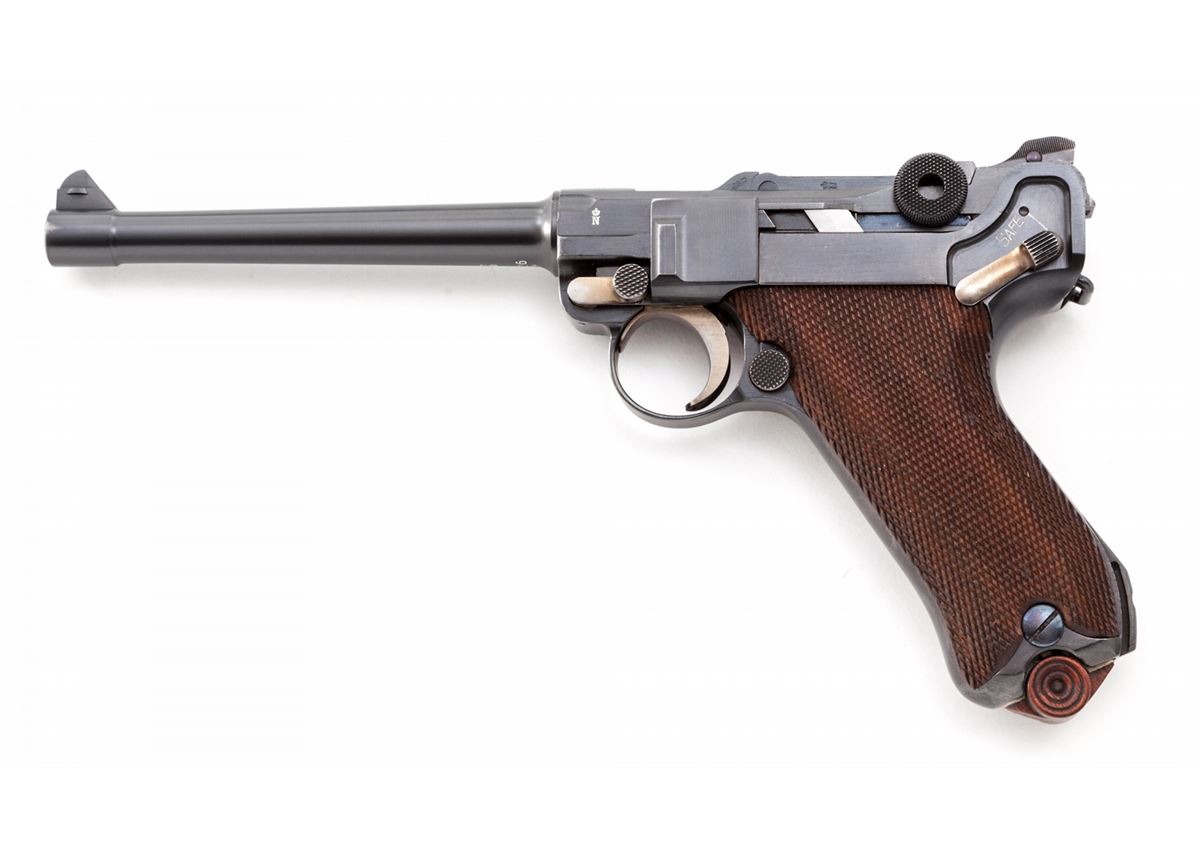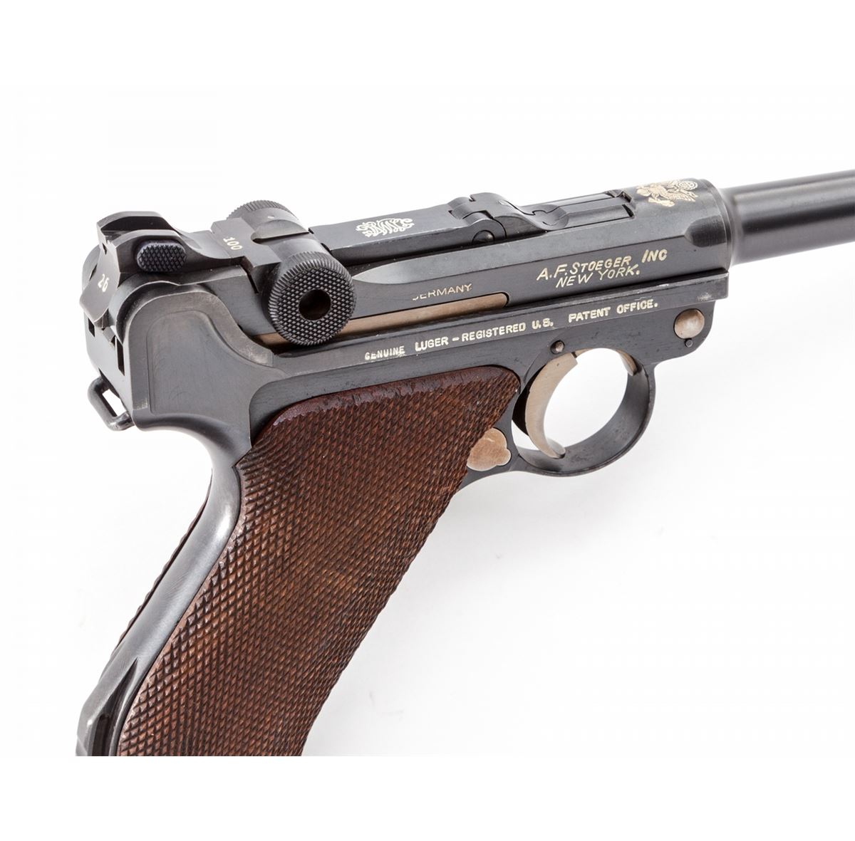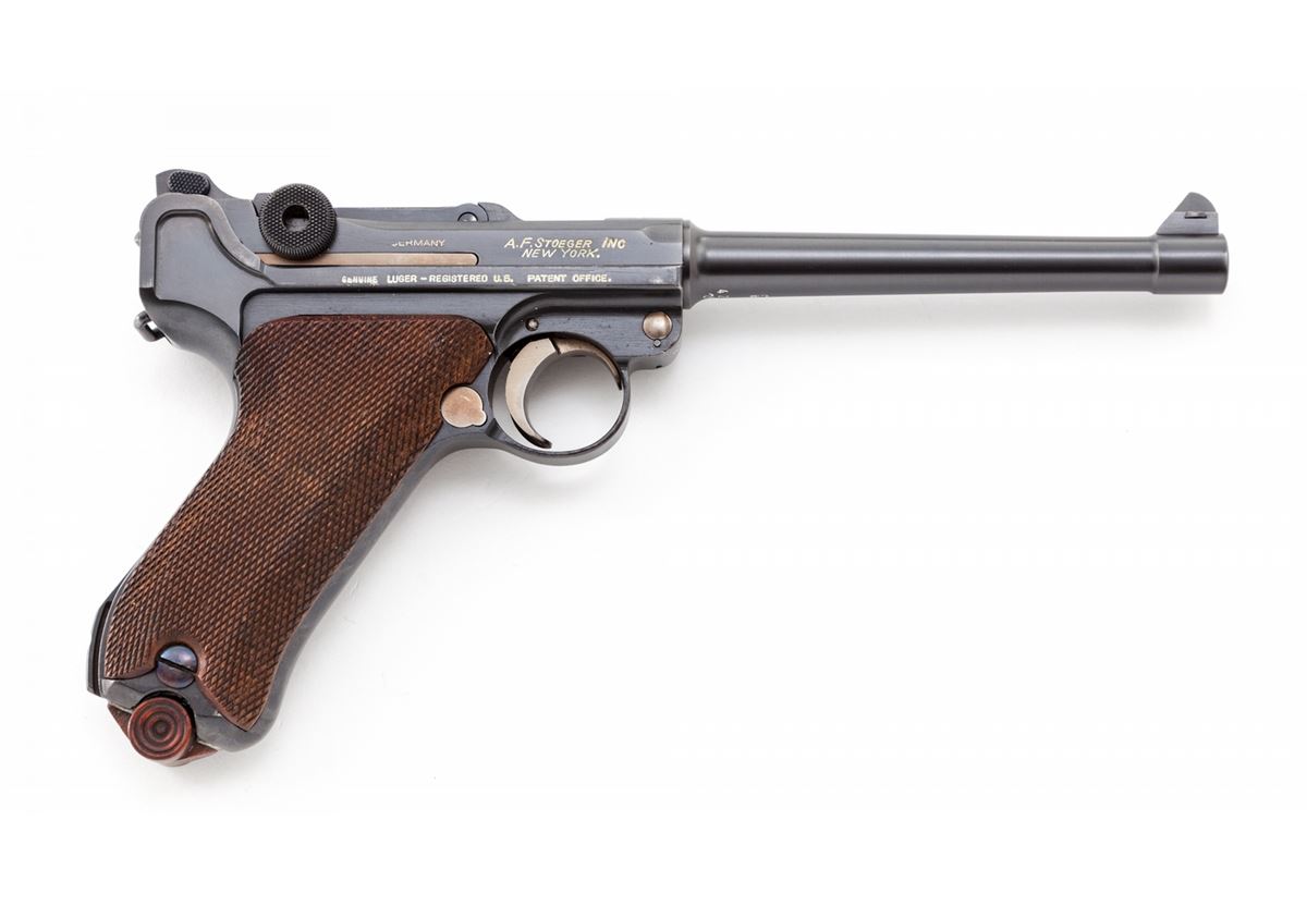 1920 Stoeger 3-Line American Eagle Navy Luger, #426v, 9mm, 6'' barrel, blue finish with straw small parts, factory checkered walnut grips, and one tin-plated magazine with circle cut walnut based marked ''CAL 9M/M''. American eagle to chamber area, DWM to central toggle link, two-position rear sight, ''Safe'' marked thumb safety, ''Loaded'' marked extractor; ''(crown)/N'' and ''U'' proofmarks. Right side of receiver marked ''Germany-A.F. Stoeger Inc/New York./Genuine Luger-Registered U.S. Patent Office.'' Condition is excellent retaining approx. 98% original blue with wear at muzzle, forward and high edges. Crisp grips and action, bright bore. Est.: $6,000-$8,000. (C&R/PPT) (John Siroonian estate)