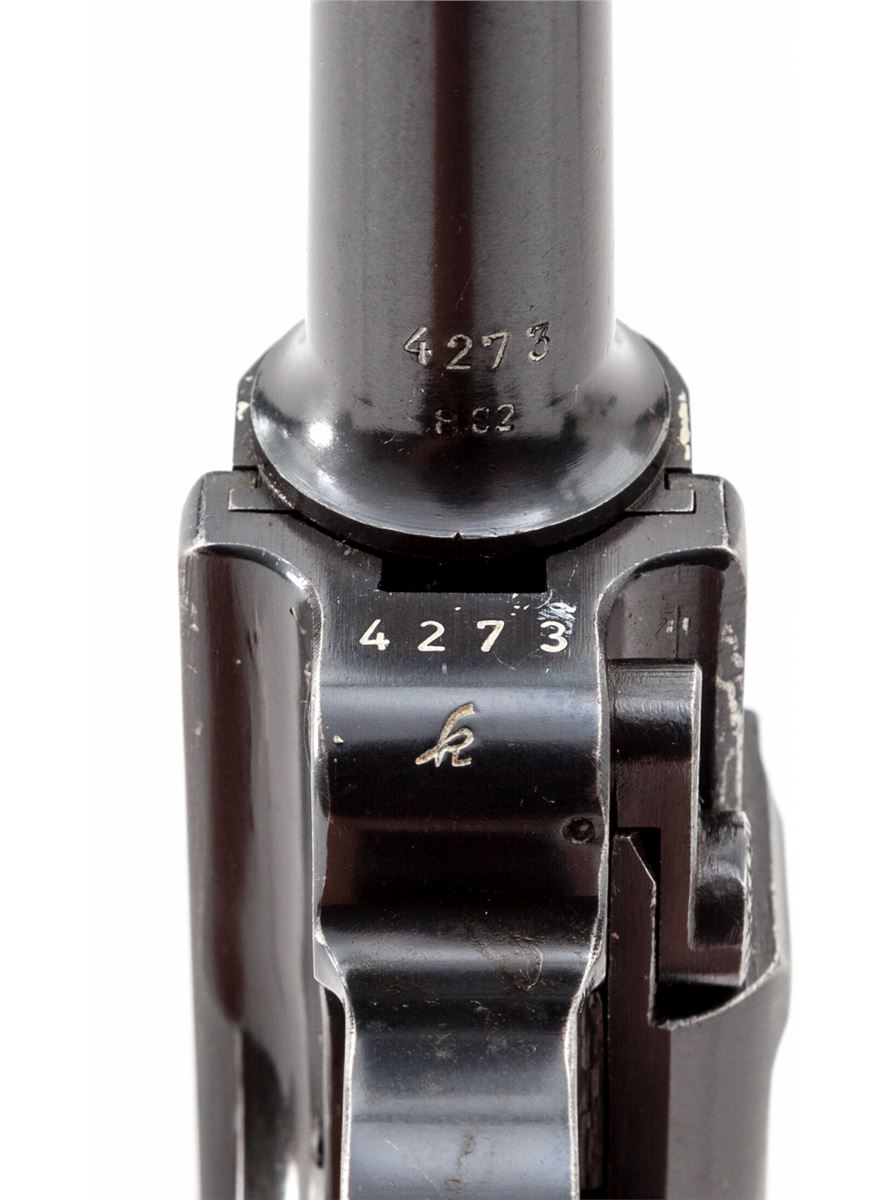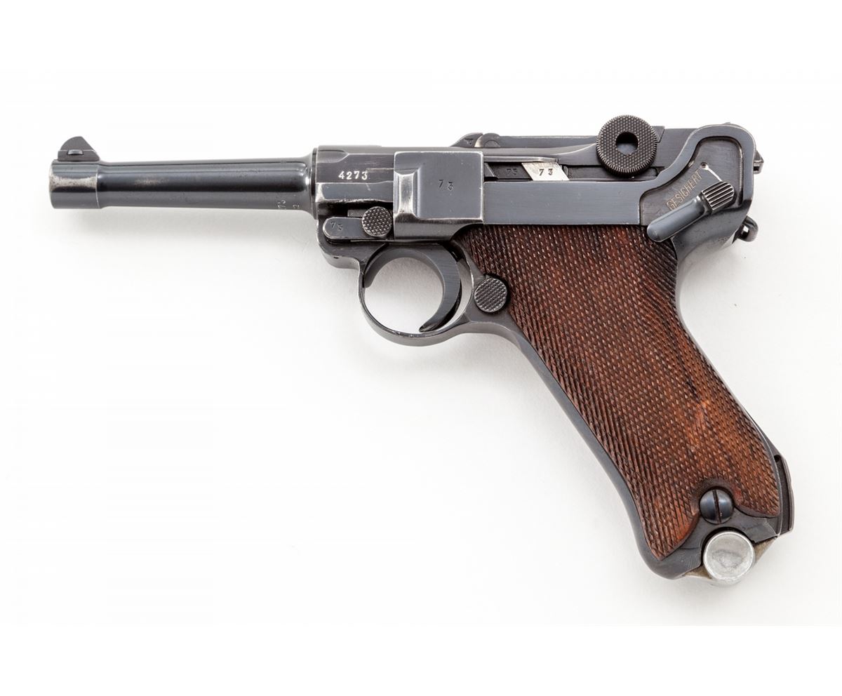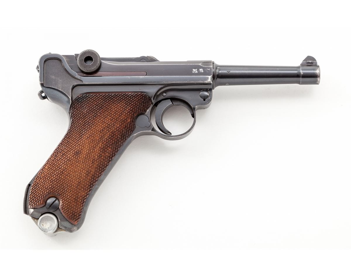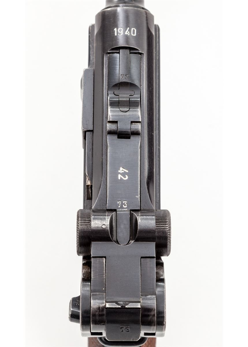 WWII Era German Luger, by Mauser, #4273k, 9mm, 4'' barrel, blue finish, factory checkered walnut grips, with one mismatched blue-bodied wraparound magazine with aluminum base. Chamber dated 1940, toggle coded ''42''. Condition is excellent retaining approx. 97% original blue with very light thinning at muzzle, high edges of sideplate and backstrap. Left panel shows light evidence of retracing to checks. Action is crisp, bore is bright. Est.: $1,800-$2,400. (C&R)