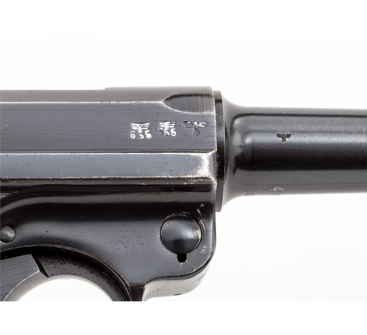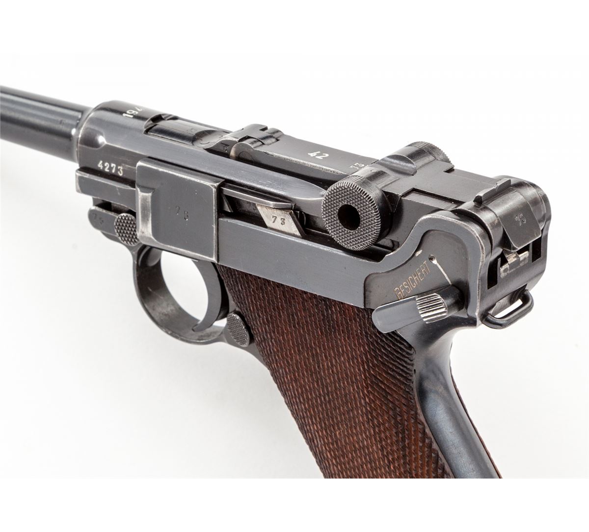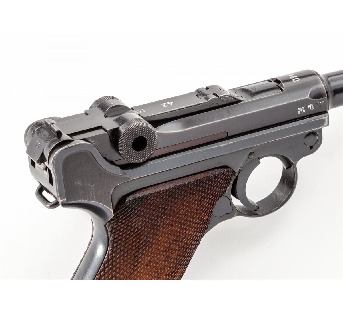 WWII Era German Luger, by Mauser, #4273k, 9mm, 4'' barrel, blue finish, factory checkered walnut grips, with one mismatched blue-bodied wraparound magazine with aluminum base. Chamber dated 1940, toggle coded ''42''. Condition is excellent retaining approx. 97% original blue with very light thinning at muzzle, high edges of sideplate and backstrap. Left panel shows light evidence of retracing to checks. Action is crisp, bore is bright. Est.: $1,800-$2,400. (C&R)