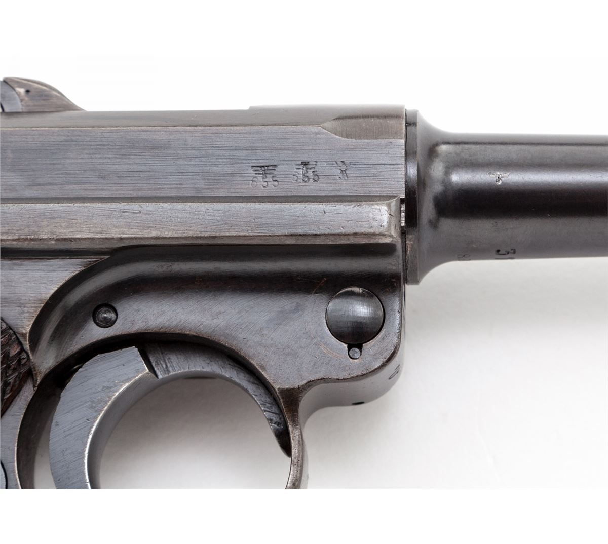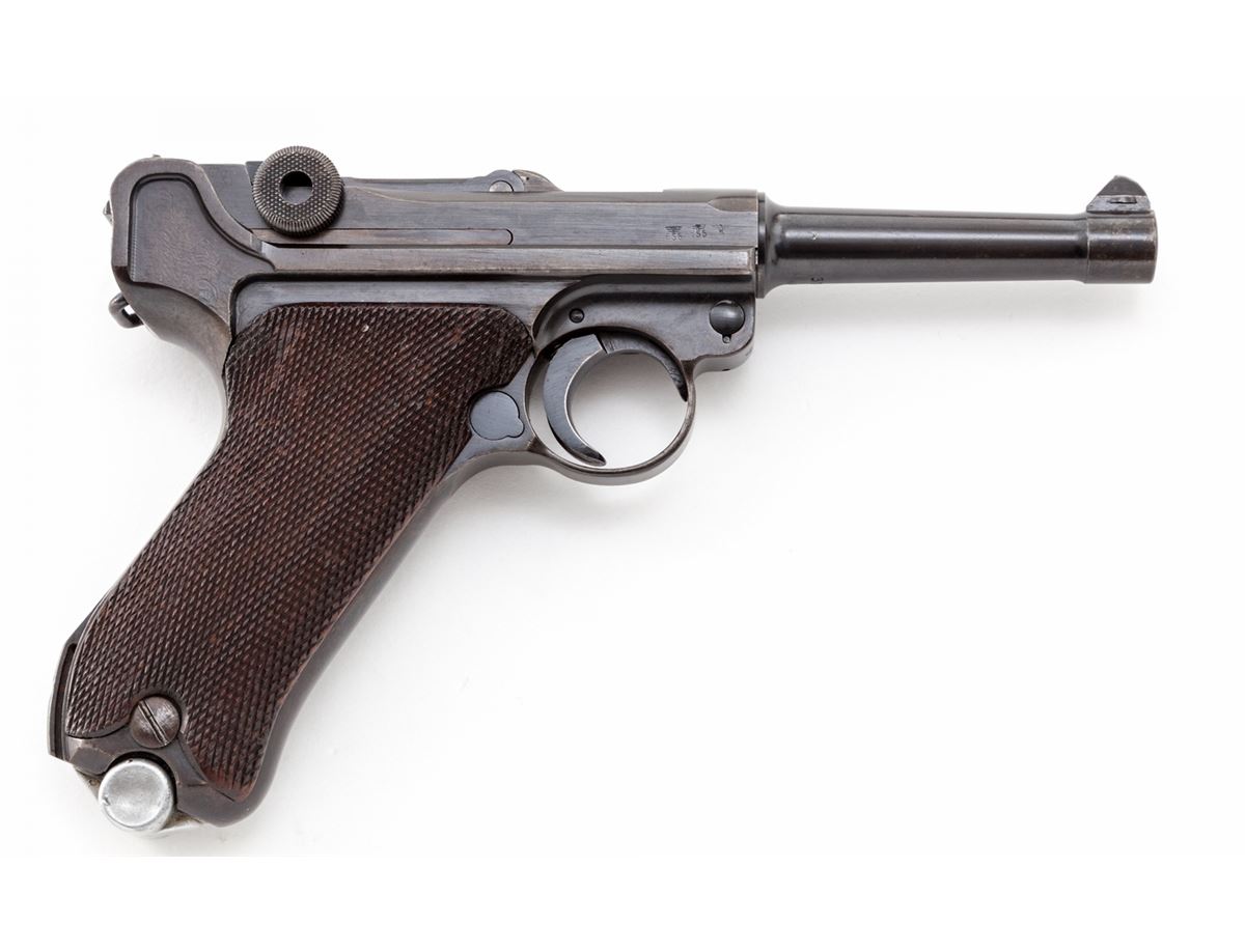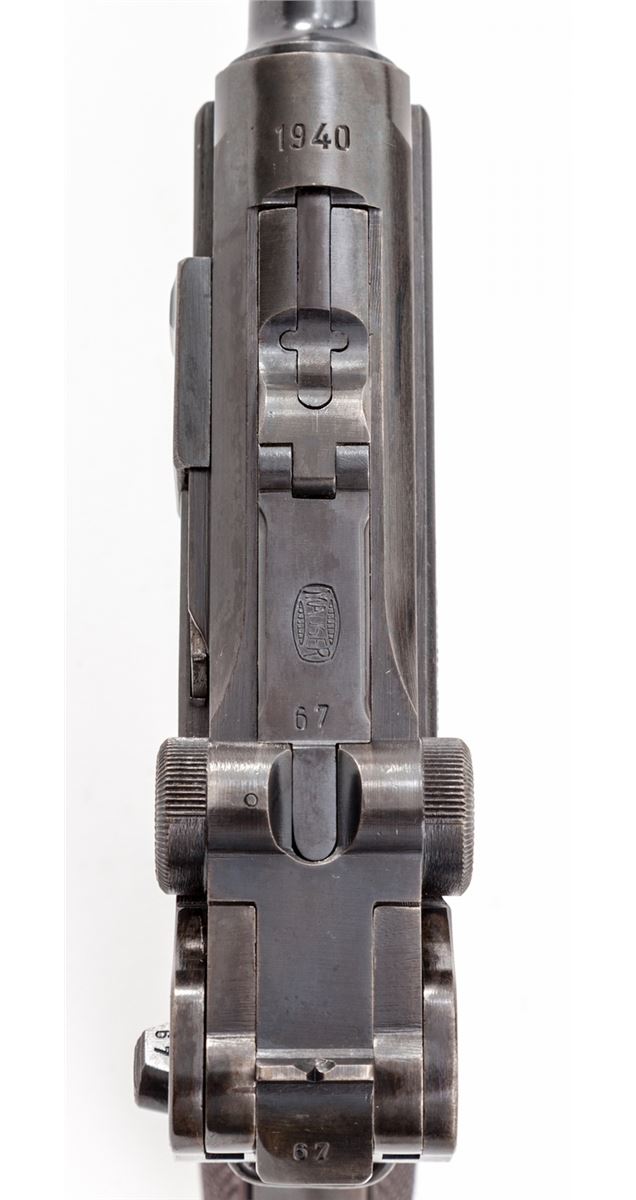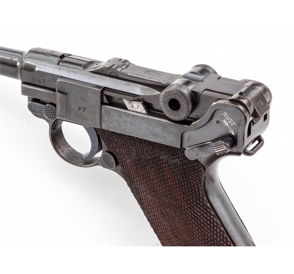 Mauser Banner/Dutch German Luger, #3167v, 9mm, 4'' barrel, salt blue finish, factory checkered walnut grips, and one matching numbered blue-bodied aluminum based magazine. Chamber dated 1940, Mauser Banner to central toggle, thumb safety marked ''Rust'' with downward pointing arrow to Safe position; ''(crown)/U'' commercial test marks, and ''(stick eagle)/655'' military acceptance marks. Considered very rare with approx. 600 mfg'd within this serial number range (2655v-3254v). Condition is fine with some touchup to external metal surfaces and brown toning to blue. Grips with mild flattening. Action is crisp, bore is fair to good. Est.: $2,500-$4,000. (C&R/PPT) (John Siroonian estate)