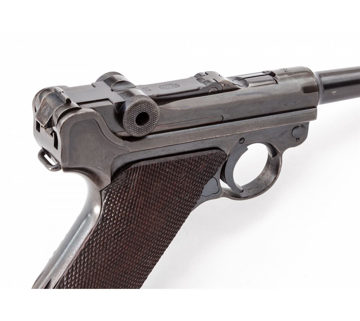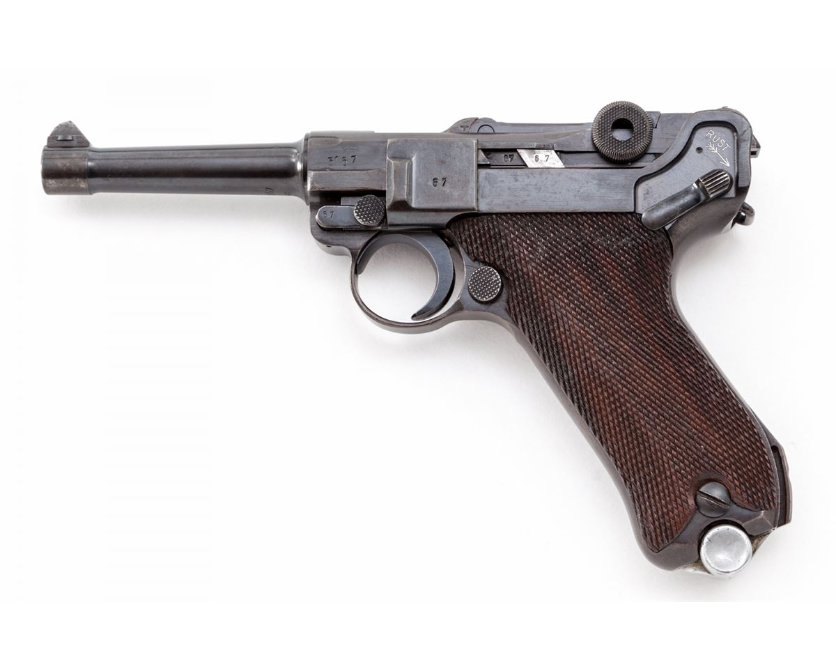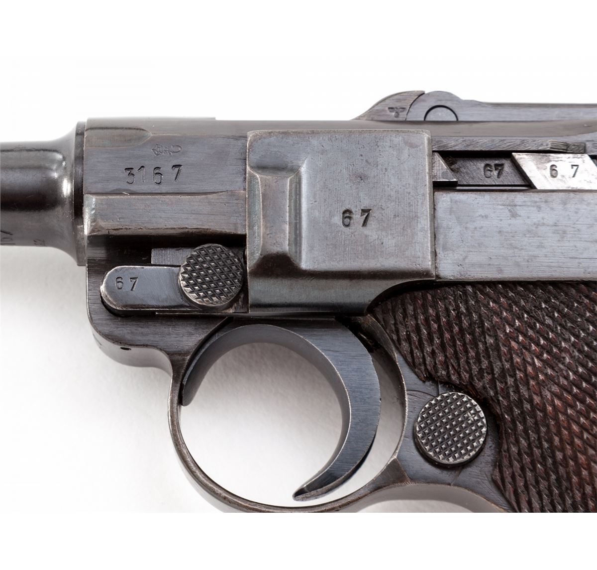 Mauser Banner/Dutch German Luger, #3167v, 9mm, 4'' barrel, salt blue finish, factory checkered walnut grips, and one matching numbered blue-bodied aluminum based magazine. Chamber dated 1940, Mauser Banner to central toggle, thumb safety marked ''Rust'' with downward pointing arrow to Safe position; ''(crown)/U'' commercial test marks, and ''(stick eagle)/655'' military acceptance marks. Considered very rare with approx. 600 mfg'd within this serial number range (2655v-3254v). Condition is fine with some touchup to external metal surfaces and brown toning to blue. Grips with mild flattening. Action is crisp, bore is fair to good. Est.: $2,500-$4,000. (C&R/PPT) (John Siroonian estate)