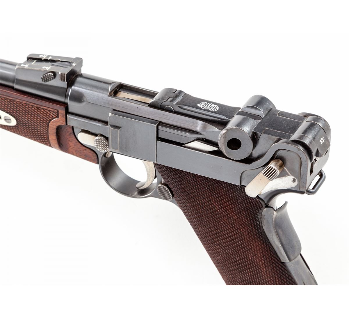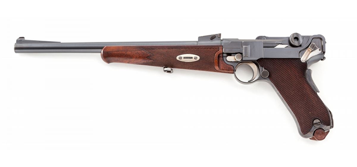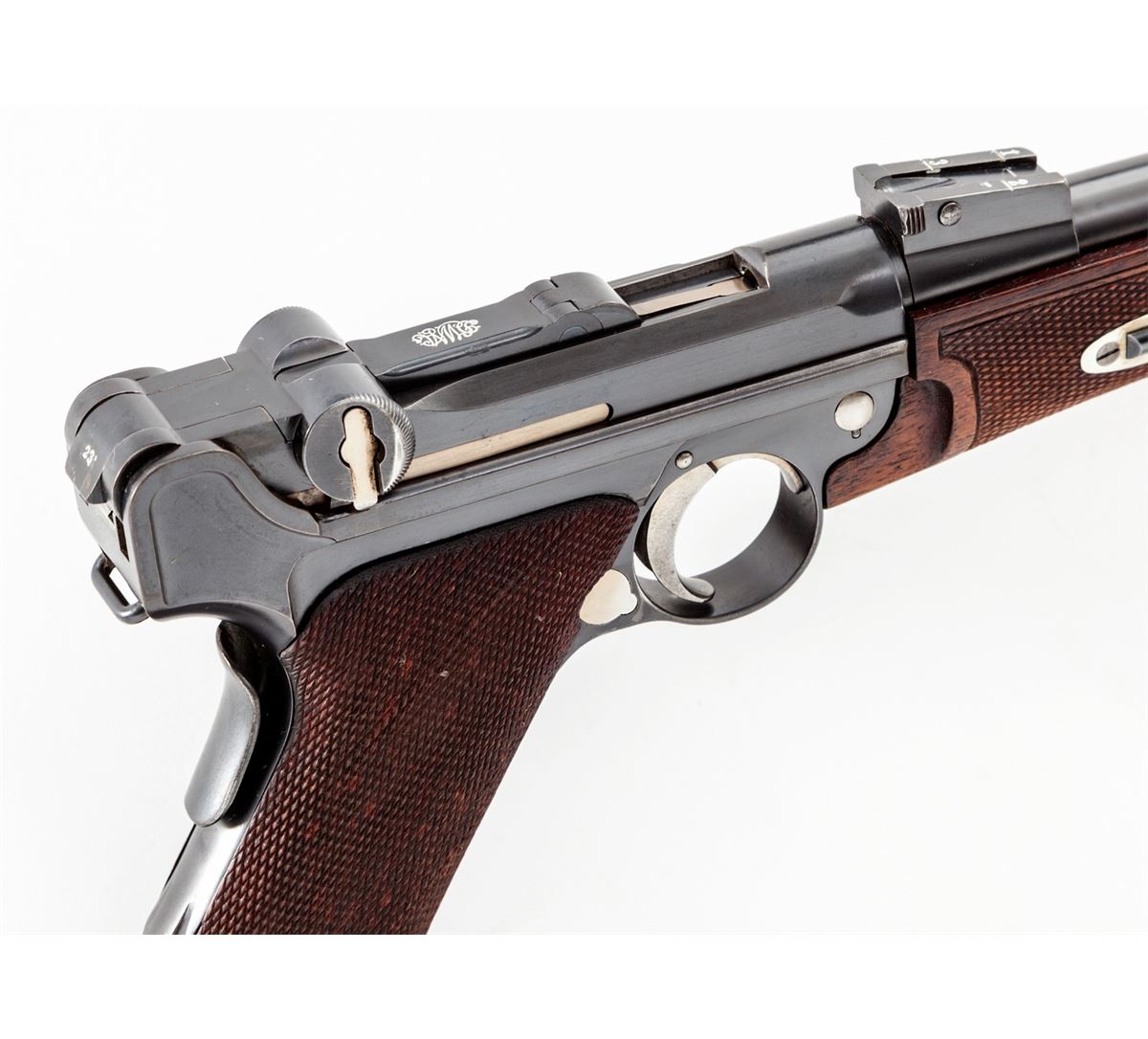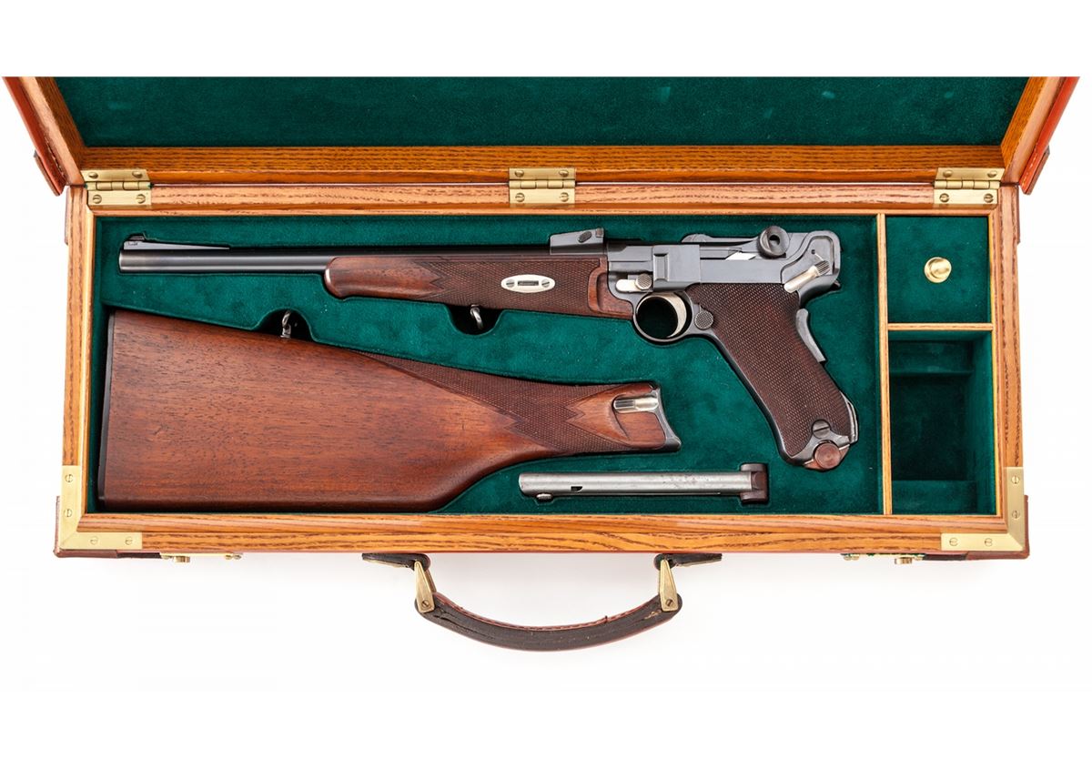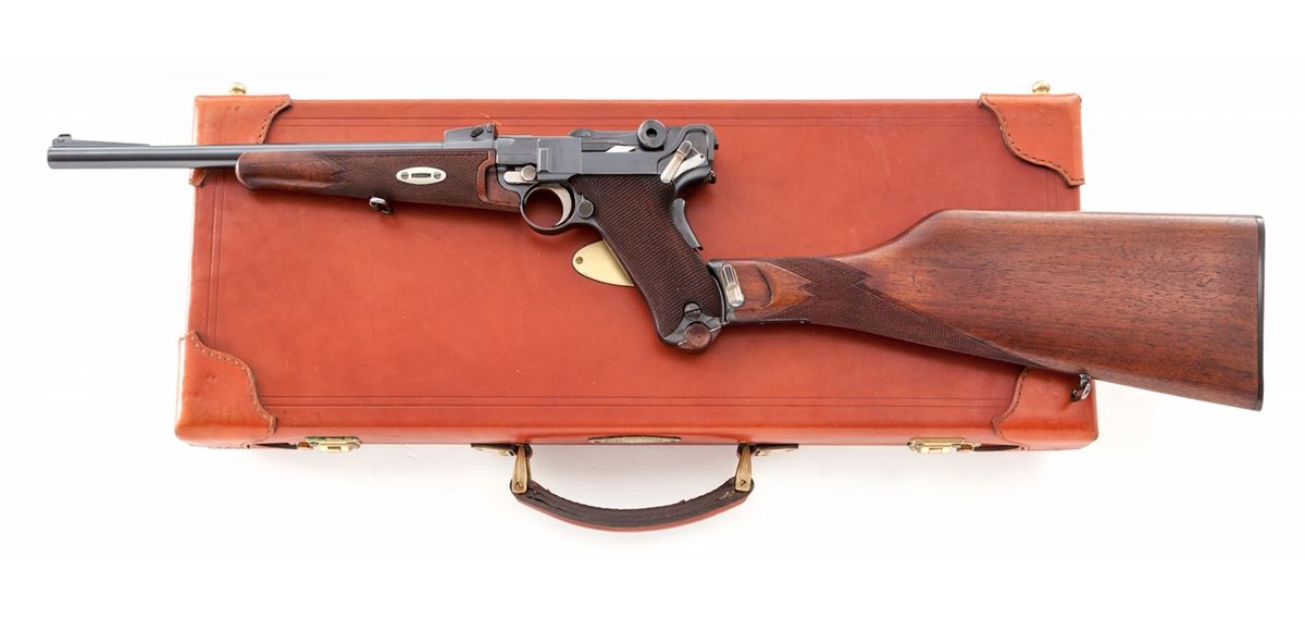 Model 1902 Luger Carbine, #24023, .30 Luger cal., 11-3/4'' barrel, blue finish with straw small parts, factory checkered walnut grips, with matching numbered checkered walnut shoulder stock, and two unmarked nickel-plated magazines with walnut bases, all in later mfg'd luggage case by Huey Gun Cases, MO. Blank chamber, DWM marked toggle, lower portion of thumb safety polished bright, 3-position adjustable rear sight, with long ramp front sight; scalloped toggle knobs and grip safety. Considered rare by collectors with approx. 2500 mfg'd in various sub-categories. Condition is excellent retaining approx. 97% lightly thinning rust blue, with minor thinning to left and right side of trigger and at base of safety. Front strap shows very mild toning. Action is crisp, bore is fine. All visible matching numbers. Grips and forend remain crisp and show some oil darkening. Stock is excellent. Newly made case with very minor handling marks to exterior. Est.: $15,000-$20,000. (C&R/PPT) (John Siroonian estate)