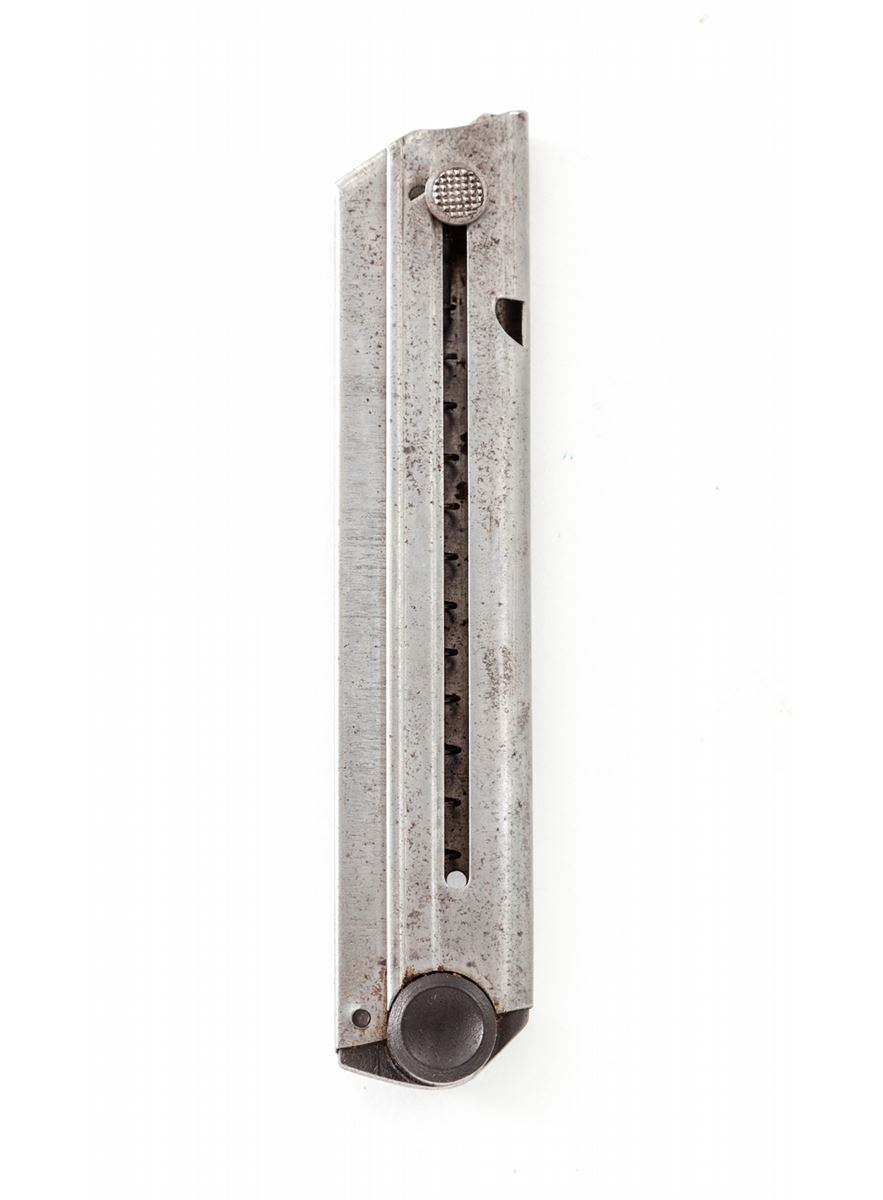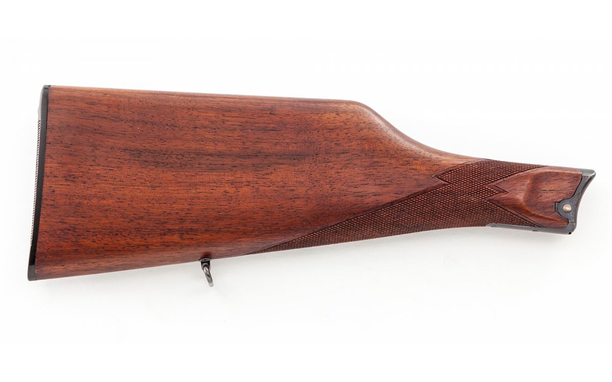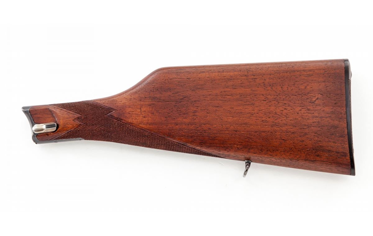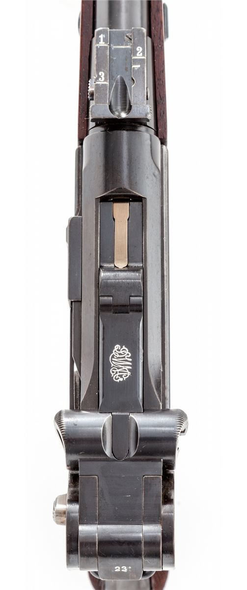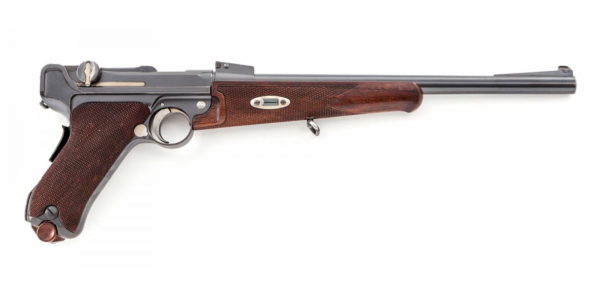 Model 1902 Luger Carbine, #24023, .30 Luger cal., 11-3/4'' barrel, blue finish with straw small parts, factory checkered walnut grips, with matching numbered checkered walnut shoulder stock, and two unmarked nickel-plated magazines with walnut bases, all in later mfg'd luggage case by Huey Gun Cases, MO. Blank chamber, DWM marked toggle, lower portion of thumb safety polished bright, 3-position adjustable rear sight, with long ramp front sight; scalloped toggle knobs and grip safety. Considered rare by collectors with approx. 2500 mfg'd in various sub-categories. Condition is excellent retaining approx. 97% lightly thinning rust blue, with minor thinning to left and right side of trigger and at base of safety. Front strap shows very mild toning. Action is crisp, bore is fine. All visible matching numbers. Grips and forend remain crisp and show some oil darkening. Stock is excellent. Newly made case with very minor handling marks to exterior. Est.: $15,000-$20,000. (C&R/PPT) (John Siroonian estate)