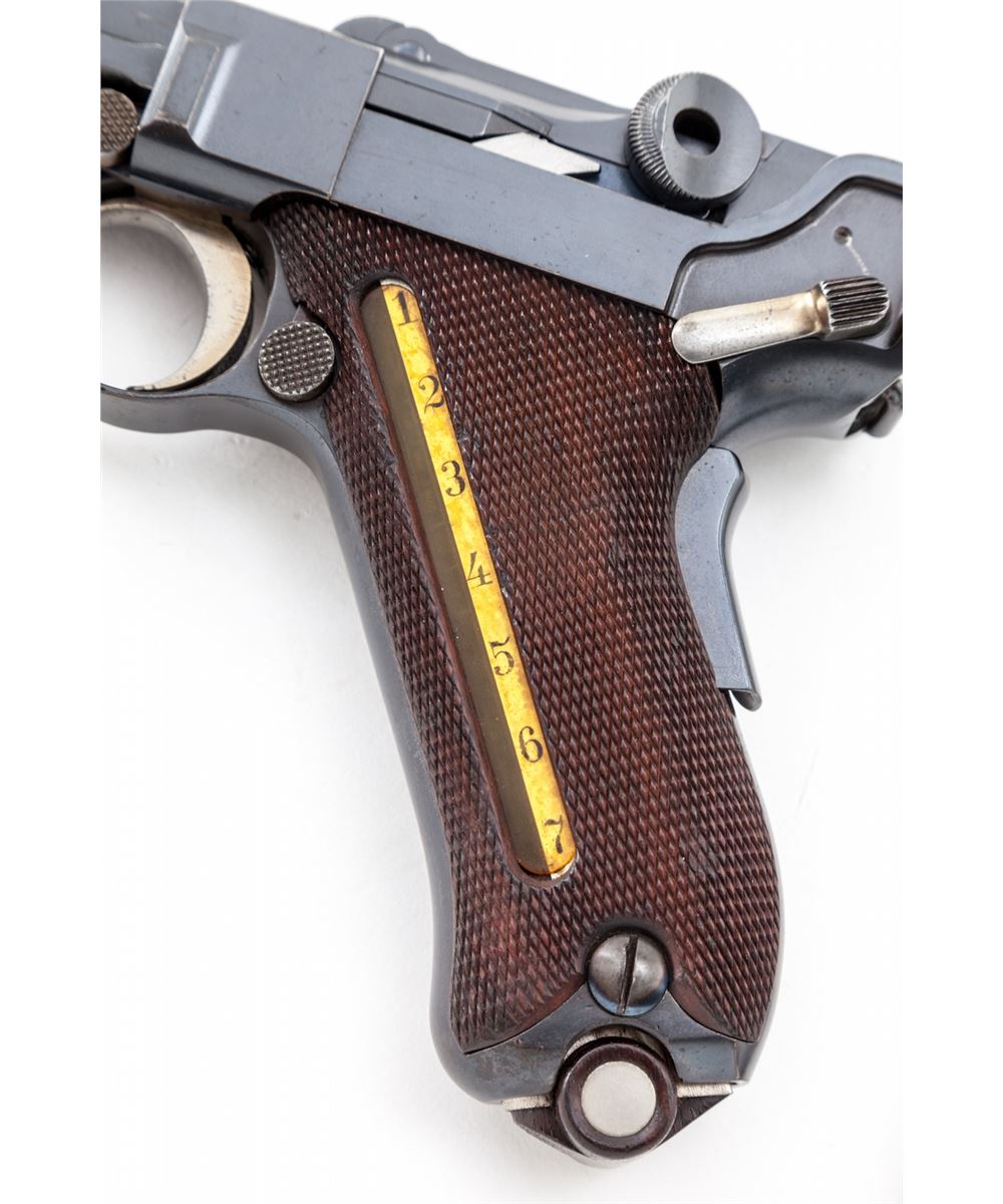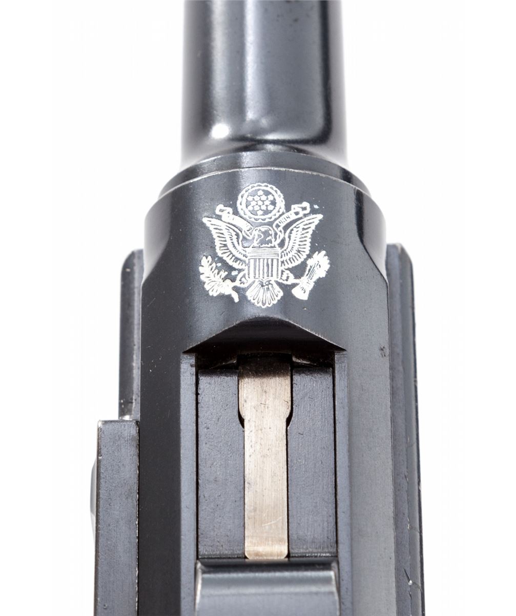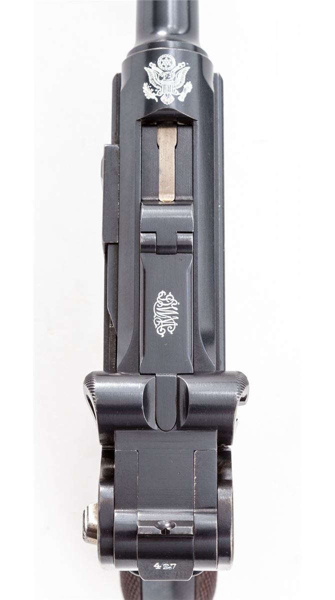 Extremely Rare 1902 American Eagle Cartridge Counter Luger, #22427, 9mm, 4'' barrel, blue finish with straw small parts, factory checkered walnut grips with cartridge counter metal strip and celluloid cover, and special nickel-plated magazine with extra slot and cartridge indicator; correct unmarked wooden base with metal insert. Top of chamber with American eagle, DWM to toggle link, serrated thumb safety lever, both positions are blued as is correct for this model. Considered extremely rare with only 50 mfg'd between serial numbers 22401-22450. After the 1900 American Eagle was tested by the U.S. Government, the low stopping power of the 7.65mm cartridge was a great concern. This up-calibered version, with what is known as the ''Powell Indicating Device'', was submitted in hopes of securing a U.S. military contract. Condition is near excellent with thinning at muzzle. Front sight blade and grip screws have toned somewhat gray. Grips remain crisp with only light flattening. Thinning to straw colors, crisp action, and bright bore. Est.: $20,000-$30,000. (C&R/PPT) (John Siroonian estate)
