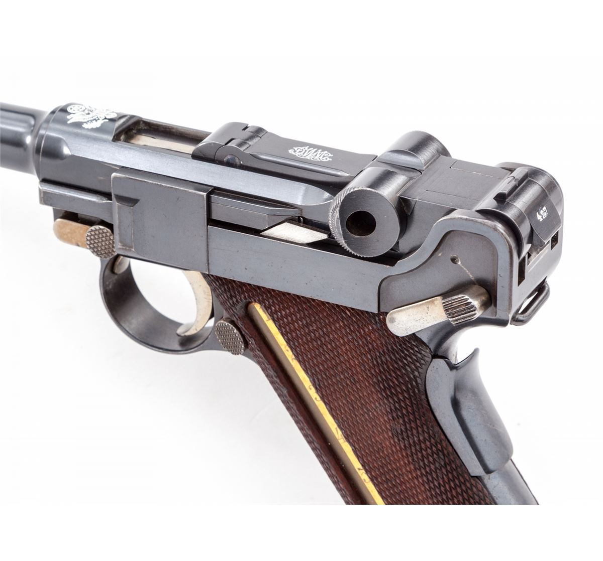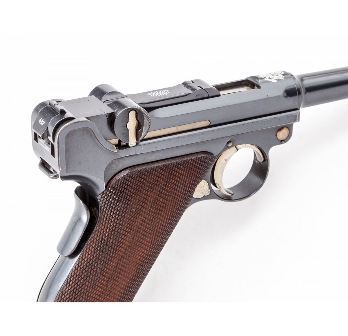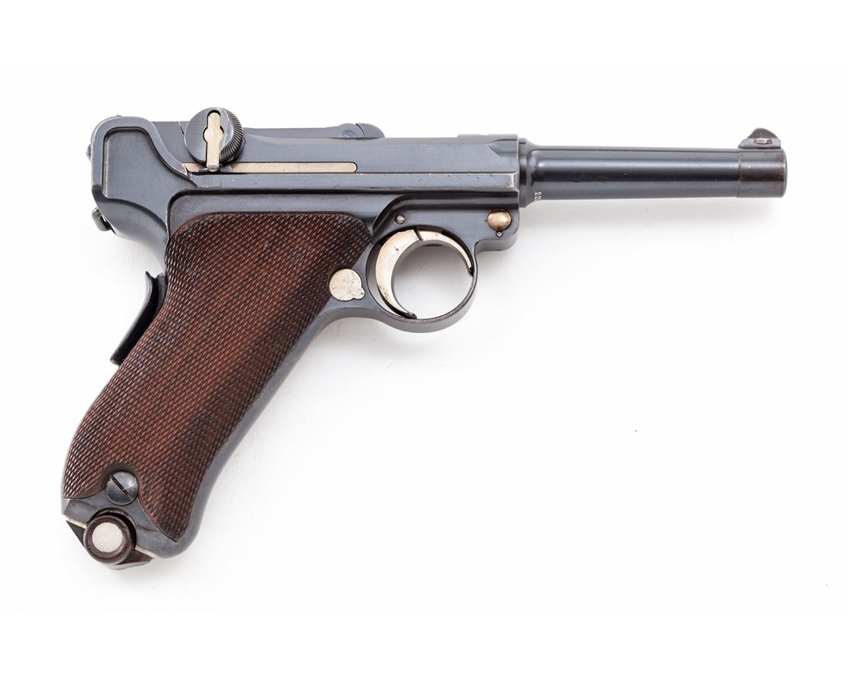 Extremely Rare 1902 American Eagle Cartridge Counter Luger, #22427, 9mm, 4'' barrel, blue finish with straw small parts, factory checkered walnut grips with cartridge counter metal strip and celluloid cover, and special nickel-plated magazine with extra slot and cartridge indicator; correct unmarked wooden base with metal insert. Top of chamber with American eagle, DWM to toggle link, serrated thumb safety lever, both positions are blued as is correct for this model. Considered extremely rare with only 50 mfg'd between serial numbers 22401-22450. After the 1900 American Eagle was tested by the U.S. Government, the low stopping power of the 7.65mm cartridge was a great concern. This up-calibered version, with what is known as the ''Powell Indicating Device'', was submitted in hopes of securing a U.S. military contract. Condition is near excellent with thinning at muzzle. Front sight blade and grip screws have toned somewhat gray. Grips remain crisp with only light flattening. Thinning to straw colors, crisp action, and bright bore. Est.: $20,000-$30,000. (C&R/PPT) (John Siroonian estate)
