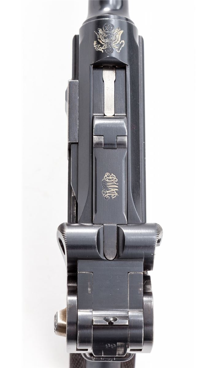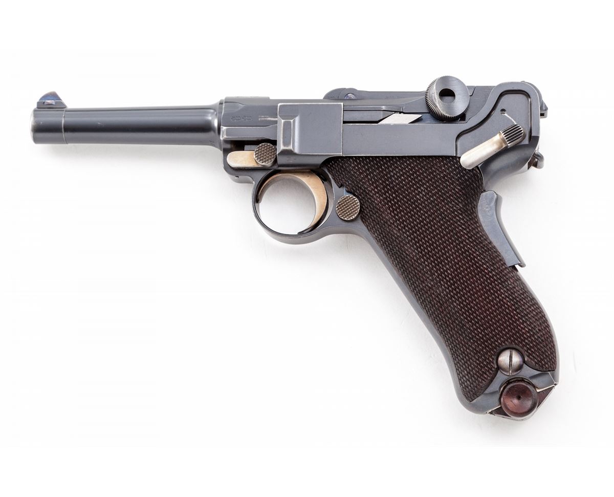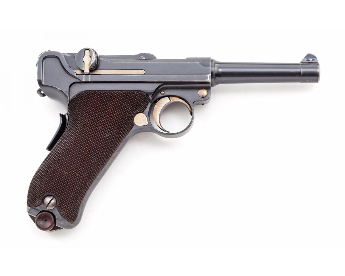 1902 American Eagle Fat Barrel Luger, #23199, 9mm, 4'' barrel, blue finish with straw small parts, factory checkered walnut grips, and one nickel-plated magazine with wooden base marked ''CAL 9M/M''. Frame beneath serial number marked ''Germany'', American eagle over chamber, DWM to toggle link, BUG proofmarks, with grip safety, scalloped toggle knobs, and lower portion of safety polished bright. Condition is excellent retaining approx. 97% lightly thinning blue. Grips with minor flattening. Action is crisp, bore is bright, with some thinning and toning to front and backstrap. All visible matching numbers. Est.: $7,500-$10,000. (C&R/PPT) (John Siroonian estate)