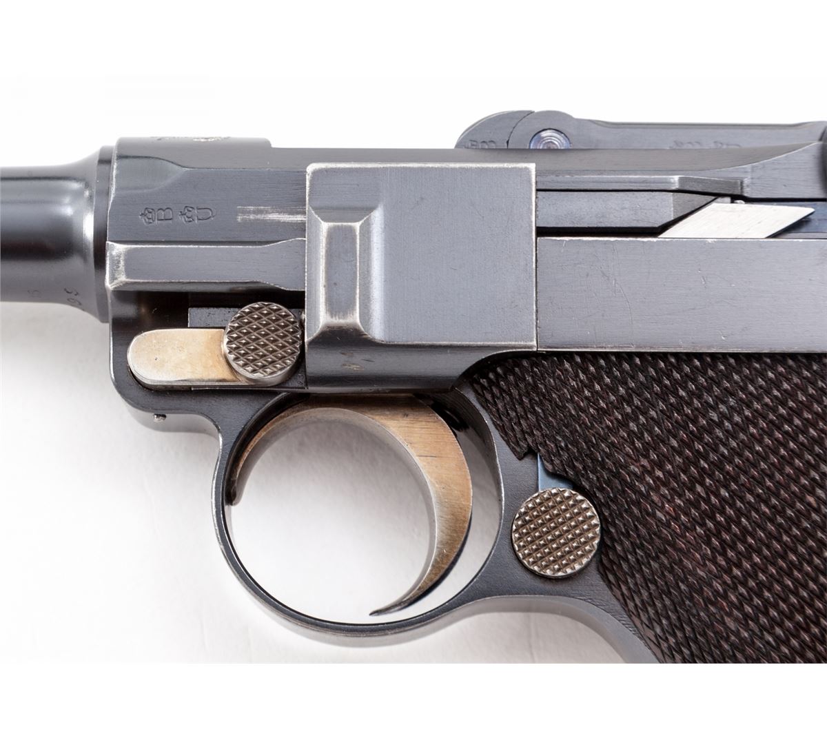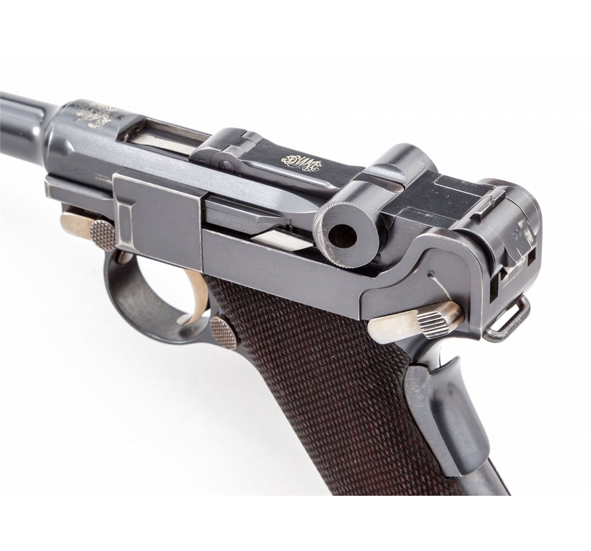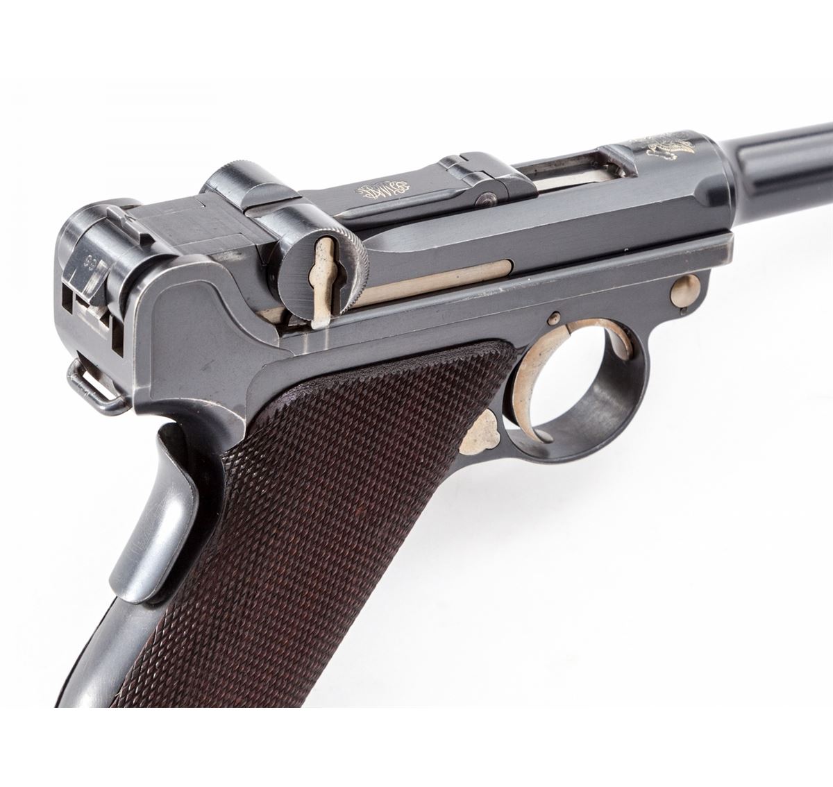 1902 American Eagle Fat Barrel Luger, #23199, 9mm, 4'' barrel, blue finish with straw small parts, factory checkered walnut grips, and one nickel-plated magazine with wooden base marked ''CAL 9M/M''. Frame beneath serial number marked ''Germany'', American eagle over chamber, DWM to toggle link, BUG proofmarks, with grip safety, scalloped toggle knobs, and lower portion of safety polished bright. Condition is excellent retaining approx. 97% lightly thinning blue. Grips with minor flattening. Action is crisp, bore is bright, with some thinning and toning to front and backstrap. All visible matching numbers. Est.: $7,500-$10,000. (C&R/PPT) (John Siroonian estate)
