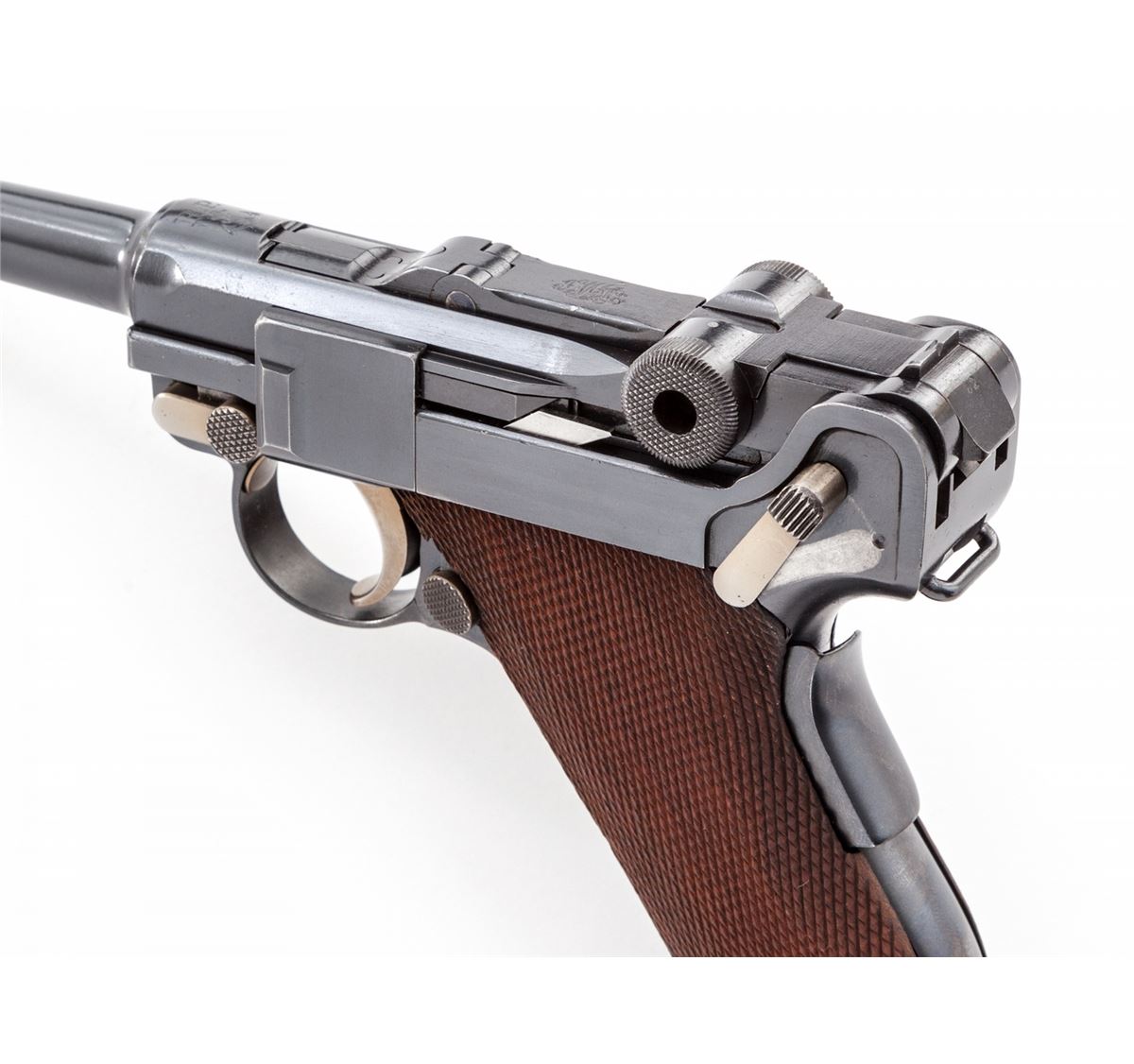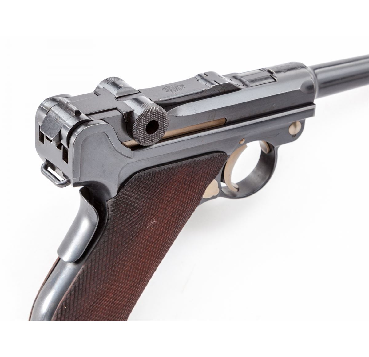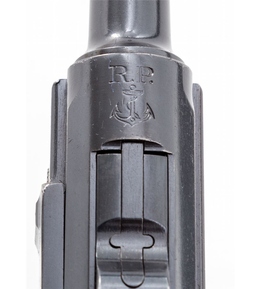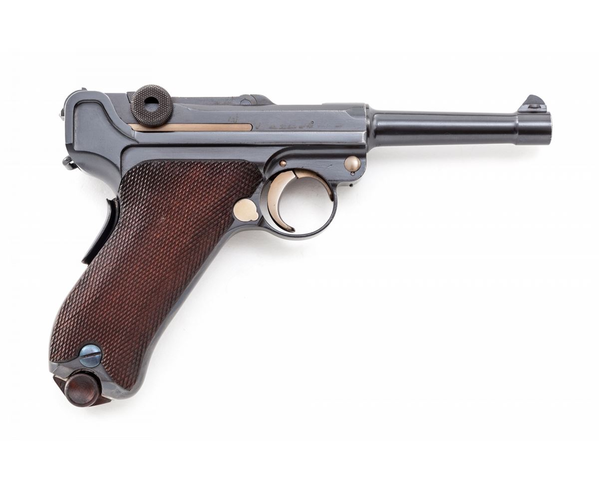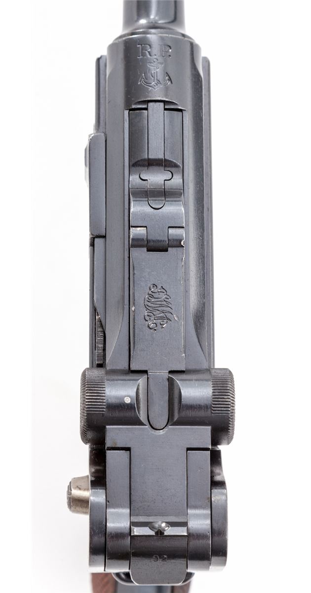 Very Rare 1906 Republic of Portugal Navy Luger, #592, 9mm, 4'' barrel, blue finish with straw small parts, factory checkered walnut grips, and one correct nickel-plated magazine with wood base marked ''CAL 9M/M''. Chamber area marked ''RP(anchor)'', central toggle link marked DWM, extractor marked ''Carregada'', thumb safety with lower position polished bright. Considered quite scarce with less than 1000 mfg'd, numbered between 1-1000. Condition is excellent showing light restoration and rust blue touchup, being near imperceptible. Grips remain crisp and show evidence of re-staining. Action is crisp, bore is mirror bright with very light carbon spotting to bright area of crown. All visible matching numbers. Est.: $8,000-$12,000. (C&R/PPT) (John Siroonian estate)