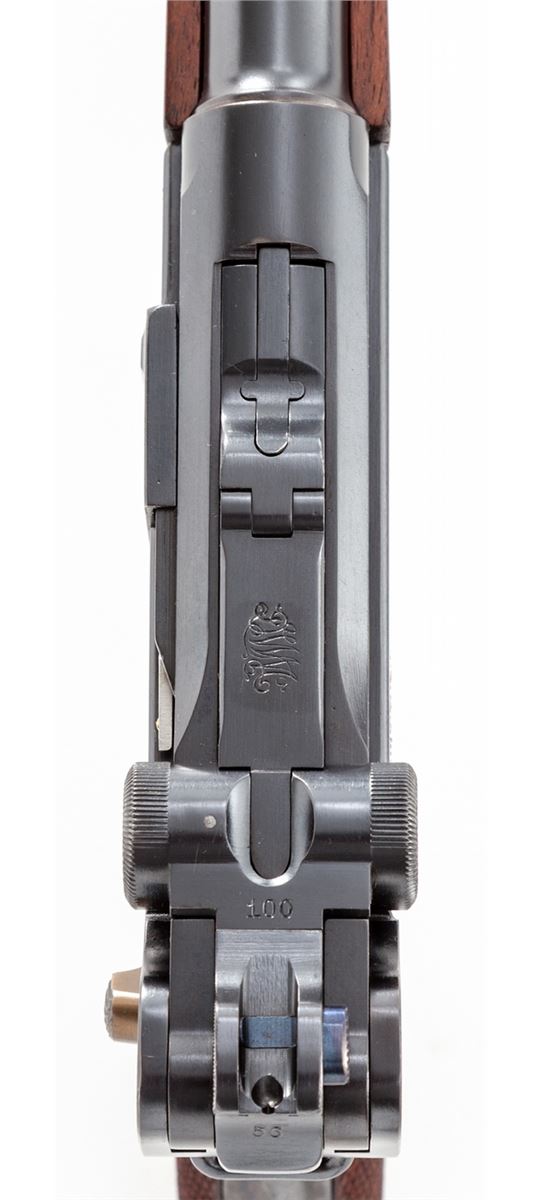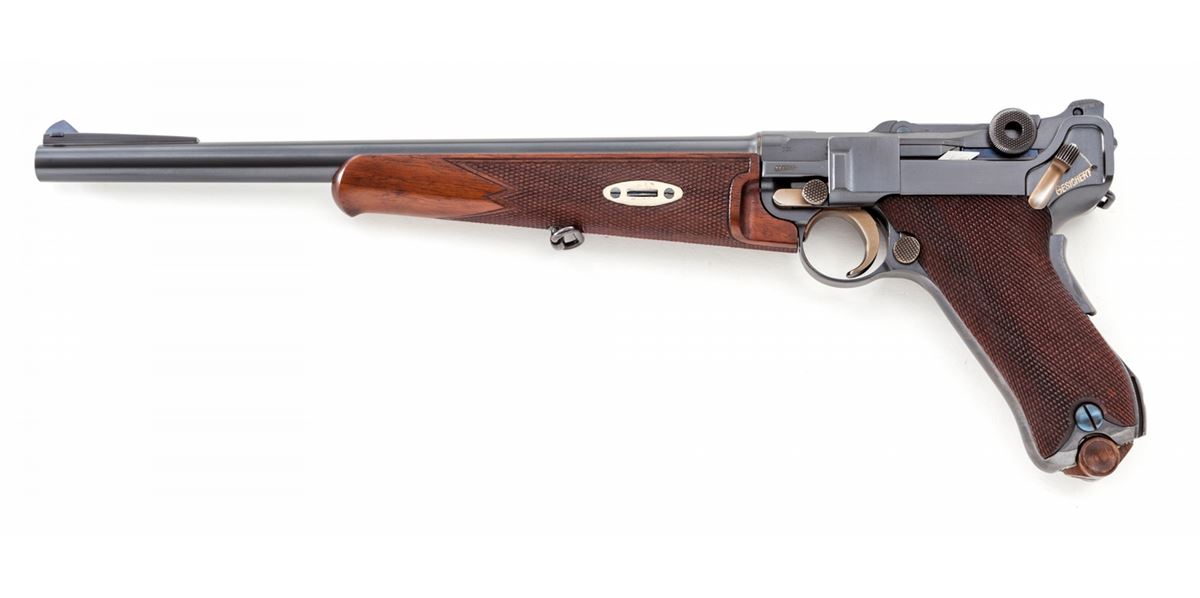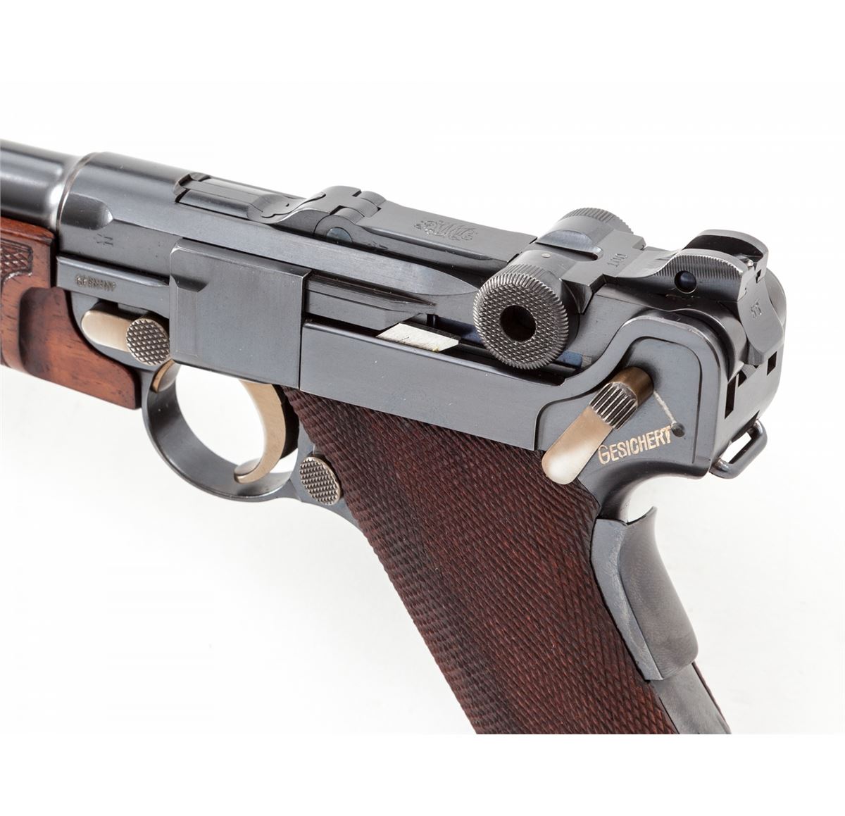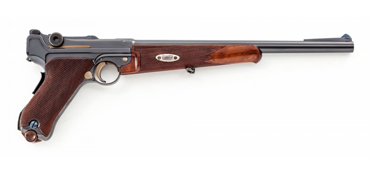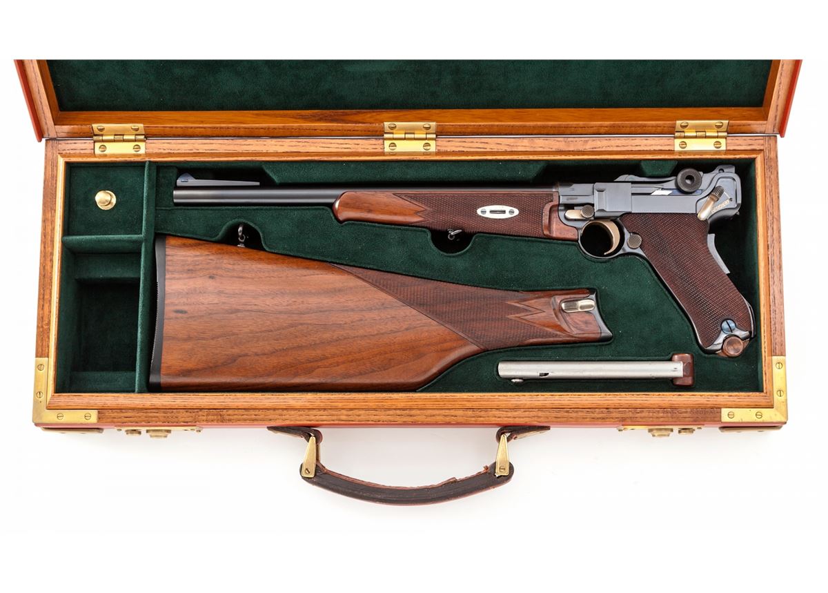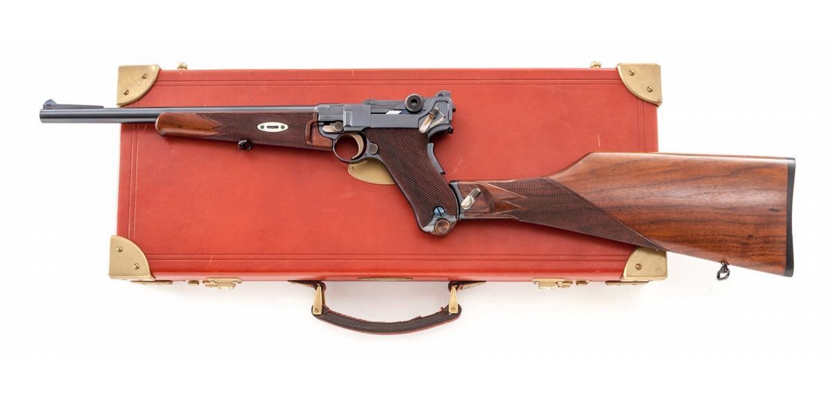 1920 Navy Commercial Naval Luger Carbine, #56, 9mm, 11-3/4'' barrel, blue finish with straw small parts, factory checkered walnut grips, forend, and stock; with one unmarked tin-plated magazine with wooden base, and the other marked ''CAL 9M/M''. All nicely fitted in a modern case by Huey Gun Cases, MO. Unmarked chamber, DWM marked toggle, two-position rear sight, with ramped blade front sight; thumb safety marked ''Gesichert'' in lower position, ''Geladen'' marked extractor; round checkered toggle knob and grip safety, with ''(crown)/N'' proofmarks and ''Germany'' stamped through the finish to forward left edge of receiver. Considered incredibly rare by collectors with only a few known. Condition is excellent retaining approx. 98% blue with minor thinning to straw small parts. Crisp checkering throughout, with all matching small parts except stock attaching iron, which is unnumbered. Action is crisp, bore is bright. Case shows only the lightest marks from handling. Est.: $10,000-$15,000. (C&R/PPT) (John Siroonian estate)