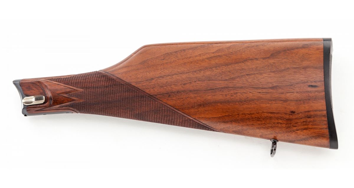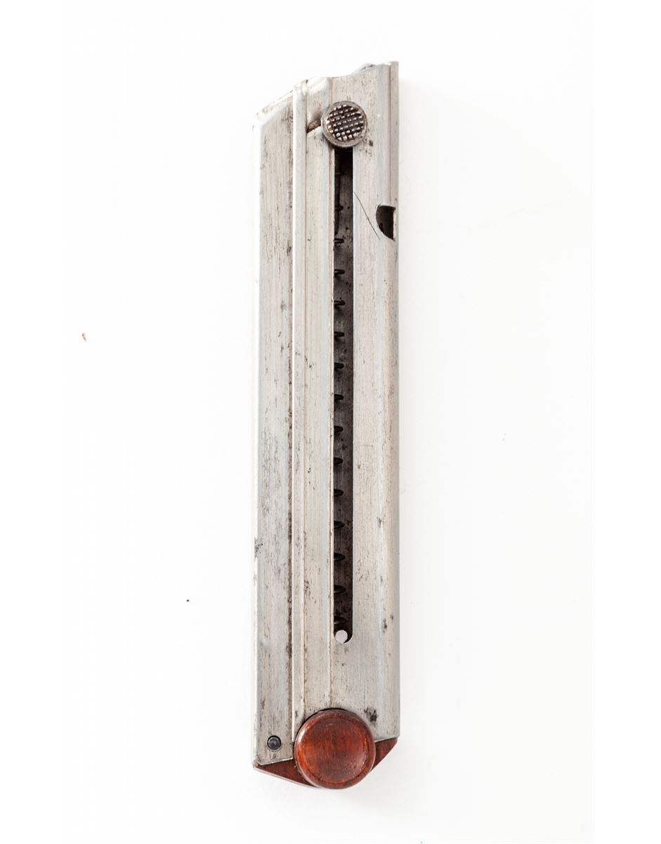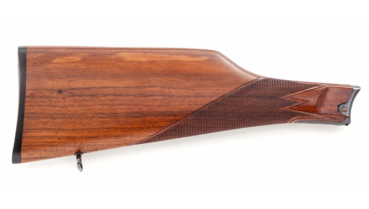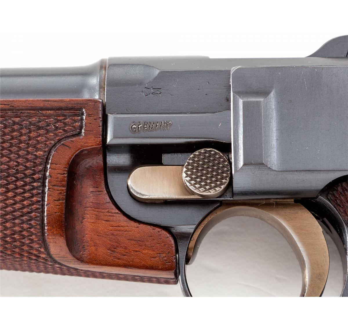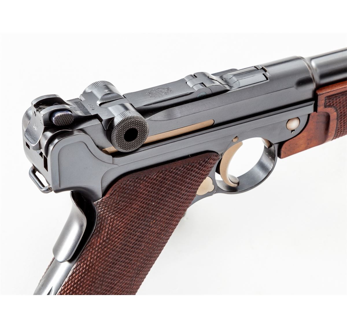 1920 Navy Commercial Naval Luger Carbine, #56, 9mm, 11-3/4'' barrel, blue finish with straw small parts, factory checkered walnut grips, forend, and stock; with one unmarked tin-plated magazine with wooden base, and the other marked ''CAL 9M/M''. All nicely fitted in a modern case by Huey Gun Cases, MO. Unmarked chamber, DWM marked toggle, two-position rear sight, with ramped blade front sight; thumb safety marked ''Gesichert'' in lower position, ''Geladen'' marked extractor; round checkered toggle knob and grip safety, with ''(crown)/N'' proofmarks and ''Germany'' stamped through the finish to forward left edge of receiver. Considered incredibly rare by collectors with only a few known. Condition is excellent retaining approx. 98% blue with minor thinning to straw small parts. Crisp checkering throughout, with all matching small parts except stock attaching iron, which is unnumbered. Action is crisp, bore is bright. Case shows only the lightest marks from handling. Est.: $10,000-$15,000. (C&R/PPT) (John Siroonian estate)