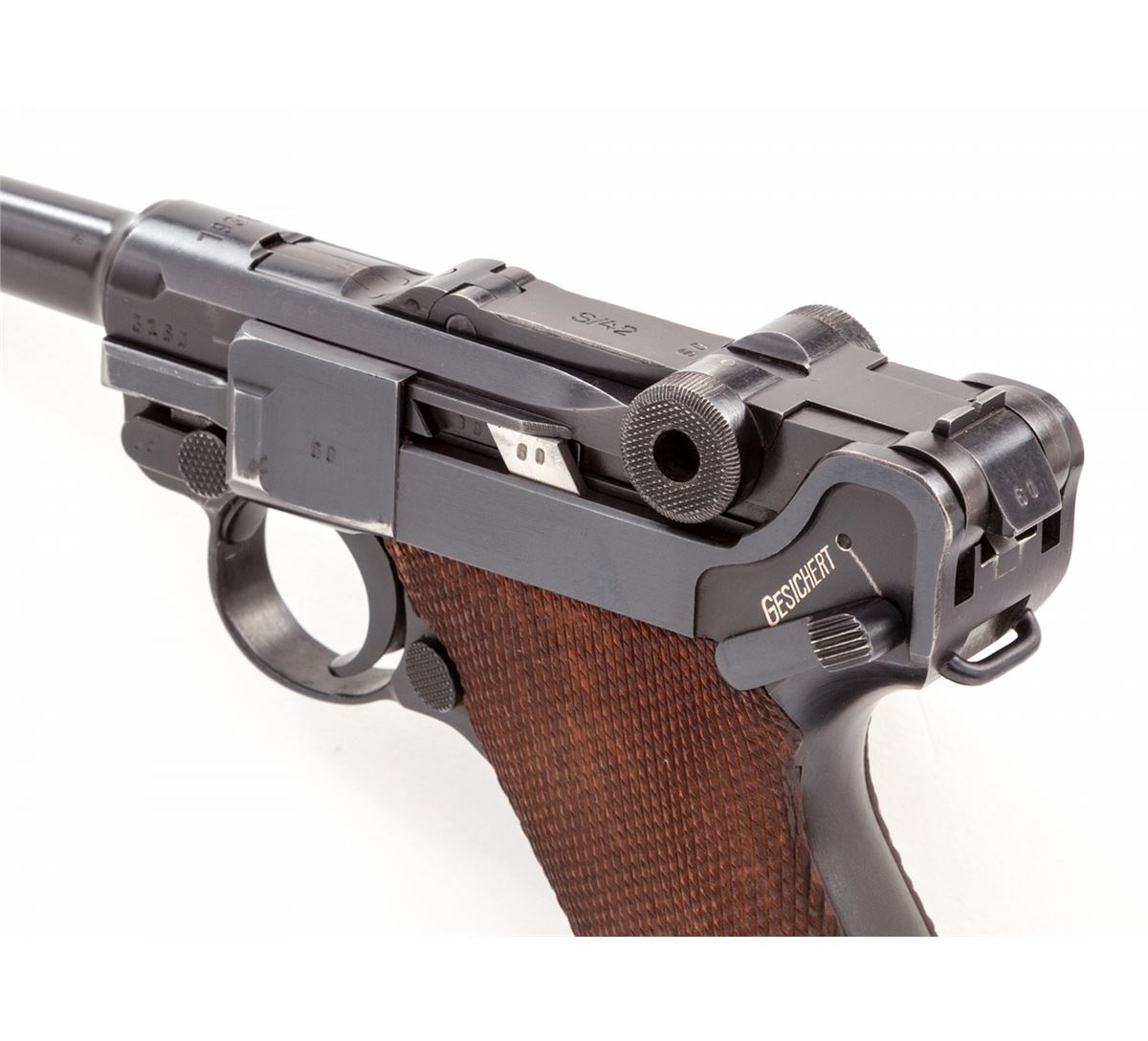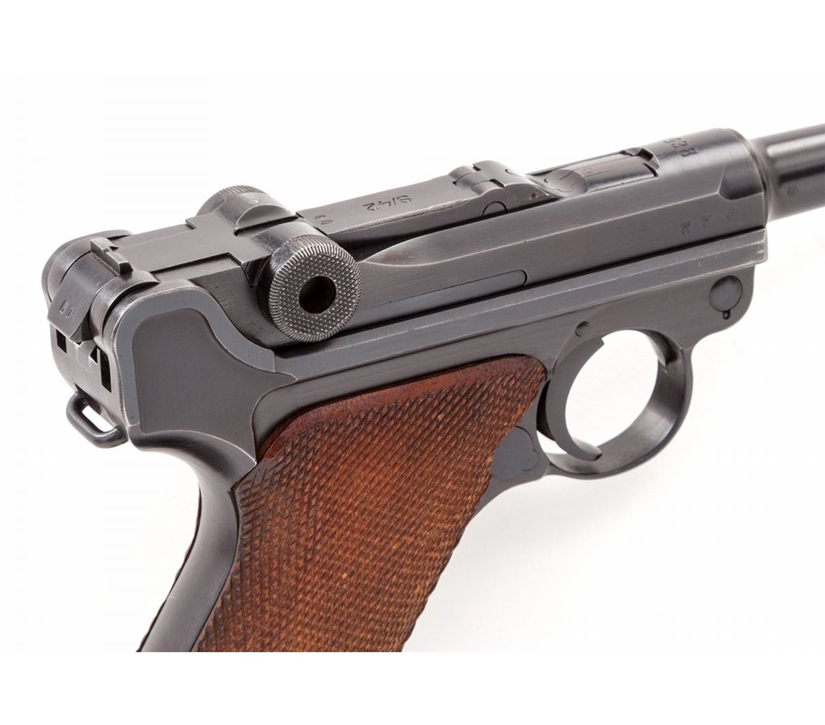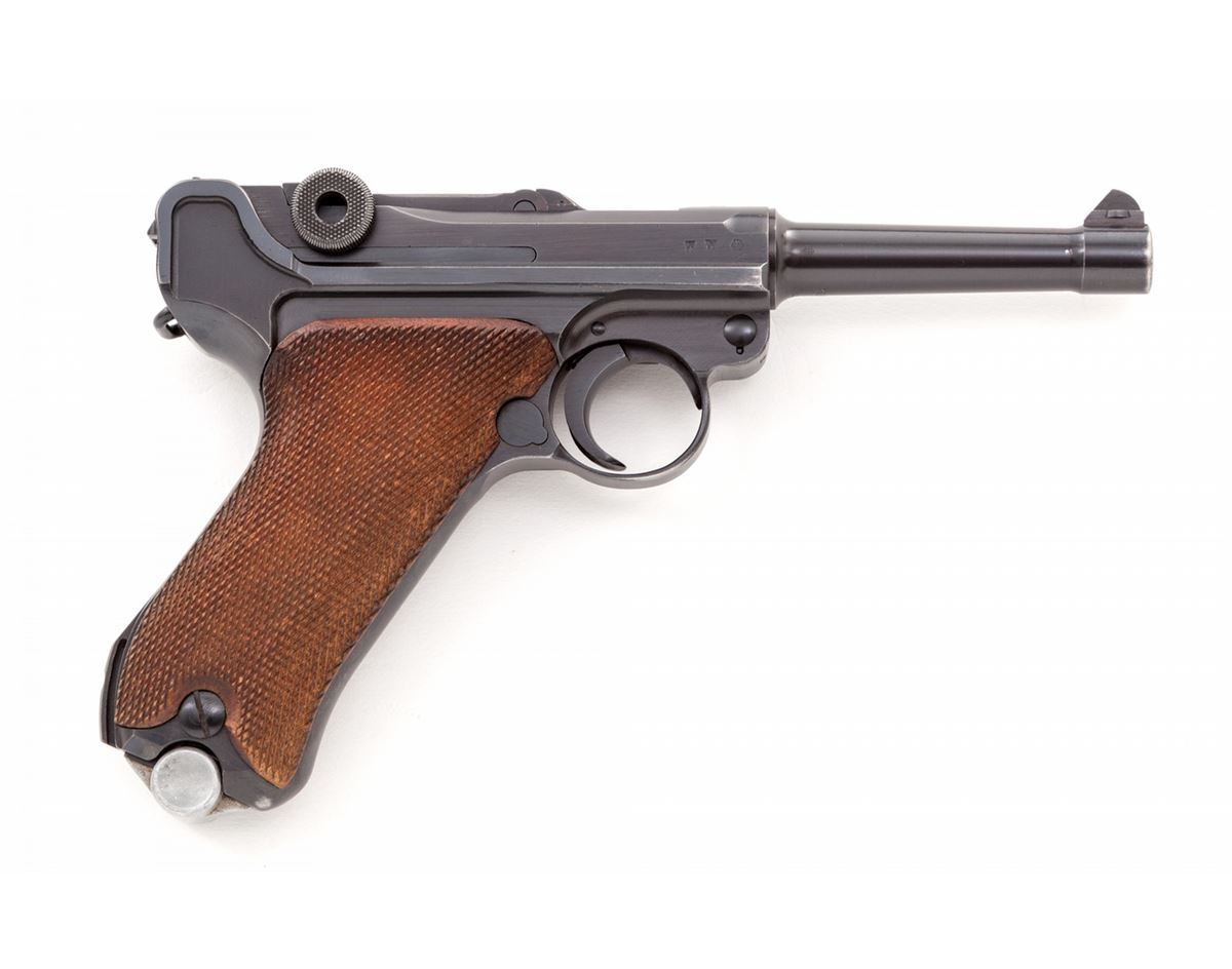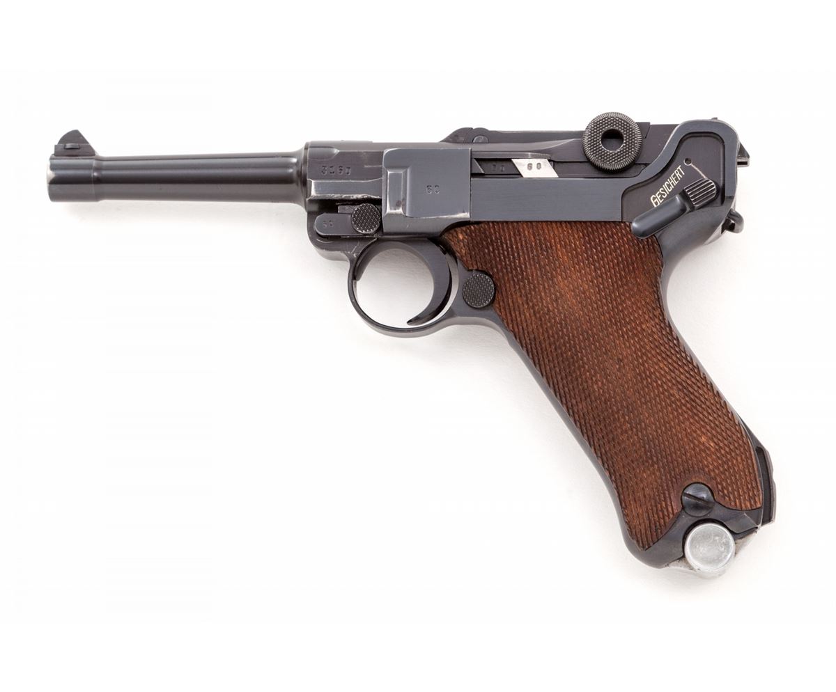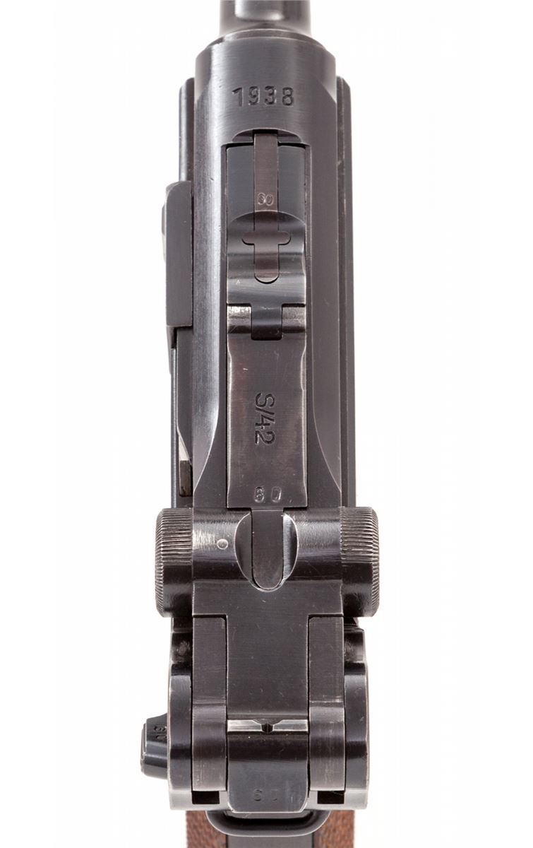 Pre-WWII Nazi Era P.08 Luger Semi-Automatic Pistol, #3160c, 9mm, 4'' barrel, original factory blue finish, checkered walnut grips, with matching aluminum-based blue bodied magazine. Chamber marked 1938, toggle marked ''S/42''. Condition is excellent with light edgewear at muzzle, sideplate, and in actioning areas. Grips and action are crisp, bore is mirror bright. Est.: $1,800-$2,400. (C&R)