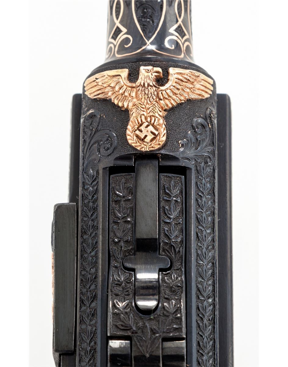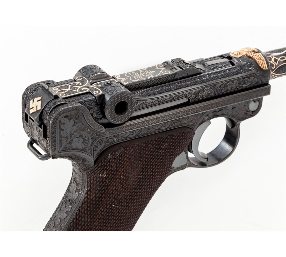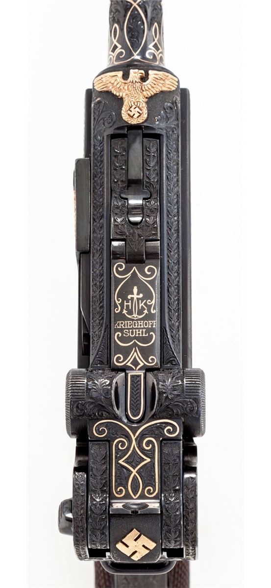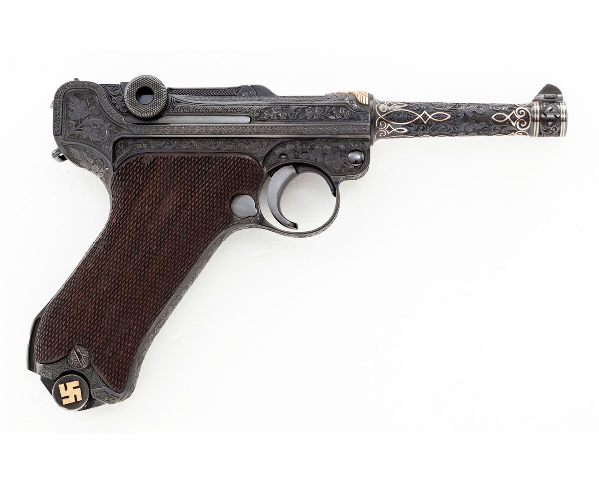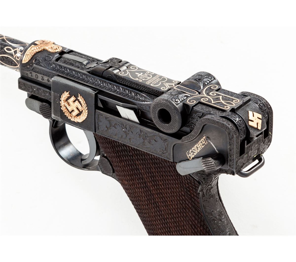 Relief Engraved and Gold Inlaid Commercial ''P'' Series Krieghoff Luger, #1034p, 9mm, 4'' barrel, salt blue finish, factory checkered walnut grips, and one blued wraparound bodied magazine with unnumbered blue steel base. Pistol shows approx. 90% coverage with relief engraved oakleaf motif pattern throughout with 18K gold applied wreath and swastika to sideplate, Nazi party eagle in gold to chamber area, scrolls with gold inlay to top of toggle area, as well as Krieghoff logo, name and address in gold. Rearmost portion of toggle link behind rear sight and dished round portions of magazine with gold applied swastikas. Barrel is profusely inlaid with double stripe borders at muzzle, with additional scrolling at muzzle and breach end. The only areas lacking coverage are the trigger, takedown latch, thumb safety and the area immediately behind it. Several embellished commercial Krieghoffs are known to have been presented to S.A. Gauleiters. It is also interesting to note that Hermann Goering had a very close relationship with the Krieghoff family and would periodically request such pistols for personal presentation. Condition is excellent as possibly externally refinished at one point. Grips remain crisp, bore with moderate frosting in grooves. Est.: $18,000-$24,000. (C&R/PPT) (John Siroonian estate)