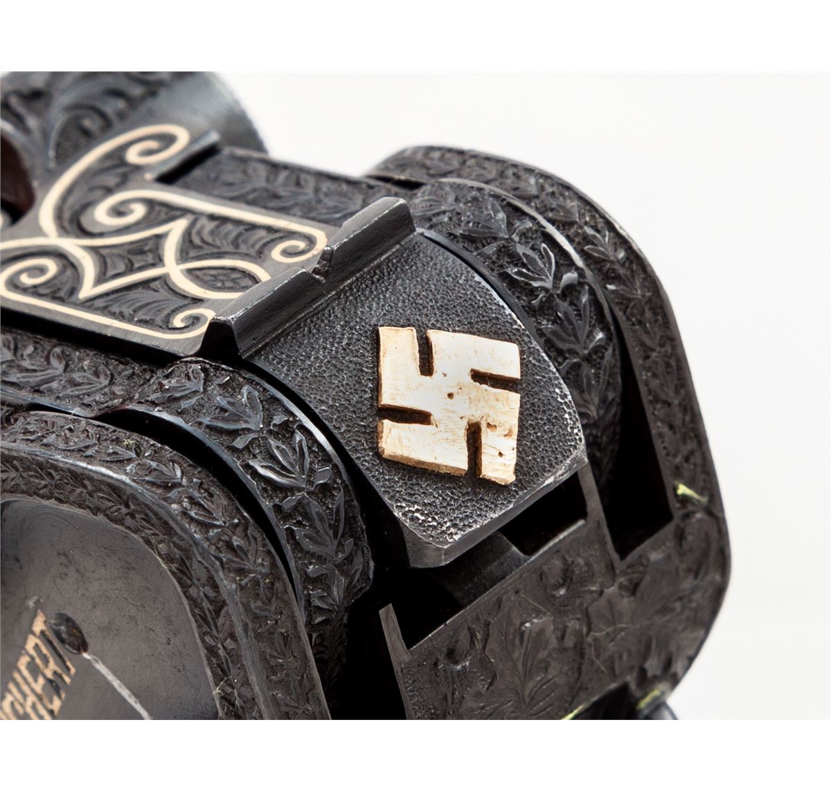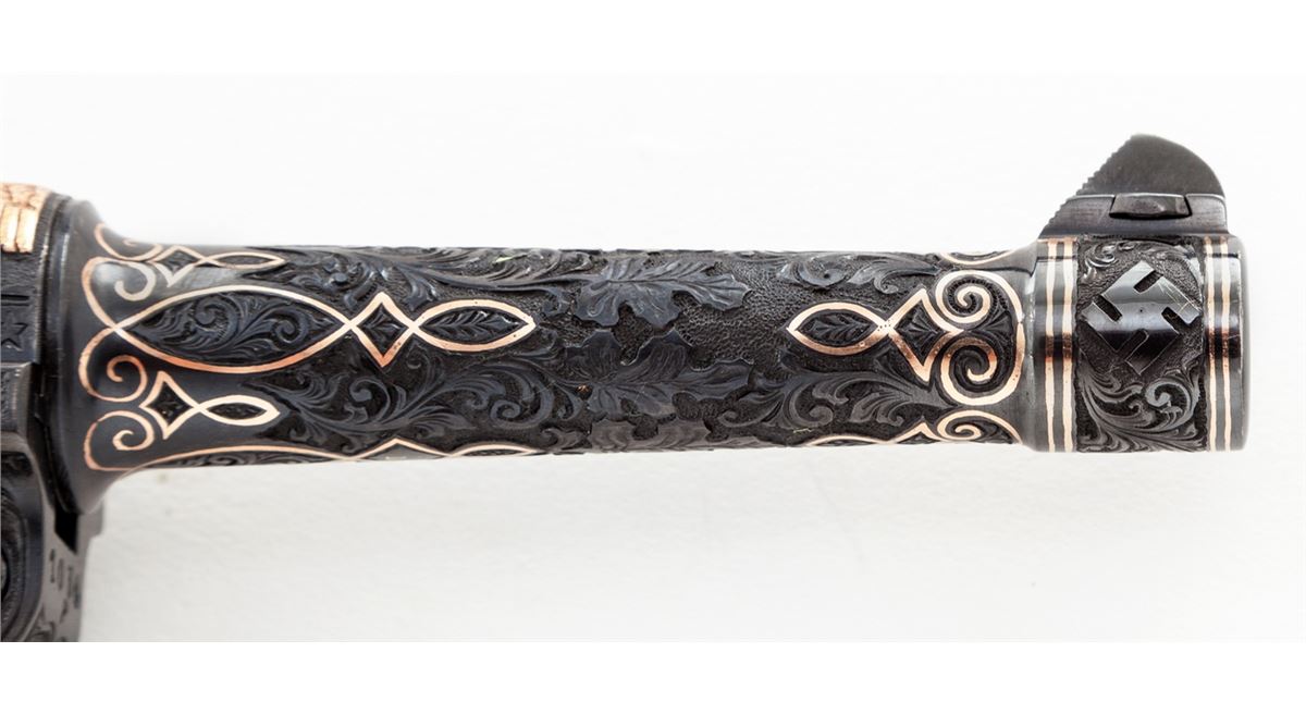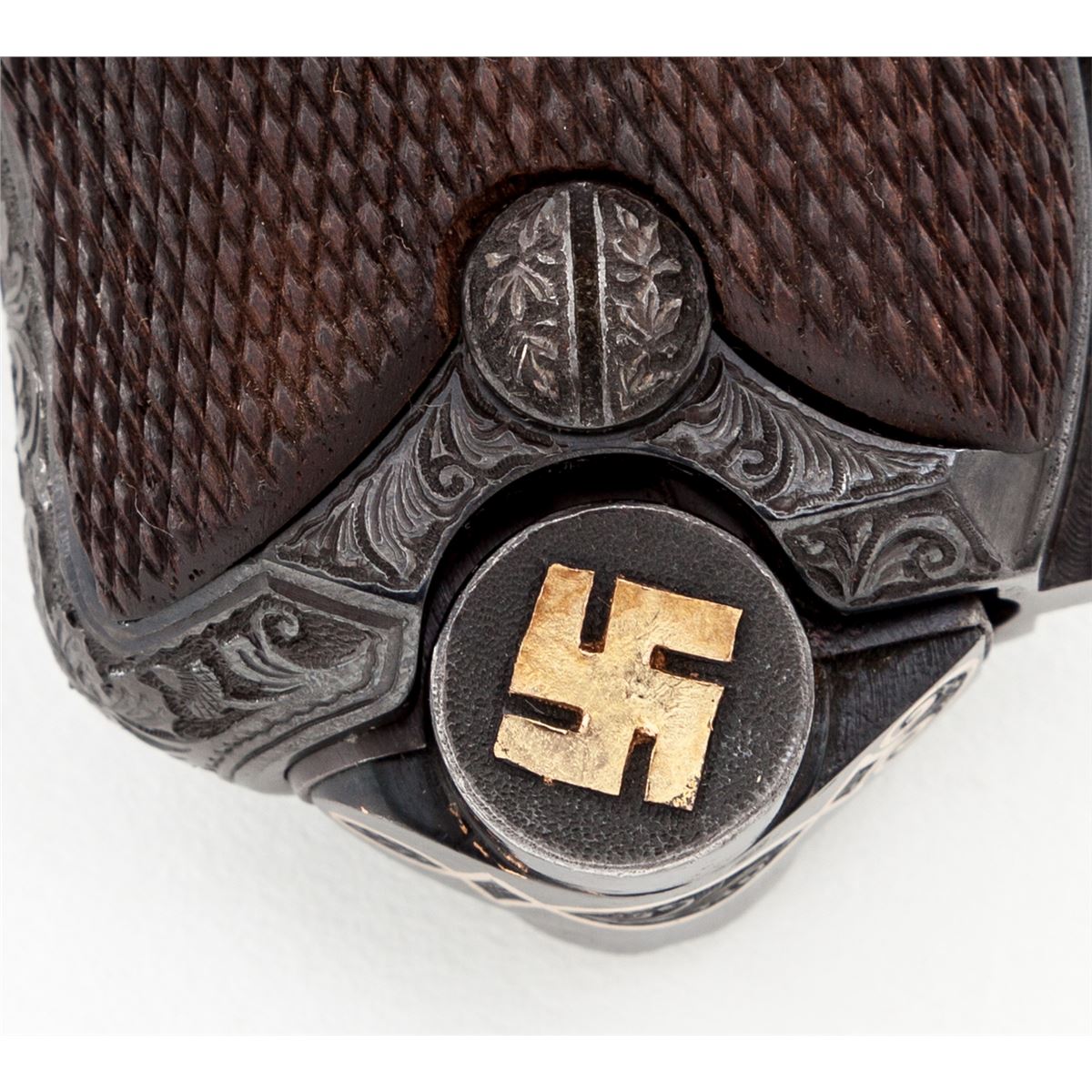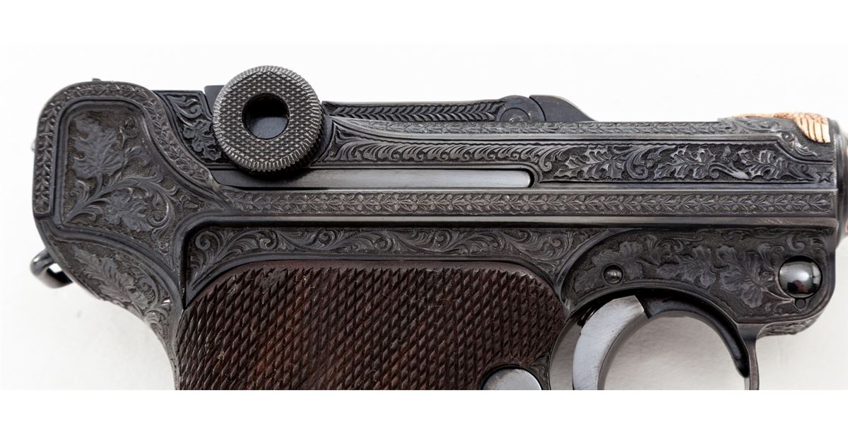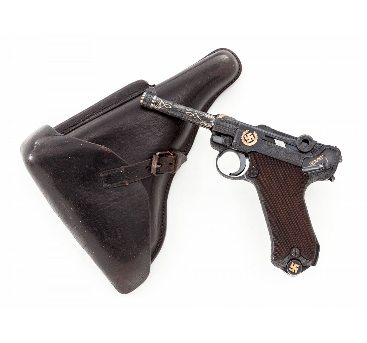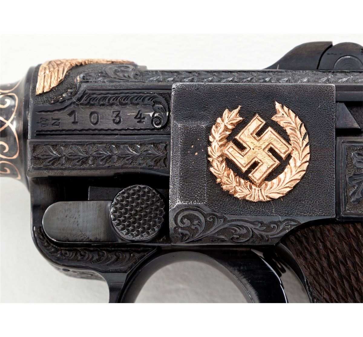 Relief Engraved and Gold Inlaid Commercial ''P'' Series Krieghoff Luger, #1034p, 9mm, 4'' barrel, salt blue finish, factory checkered walnut grips, and one blued wraparound bodied magazine with unnumbered blue steel base. Pistol shows approx. 90% coverage with relief engraved oakleaf motif pattern throughout with 18K gold applied wreath and swastika to sideplate, Nazi party eagle in gold to chamber area, scrolls with gold inlay to top of toggle area, as well as Krieghoff logo, name and address in gold. Rearmost portion of toggle link behind rear sight and dished round portions of magazine with gold applied swastikas. Barrel is profusely inlaid with double stripe borders at muzzle, with additional scrolling at muzzle and breach end. The only areas lacking coverage are the trigger, takedown latch, thumb safety and the area immediately behind it. Several embellished commercial Krieghoffs are known to have been presented to S.A. Gauleiters. It is also interesting to note that Hermann Goering had a very close relationship with the Krieghoff family and would periodically request such pistols for personal presentation. Condition is excellent as possibly externally refinished at one point. Grips remain crisp, bore with moderate frosting in grooves. Est.: $18,000-$24,000. (C&R/PPT) (John Siroonian estate)