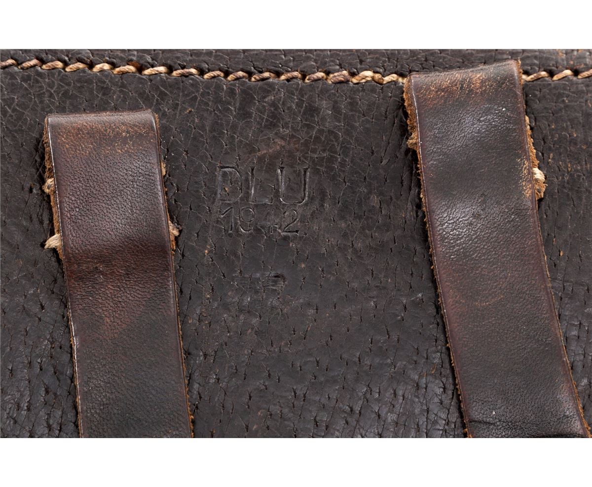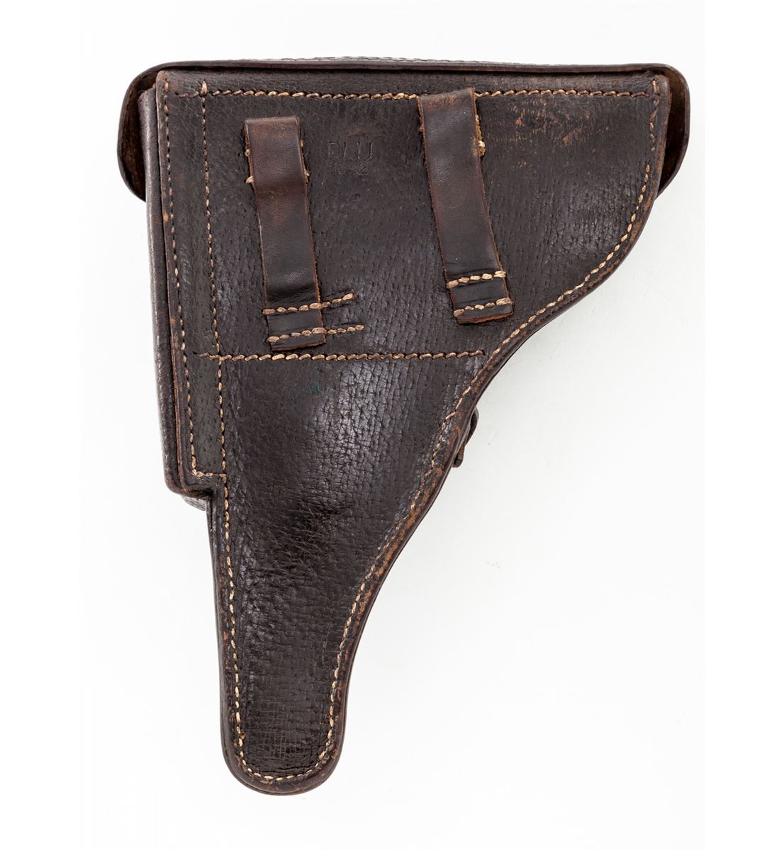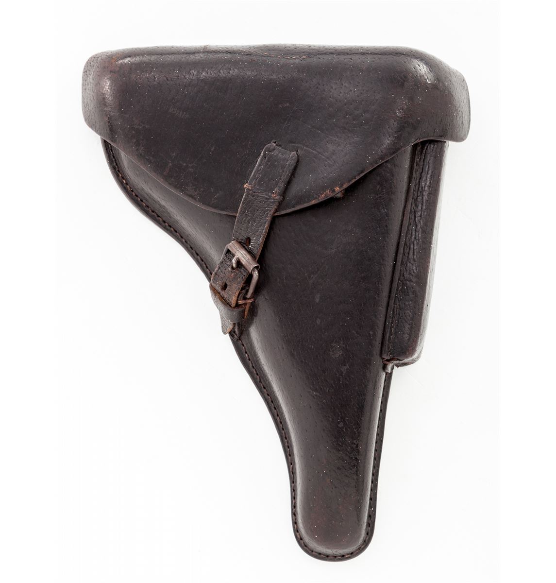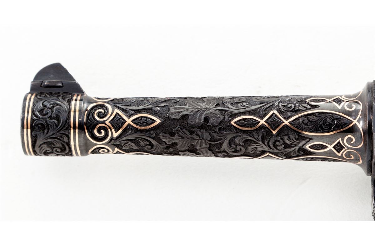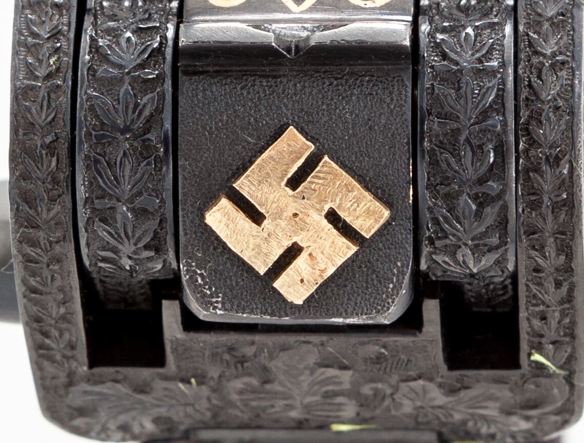 Relief Engraved and Gold Inlaid Commercial ''P'' Series Krieghoff Luger, #1034p, 9mm, 4'' barrel, salt blue finish, factory checkered walnut grips, and one blued wraparound bodied magazine with unnumbered blue steel base. Pistol shows approx. 90% coverage with relief engraved oakleaf motif pattern throughout with 18K gold applied wreath and swastika to sideplate, Nazi party eagle in gold to chamber area, scrolls with gold inlay to top of toggle area, as well as Krieghoff logo, name and address in gold. Rearmost portion of toggle link behind rear sight and dished round portions of magazine with gold applied swastikas. Barrel is profusely inlaid with double stripe borders at muzzle, with additional scrolling at muzzle and breach end. The only areas lacking coverage are the trigger, takedown latch, thumb safety and the area immediately behind it. Several embellished commercial Krieghoffs are known to have been presented to S.A. Gauleiters. It is also interesting to note that Hermann Goering had a very close relationship with the Krieghoff family and would periodically request such pistols for personal presentation. Condition is excellent as possibly externally refinished at one point. Grips remain crisp, bore with moderate frosting in grooves. Est.: $18,000-$24,000. (C&R/PPT) (John Siroonian estate)