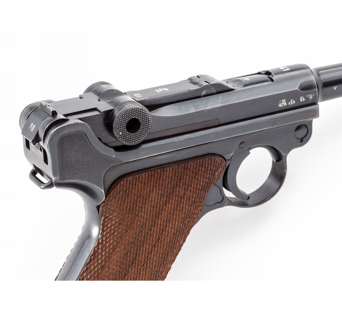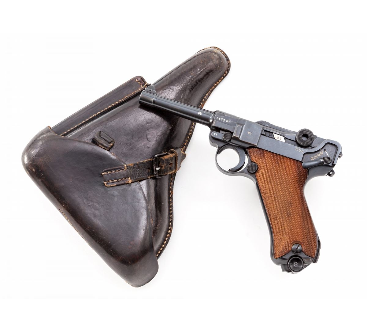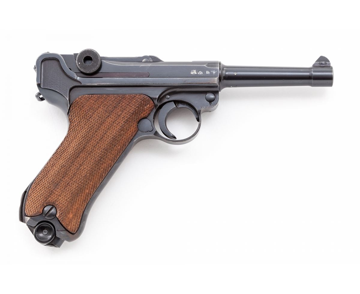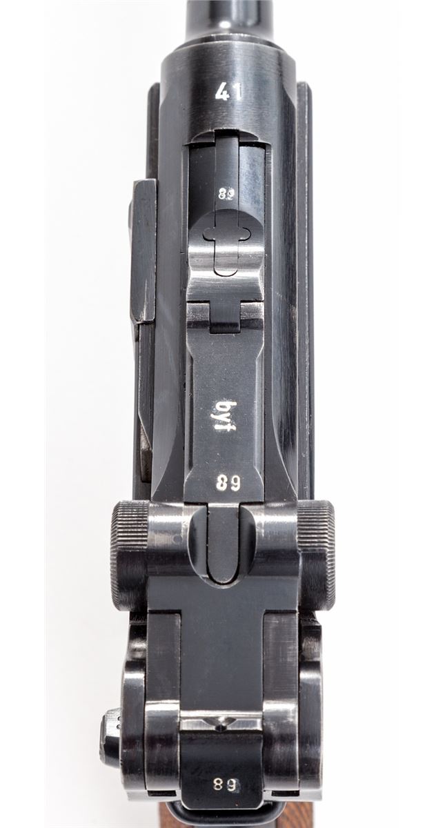 Mauser ''byf/Ku'' Luger, #5889y, 9mm, 4'' barrel, salt blue finish, factory checkered walnut grips, and one ''fxo'' blue-bodied magazine with black plastic base. Pistol features ''Ku'' suffix to left side of upper receiver's serial number, ''41'' dated chamber, ''byf'' to central toggle link, with standard ''Gesichert/Geladan'' safety and extractor markings. Pistol additionally features ''Ku'' test fire proofmarks and ''(stick eagle)/655'' Army acceptance markings. Complete in a 1941 dated black leather holster with nice bright stitching. These pistols are considered somewhat rare with approx. 2700 mfg'd, with this example falling just outside the known serial range. Condition is excellent retaining approx. 96%+ original blue finish. Crisp grips and action, bright bore. Holster is near excellent showing only light scuffs and minor crazing to leather. Est.: $2,500-$3,500. (C&R/PPT) (John Siroonian estate)