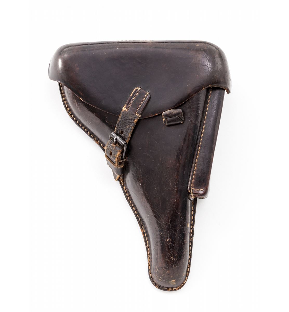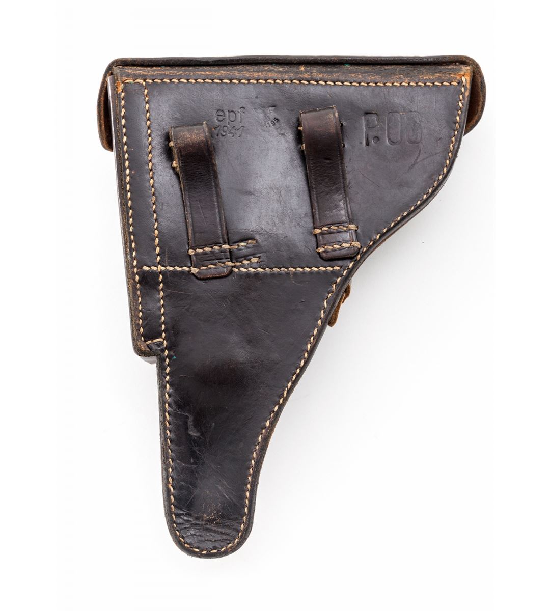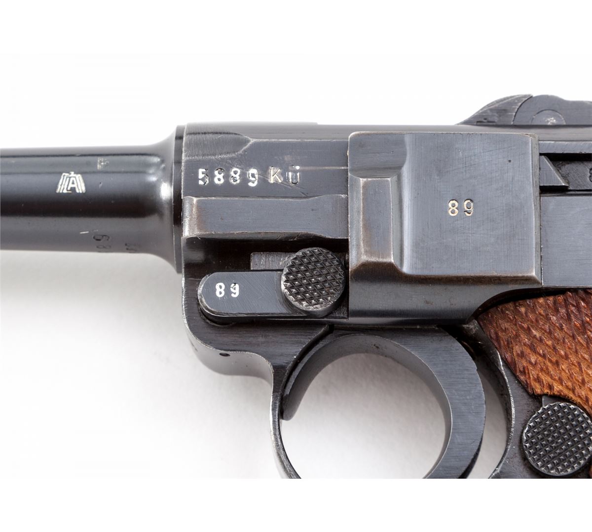 Mauser ''byf/Ku'' Luger, #5889y, 9mm, 4'' barrel, salt blue finish, factory checkered walnut grips, and one ''fxo'' blue-bodied magazine with black plastic base. Pistol features ''Ku'' suffix to left side of upper receiver's serial number, ''41'' dated chamber, ''byf'' to central toggle link, with standard ''Gesichert/Geladan'' safety and extractor markings. Pistol additionally features ''Ku'' test fire proofmarks and ''(stick eagle)/655'' Army acceptance markings. Complete in a 1941 dated black leather holster with nice bright stitching. These pistols are considered somewhat rare with approx. 2700 mfg'd, with this example falling just outside the known serial range. Condition is excellent retaining approx. 96%+ original blue finish. Crisp grips and action, bright bore. Holster is near excellent showing only light scuffs and minor crazing to leather. Est.: $2,500-$3,500. (C&R/PPT) (John Siroonian estate)
