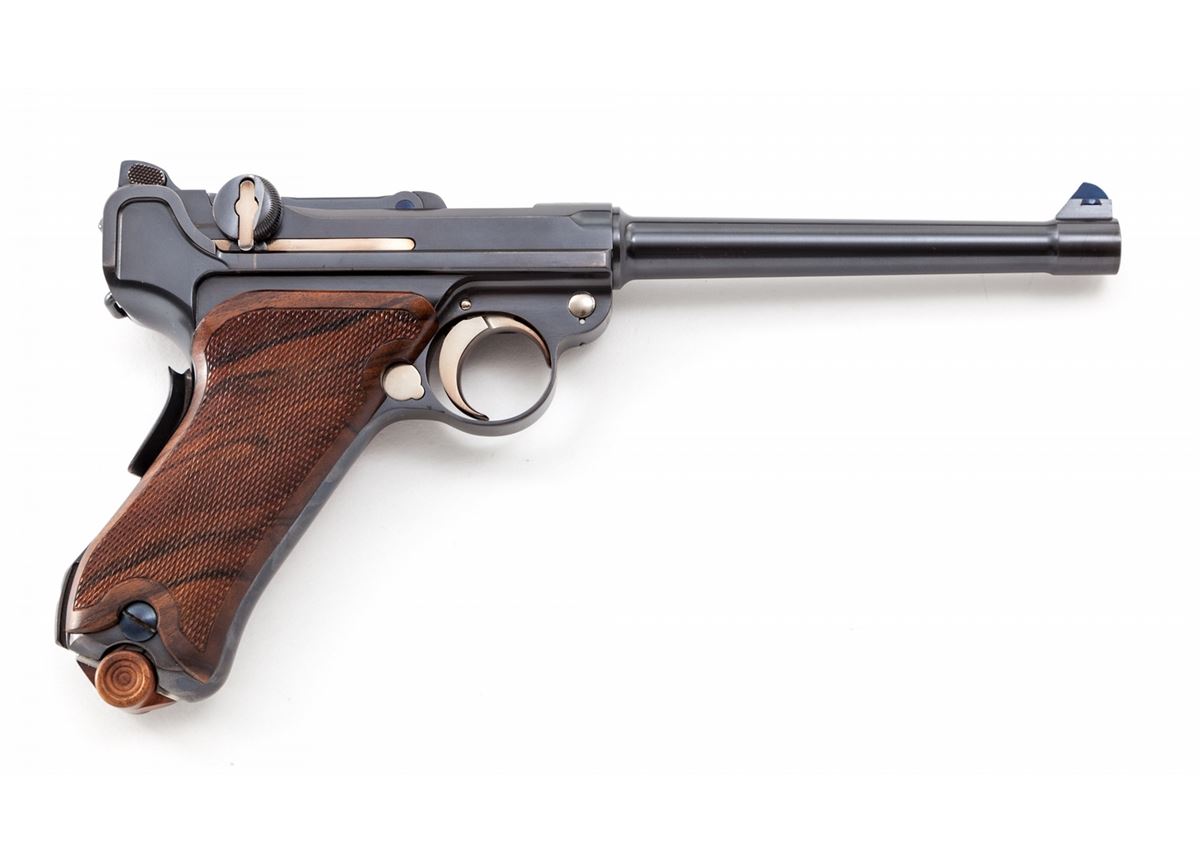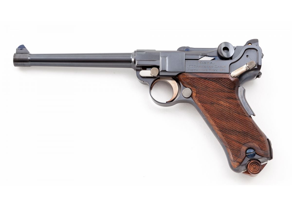 John Martz Prototype 1900 American Eagle Navy Luger, #18186, 9mm, 6'' barrel, rust blue finish with straw small parts, beautifully executed borderline checkered circasian walnut grip panels, and one bright magazine with similarly grained ringed walnut base. American eagle to chamber, DWM to toggle, and ''Germany'' stamped just beneath serial number to front of frame. Pistol additionally features grip safety, two-position rear sight, with left receiver sight marked ''Martz/1900 American Eagle/Prototype Navy No. 1''. John V. Martz is a well-known early modifier of Lugers who was active from the late 1960s thru the 1990s. He passed away in 2013. During his heyday, many of Martz's custom Lugers graced the covers of Guns magazine and are noted for their incredibly high quality, fit and finish. Condition is excellent with only the lightest possible marks from handling. Grips and action are crisp, bore is mirror bright, with matching takedown lever, and sideplate numbered 418 to bottom edge. Est.: $4,500-$6,000. (C&R/PPT) (John Siroonian estate)