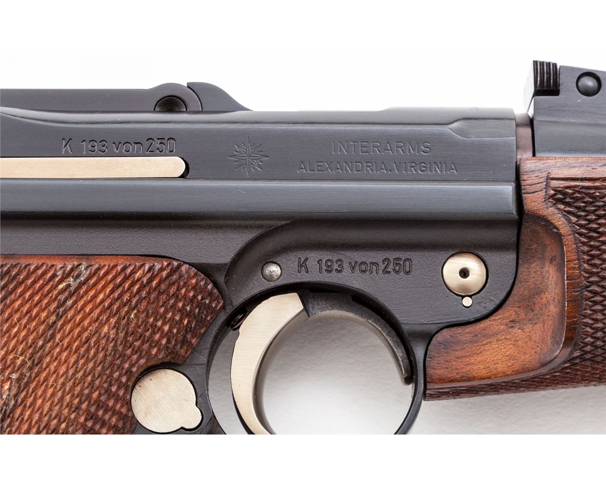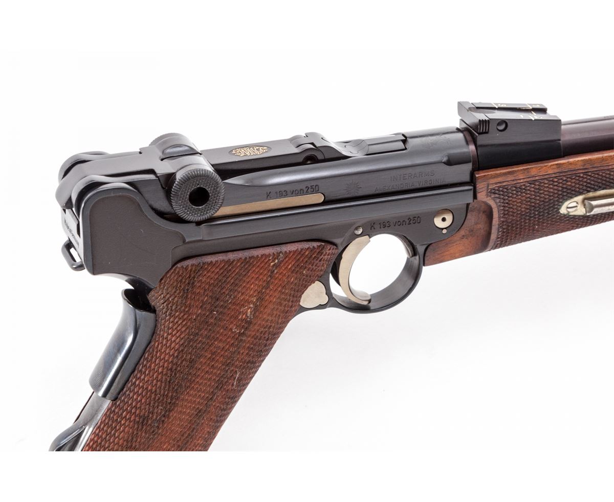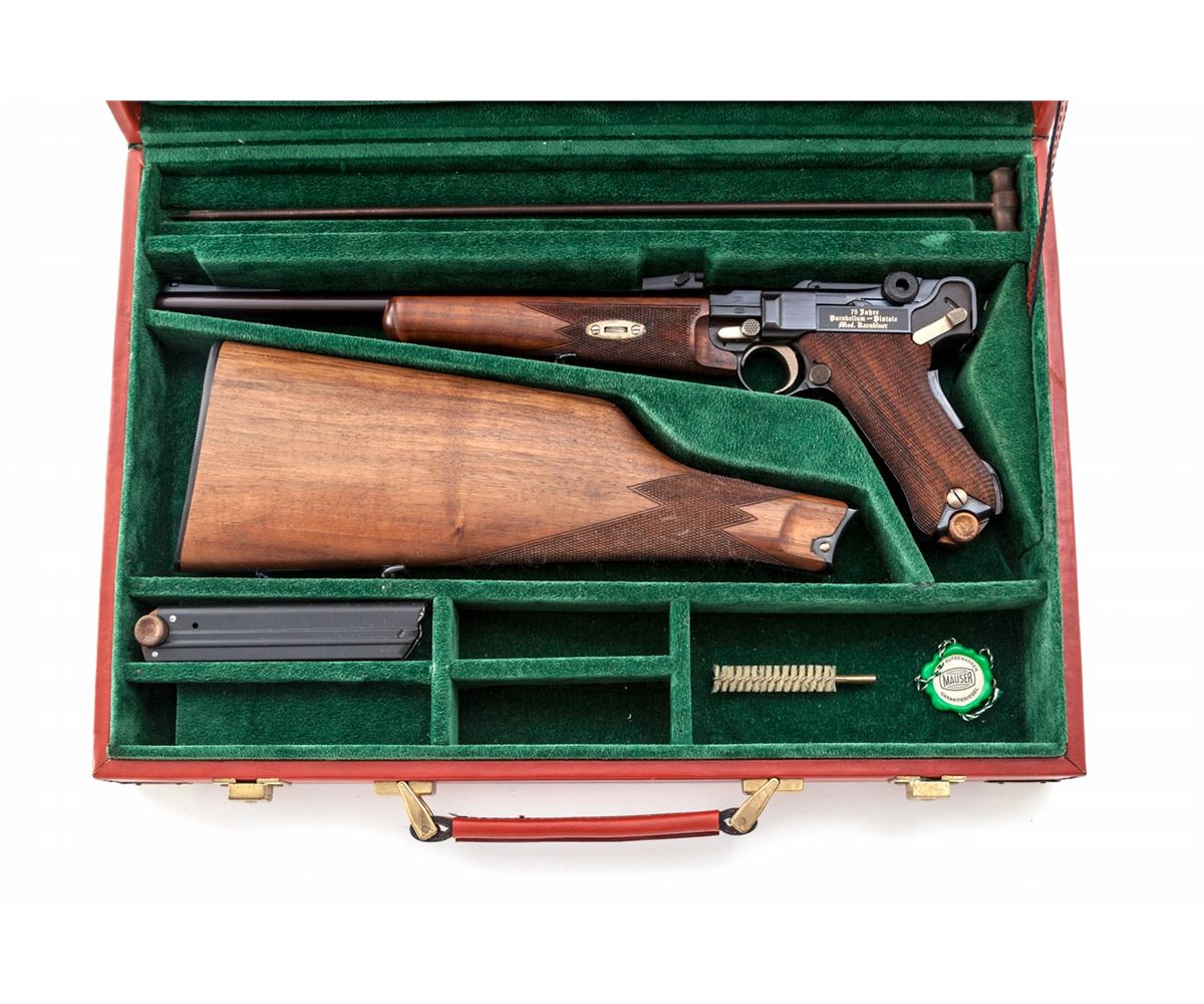 75th Year Commemorative Cased 1902 Luger Carbine, with stock, extra mag, cleaning rod, keys, hang tag, brush, instructions and test target, #K193 von 250 (193 out of 250 mfg'd), 9mm, 11-3/4'' barrel, blue finish and straw small parts, factory checkered walnut grips, forend and buttstock; and two factory blue-bodied wooden based magazines. Left frame flat marked in gold ''75 Jahre/Parabellum-Pistole/Mod. Karabiner'', top of chamber with Mauser family crest, DWM in gold to central toggle link, unmarked safety area, ''Geladen'' marked extractor, Interarms markings to right side of upper receiver. Condition is excellent, appearing as new and unfired, in original casing. Est.: $5,000-$7,500. (C&R/PPT) (John Siroonian estate)